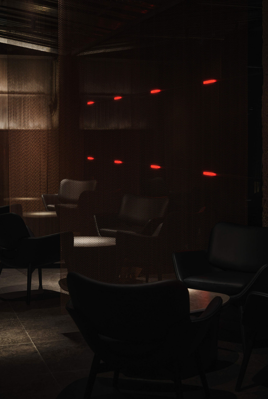 酒吧两侧划分卡座与散座,中部长桌与散座之间悬挂金属帘幕。轻盈的链幕在光下闪烁,既保持通透,又给予私密性,仿佛梦境中若隐若现的边界。
