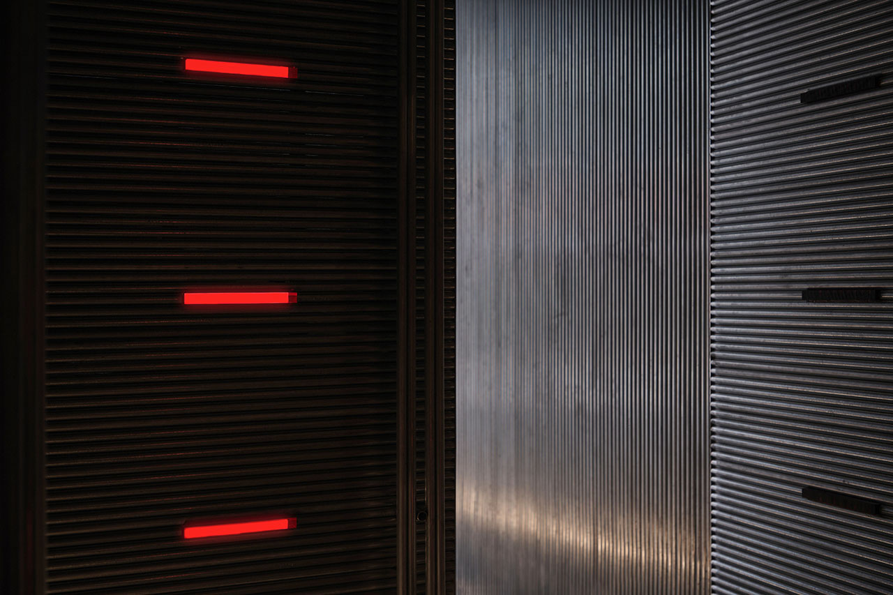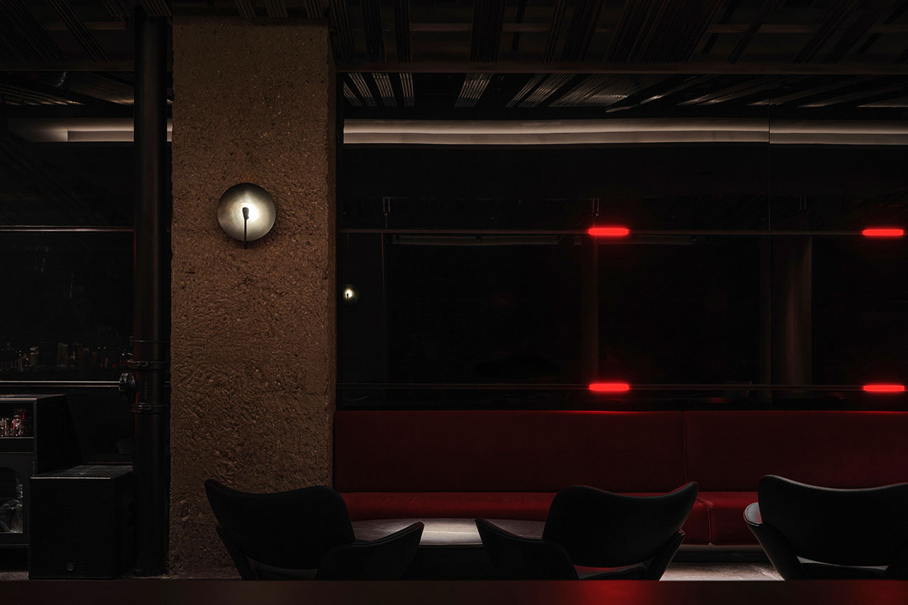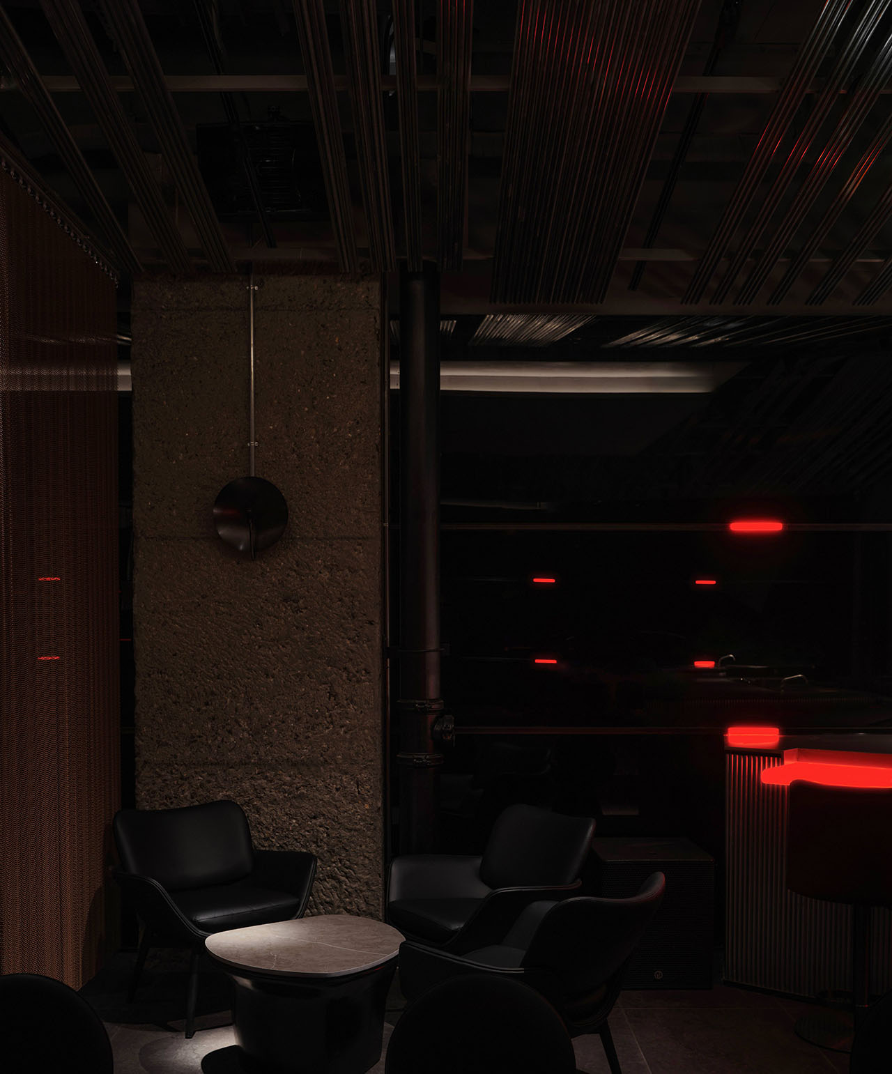 黑色岩石从室外延伸至室内,镀锌管材贯穿天花,线性秩序覆盖裸露结构,反射光影暧昧而游离。原始材质与数字影像的叠加,构筑出粗粝又未来的张力。