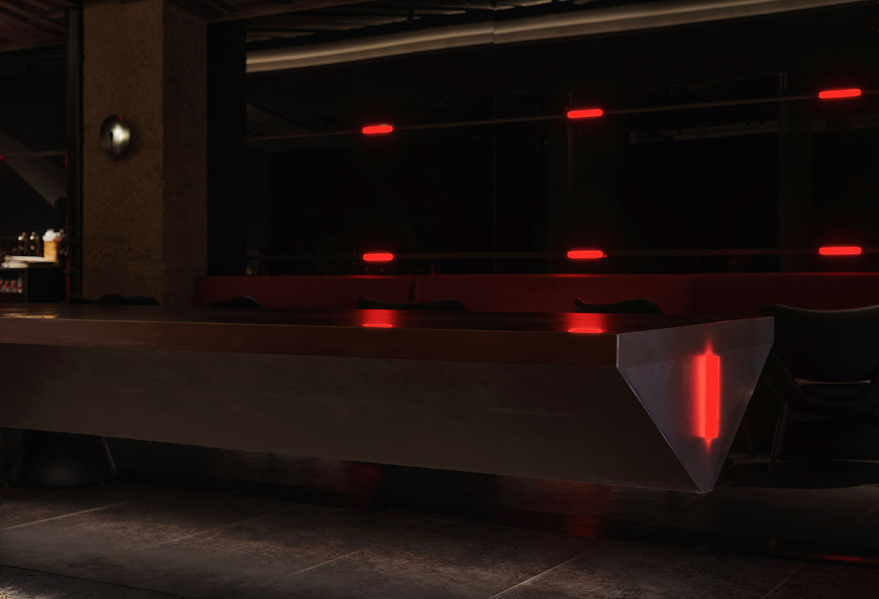 贯穿天花的三角几何体块则成为空间的视觉锚点。削薄的边缘与光带交织,如同切开空间的能量裂缝。静态时通过灯光洗照呈现出强烈的立体感,使空间在现实与幻象之间自由切换。