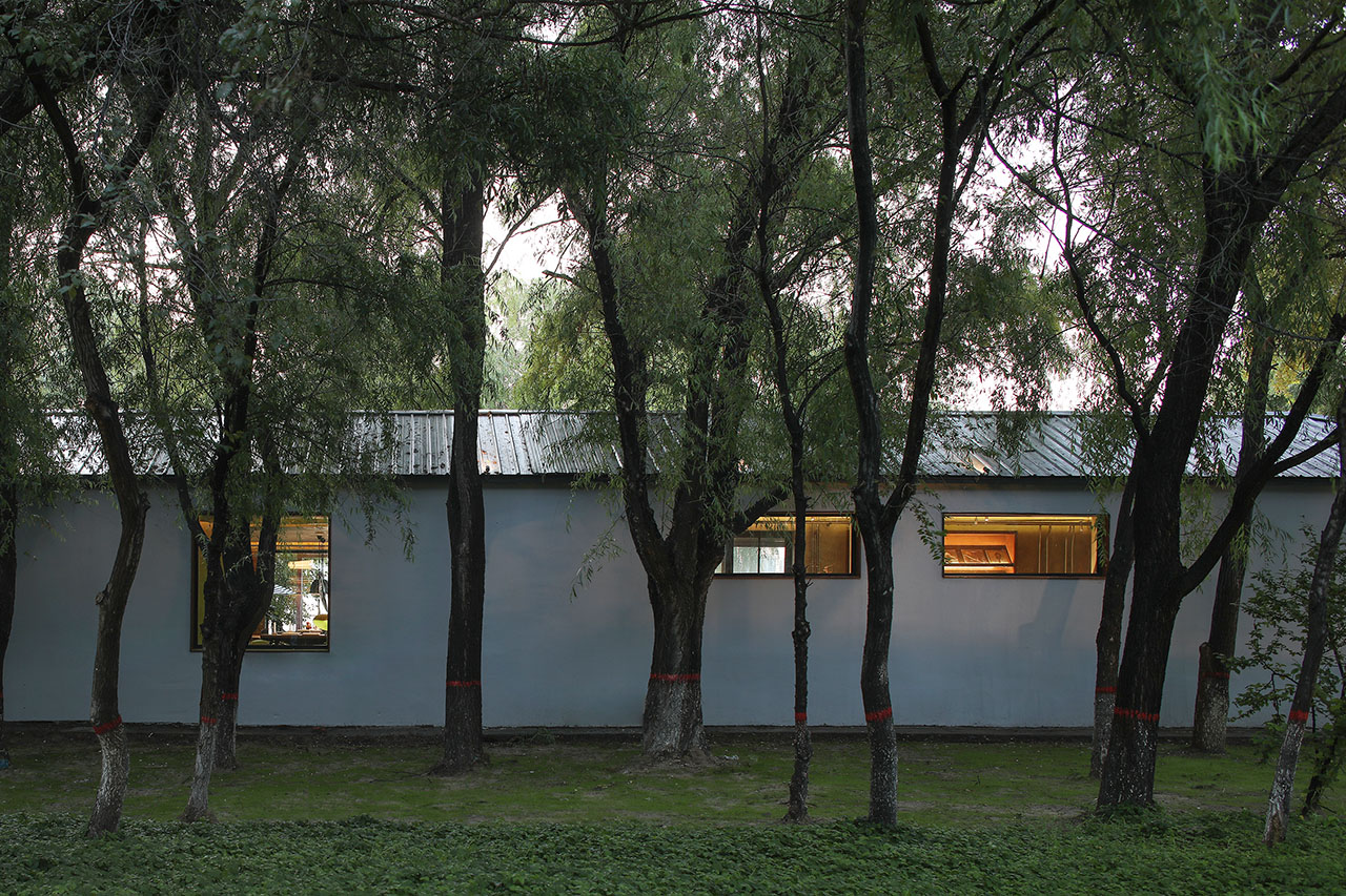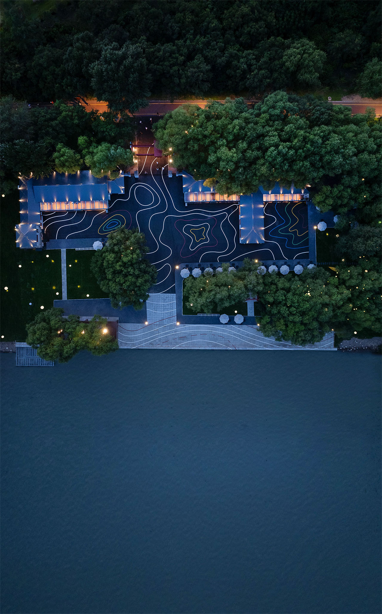 改造过程中,通过“轻介入”的策略,设计尽可能保留建筑原有的低矮形态,使其与湖岸的尺度和氛围保持共生。地面引入彩色涂鸦,以平面介入的方式增强场地的艺术属性和视觉层次。整体以水泥灰为基调,让建筑在环境中退让,由绿意自然地包裹,并向湖水方向延伸,形成环境与建筑之间的柔和过渡。