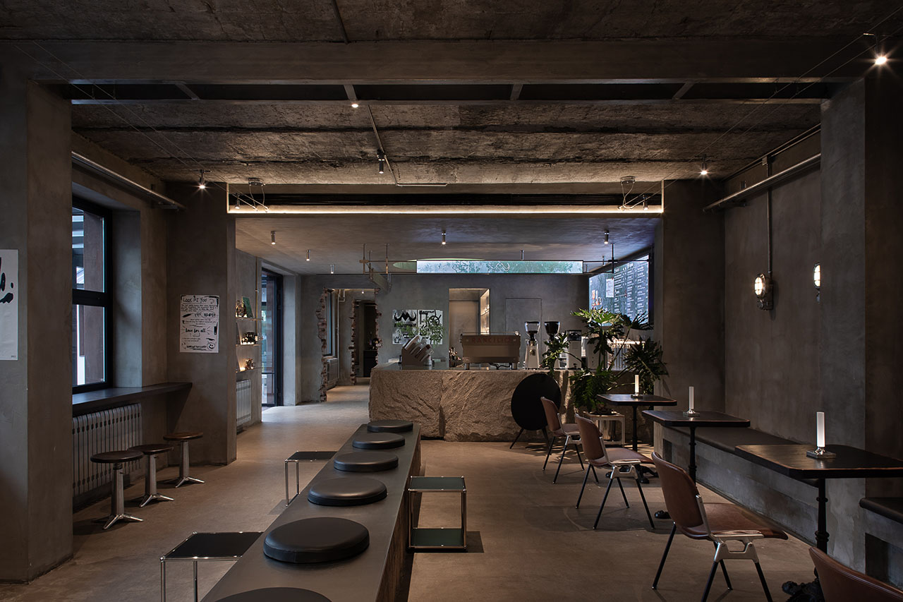 在设计过程中,原始工业结构得以充分保留并转化为场景叙事的核心元素。裸露的内部结构,水泥质感墙面以及原有暖气片与管道经银色喷漆处理,软装选择在延续粗犷工业基调的同时,赋予其统一的当代视觉语言。