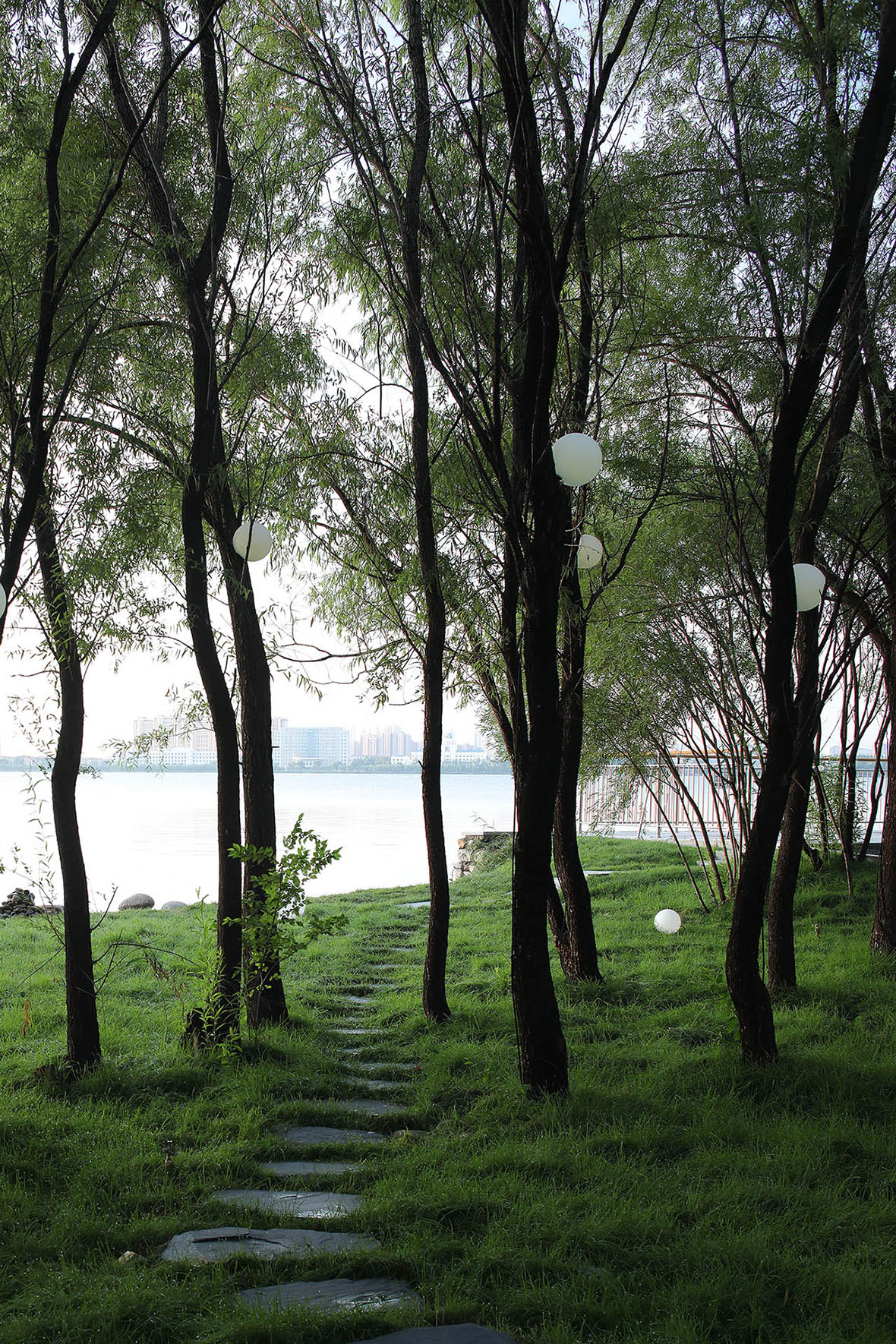 外围原本杂乱的植被经梳理与重塑,保留了部分具有阵列感与良好形态的植株,其余则修整为开阔的草坪。由此,建立起场地与湖面之间的视觉通廊。林间设置了独立片区的灯光变幻,在保持自然基调的同时,增强夜间互动体验。草坪作为留白区域,具备高度的功能适应性,既与湖景形成连贯对话,也具备持续运营和艺术更新的可能性。