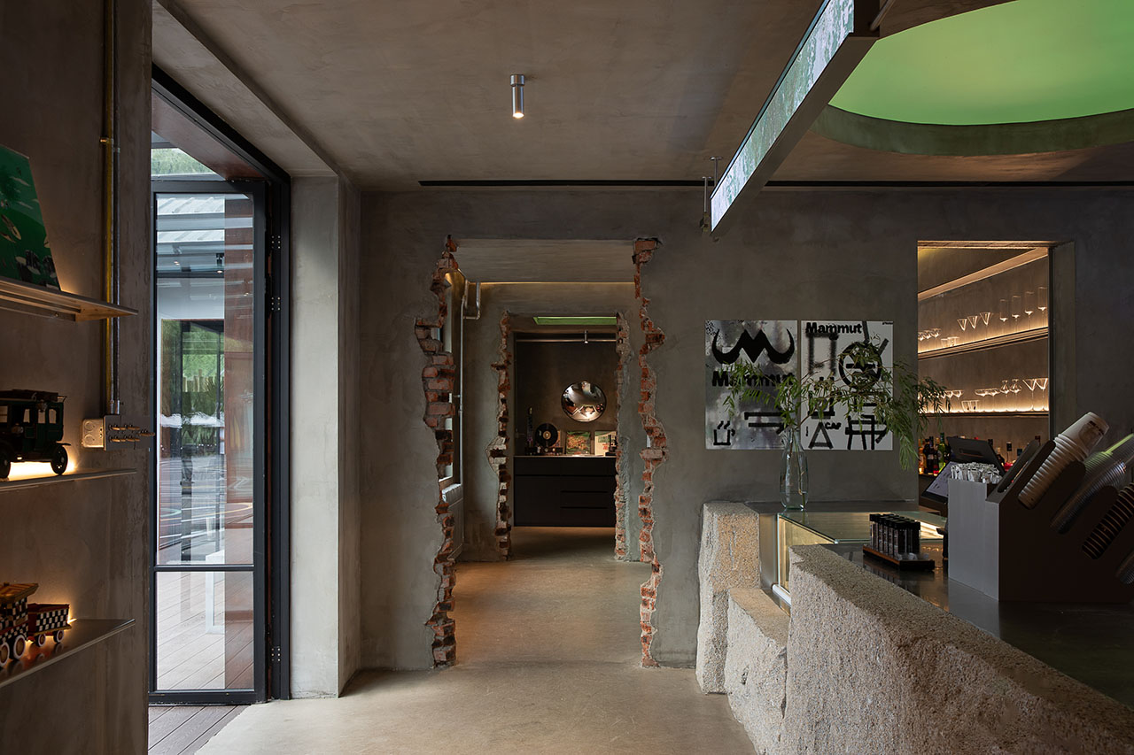 现场原有的红砖墙被保留并裸露呈现,借助材质本身的肌理与历史感,传递出场地的原始叙事。砖墙与金属的并置形成粗犷与精致的视觉碰撞,在对比中强化了空间的张力与记忆点。