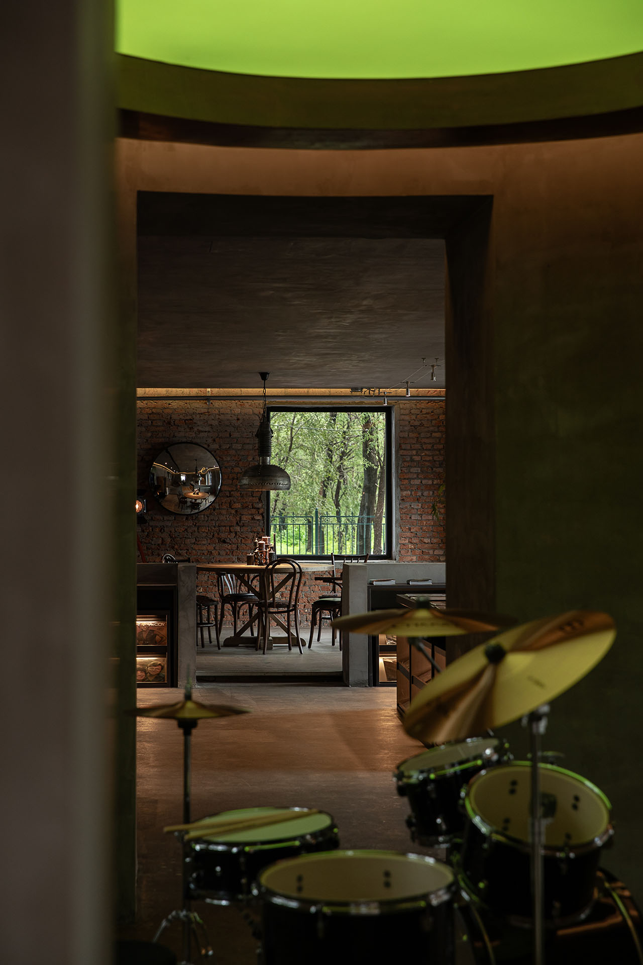 在另一栋建筑里,设计延续了充满未来感的可变色光影,增强空间的戏剧性。灯光下放置的架子鼓,不仅是一个功能乐器,更如同一处即兴舞台的象征,邀请人们在此释放创造力与情绪,仿佛随时可开启一场不受拘束的表演。这不仅满足了年轻人对互动和新鲜感的需求,也为场域带来持续的话题性。