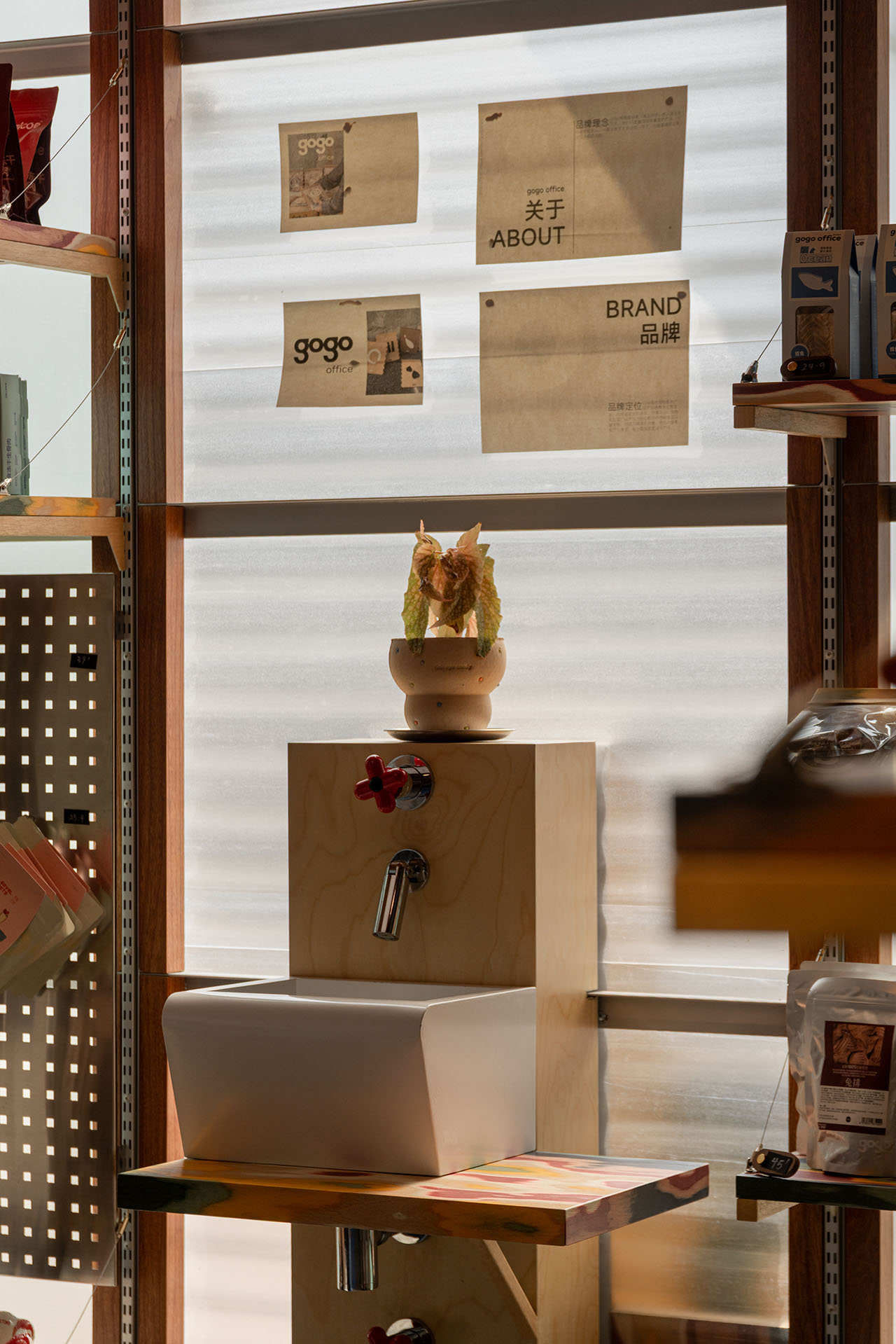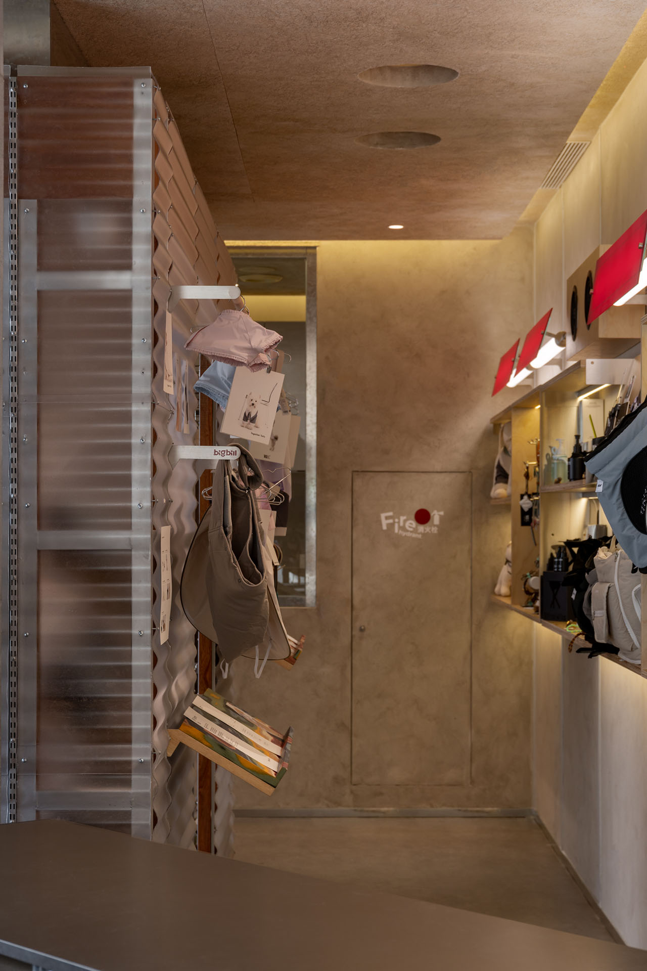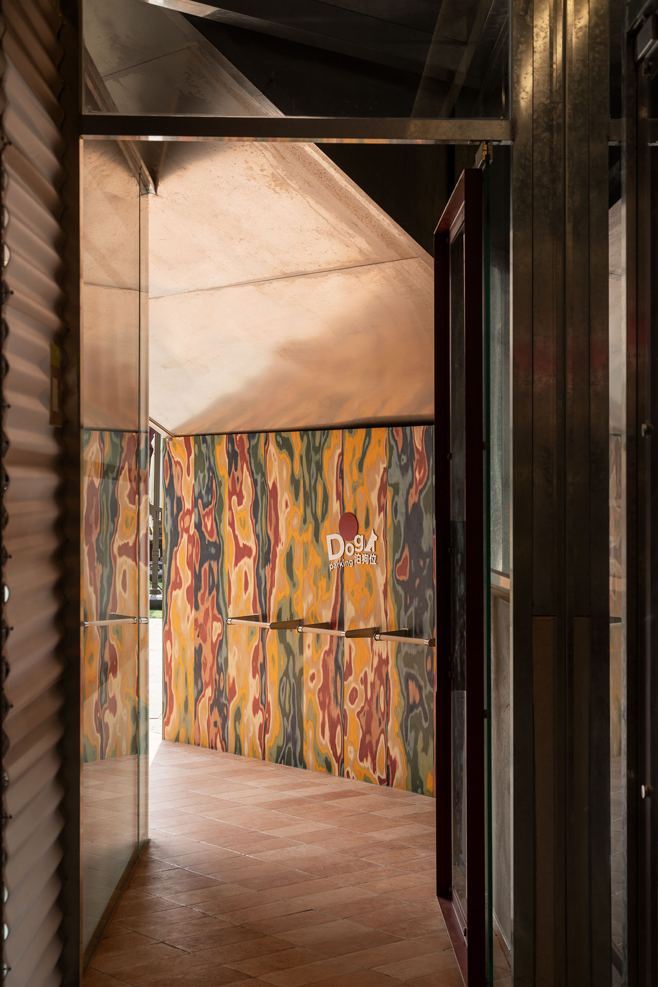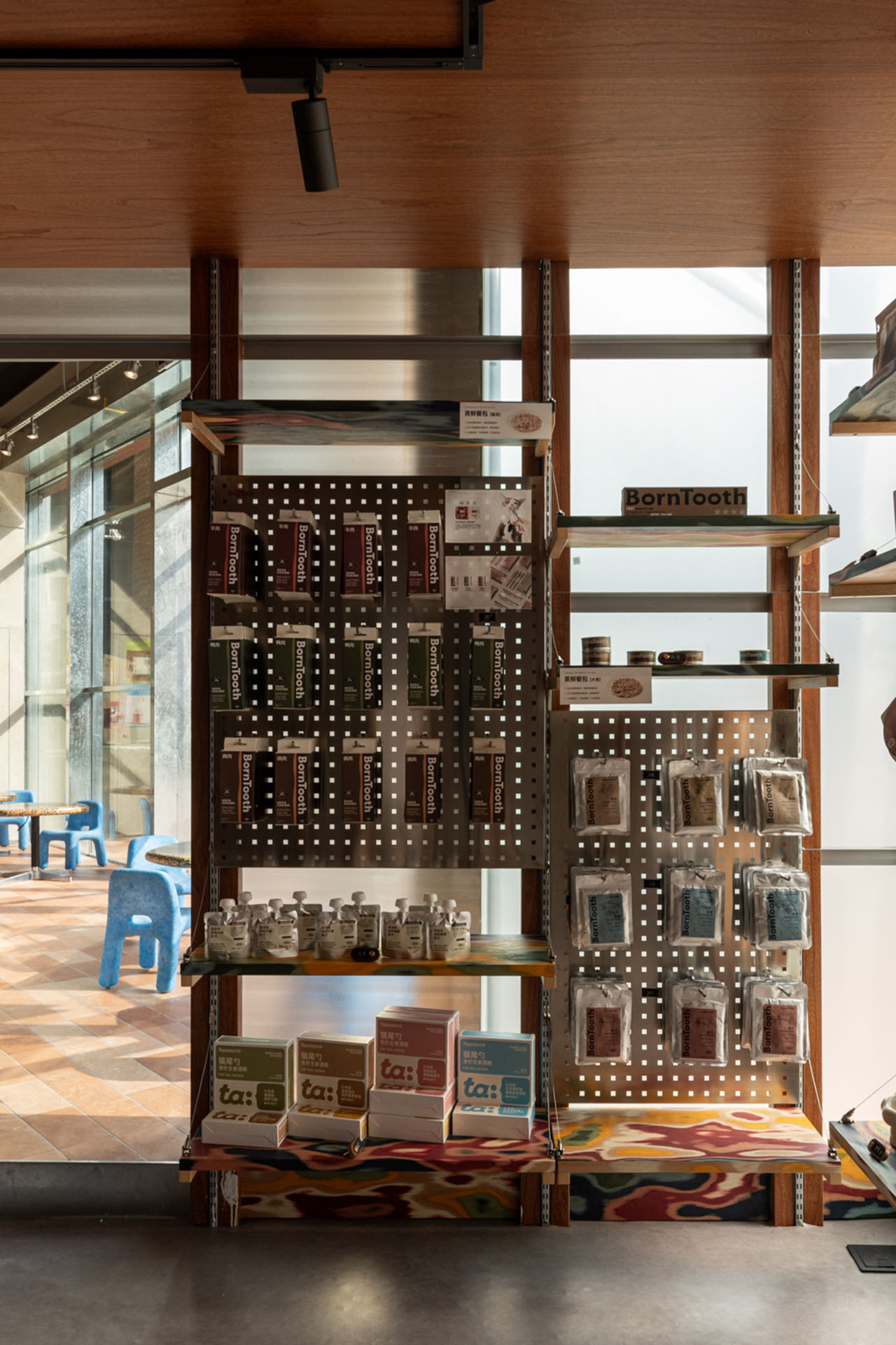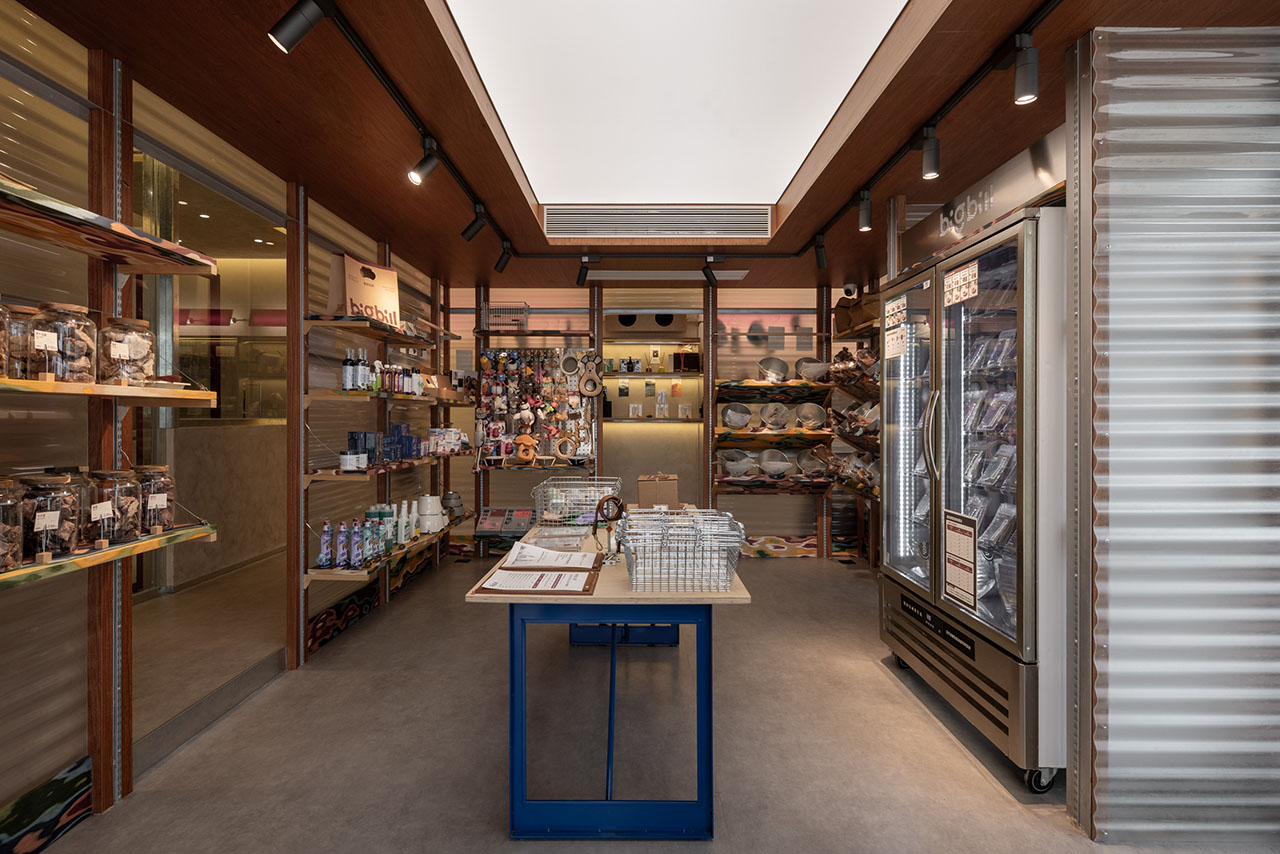 建构的方盒子,有着四个立面、且立面的里侧和外侧均可使用,作为宠物零售区再合适不过,最里侧的区域则留给宠物洗护SPA。