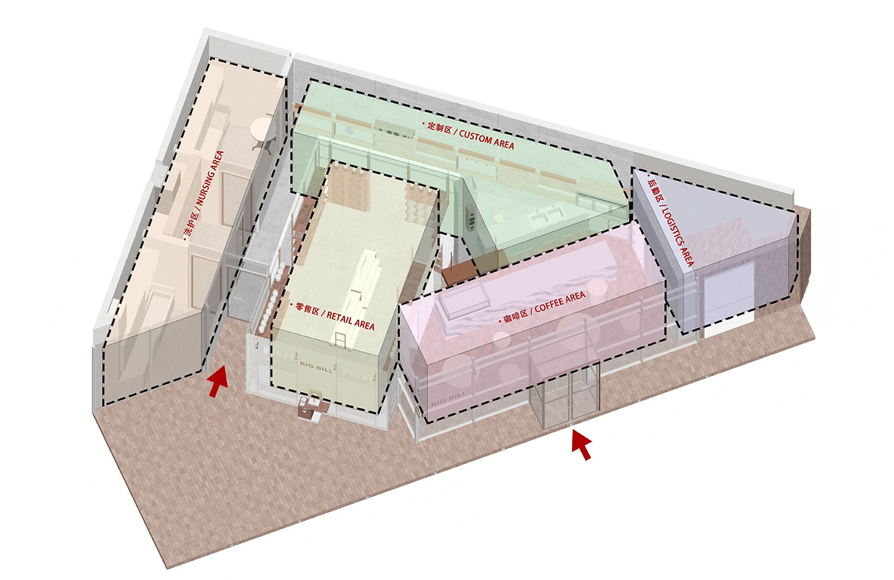 BIG BILLl打造的“人宠物社交平台”,对功能的诉求主要有三方面:休闲社交、宠物用品零售区和宠物沐浴SPA区。对三块功能区的规划,最大的挑战便是场地不规则形状带来的空间尺度、锐角的不适,以及转折的自然度。