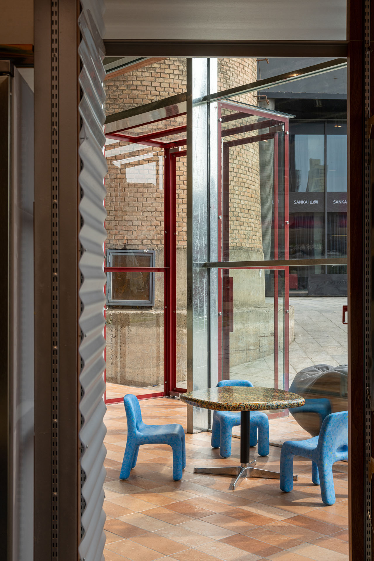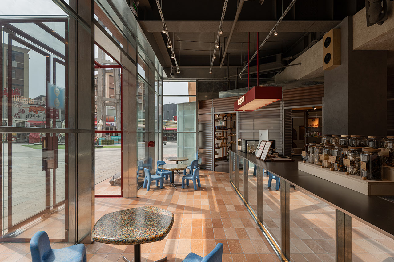 呼应红砖砌筑的烟囱,在外立面的设计上,选择陶土红砖拼装出门头,外延的地台则使用磨砂面红砖铺装,通过材质的协调,建筑空间与烟囱之间,消解了原本的割裂感和压迫感,产生“亲近”的链接。