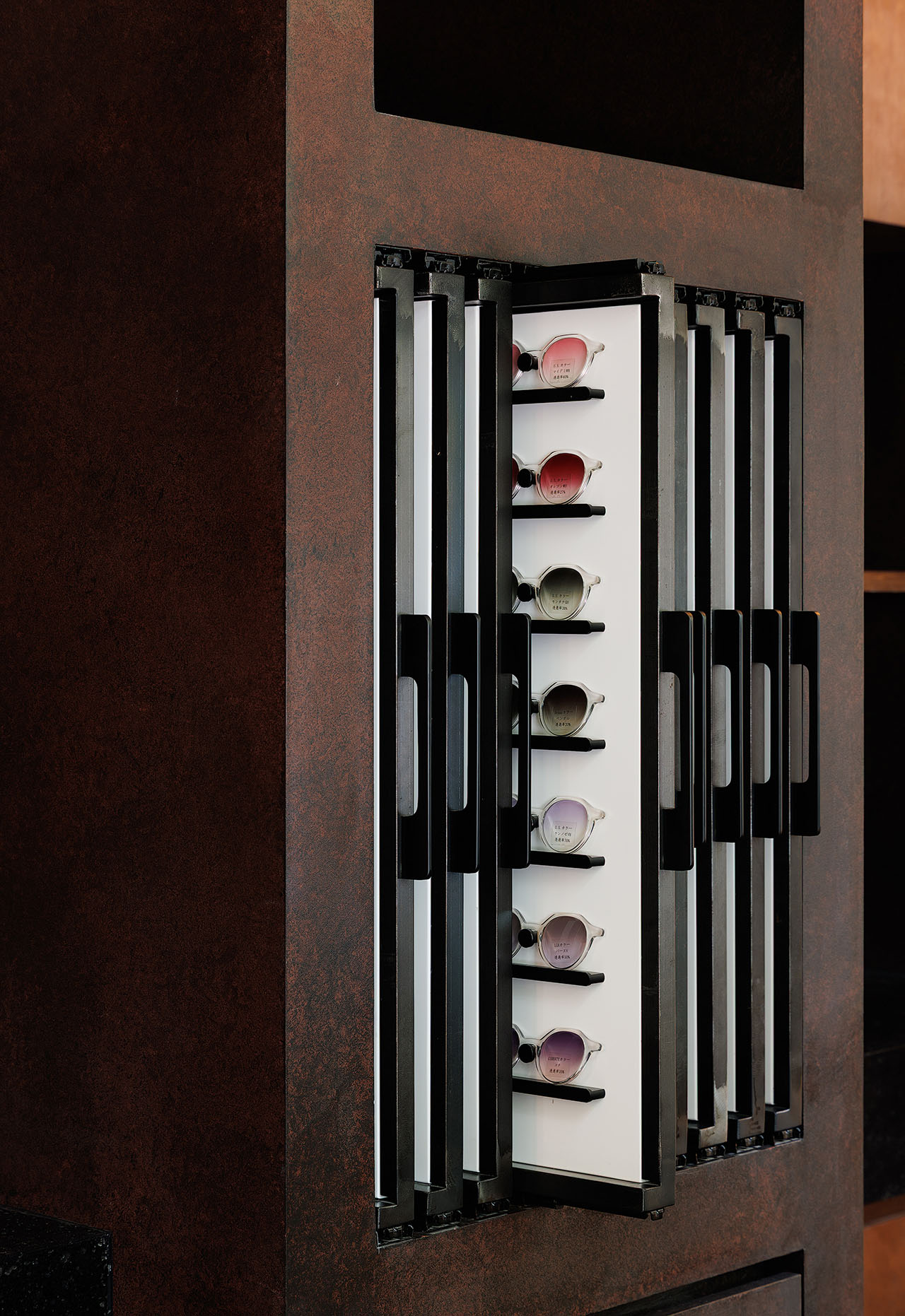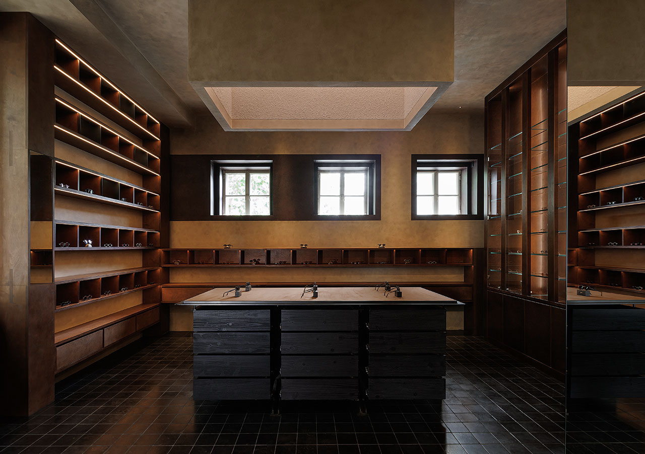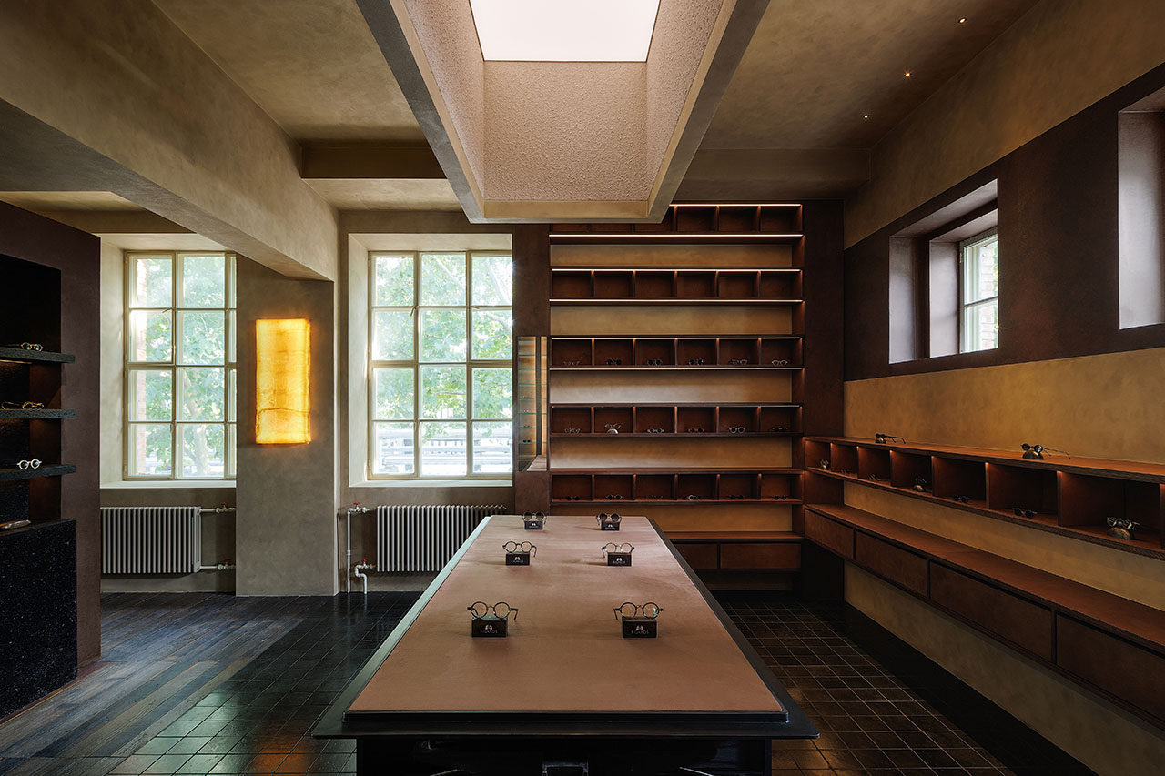 光成为空间中最具流动性的材质。自然光透过钢窗洒入,在室内空间映刻出随时间变化的光影戏剧;定制灯光系统以精准的角度勾勒展陈区域,使每一副眼镜如同博物馆中的展品。铜板柜体在光照下折射出暖调微光,桦木材质在漫射光中凸显温润质感——光不仅满足功能需求,更成为划分空间情绪的工具,在冷峻与柔寂之间建立平衡。