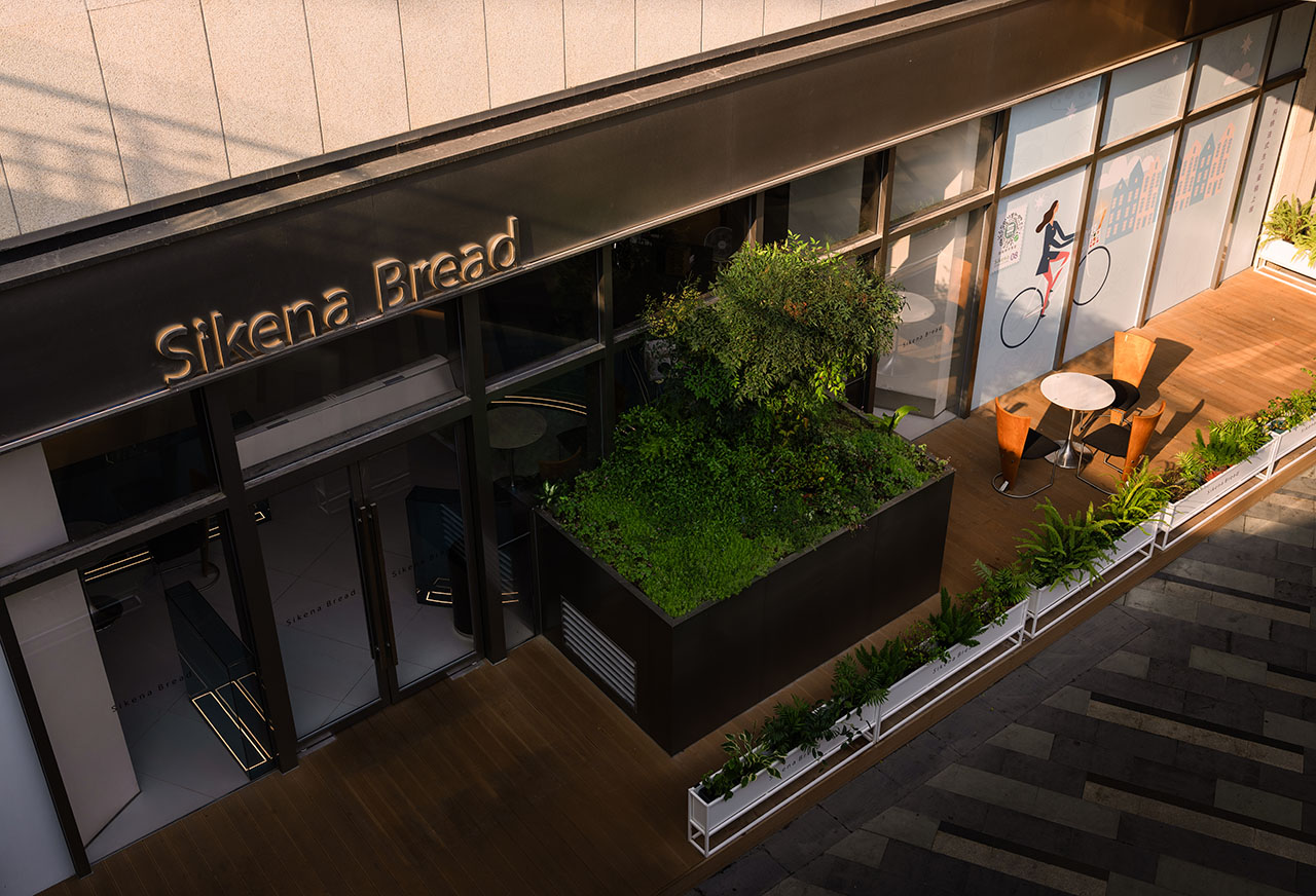 根植建筑斜面特点,于室外设客座区。先用简约线条勾勒种植区的占地轮廓,划分室内、室外客座区与街道的界限。再铺设原木色地板,为就餐场景烘托暖感,加深顾客对面包的多维印象。阳光透过绿叶洒在桌面,面包浓香随风散开,和鸣着日出的宁静。