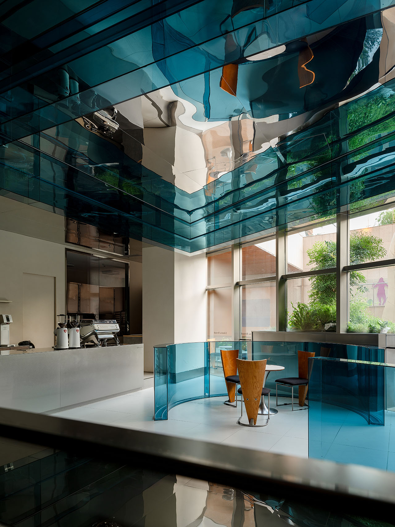将镜面材质插入公区顶面,向上无限延伸几何形态与环境细节,瞬间放大了空间的纵深感。光影在镜面与空间之间交织出多重反射,让客座区“悬浮”起来,窗外绿意则透过玻璃闯入,映在镜面中,与室内的蓝调、橙调共述生命力。