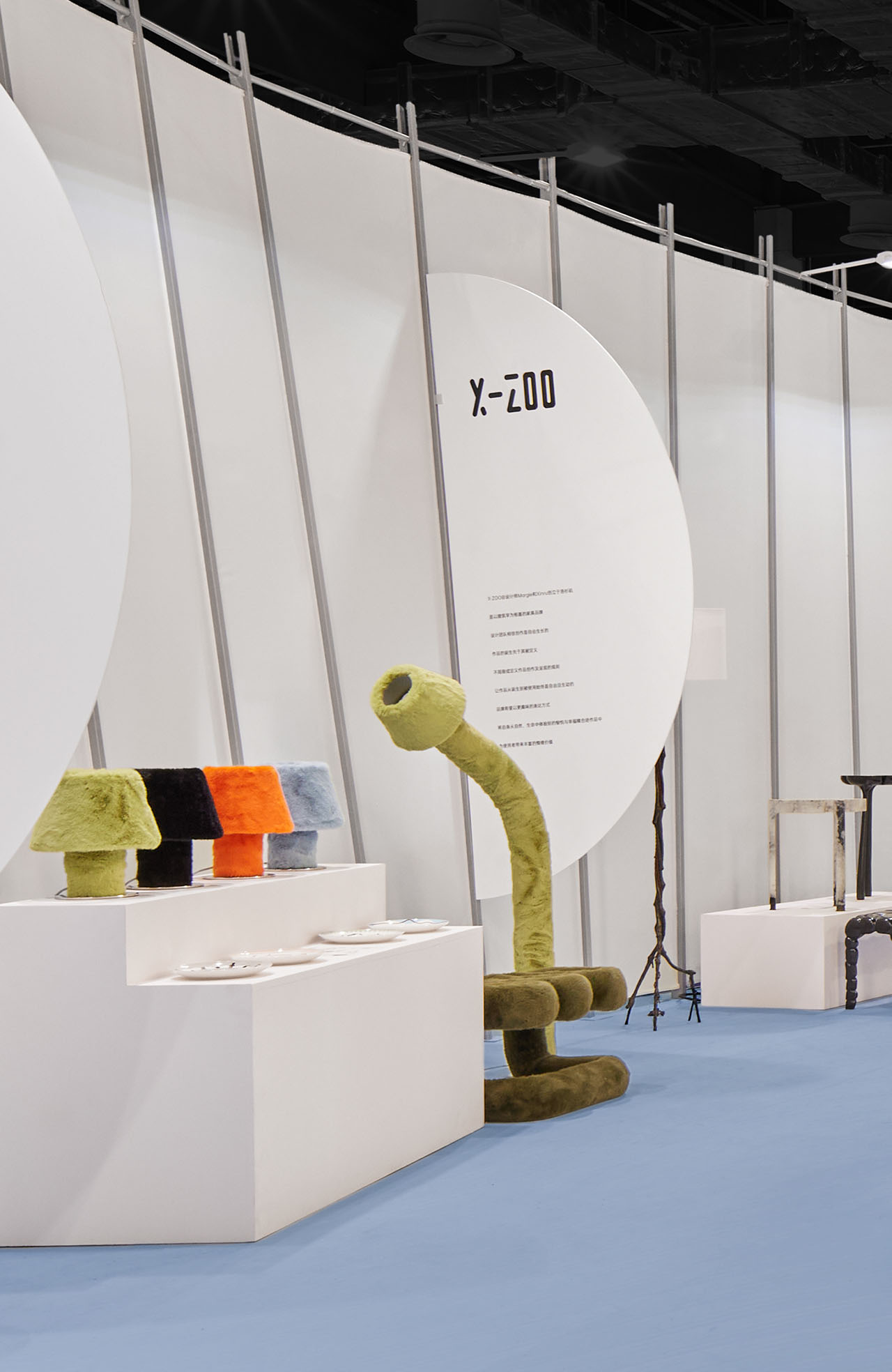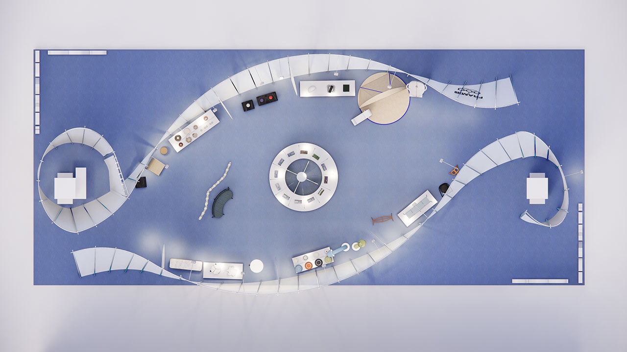 这五个维度如同交织的叙事线索,在环形展区内构建出完整的设计图景。空间中的感官体验经过精心设计:光影微妙变化,引导着观展情绪;可回收金属与再生布料的质感对比,展现出可持续材料的丰富表现力。每个展品既保持独立的叙事空间,又与其他作品形成对话,而刻意设置的"感知停顿点"则让观众得以驻足沉思,建立更深层次的连接。