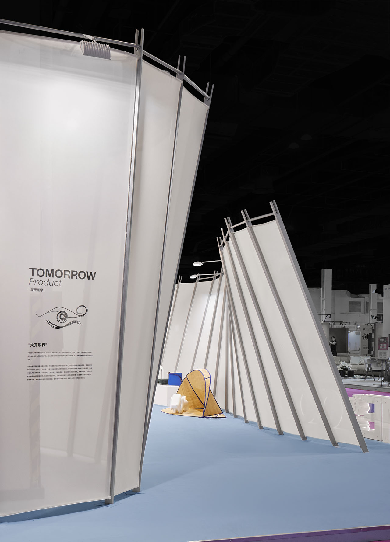 展厅中央的"设计之眼"装置以其震撼的尺度成为空间的焦点。这个极具象征意义的装置实则是一个精心设计的可持续系统:异形骨架采用预制编号结构,每个构件都可拆卸重组,为未来展览提供完整的再利用可能。覆盖其上的微透光布料不仅营造出朦胧的视觉层次,让观众得以窥见内部展品的轮廓,其本身也是可重复使用的环保材料,可根据不同展览主题进行重新定制。