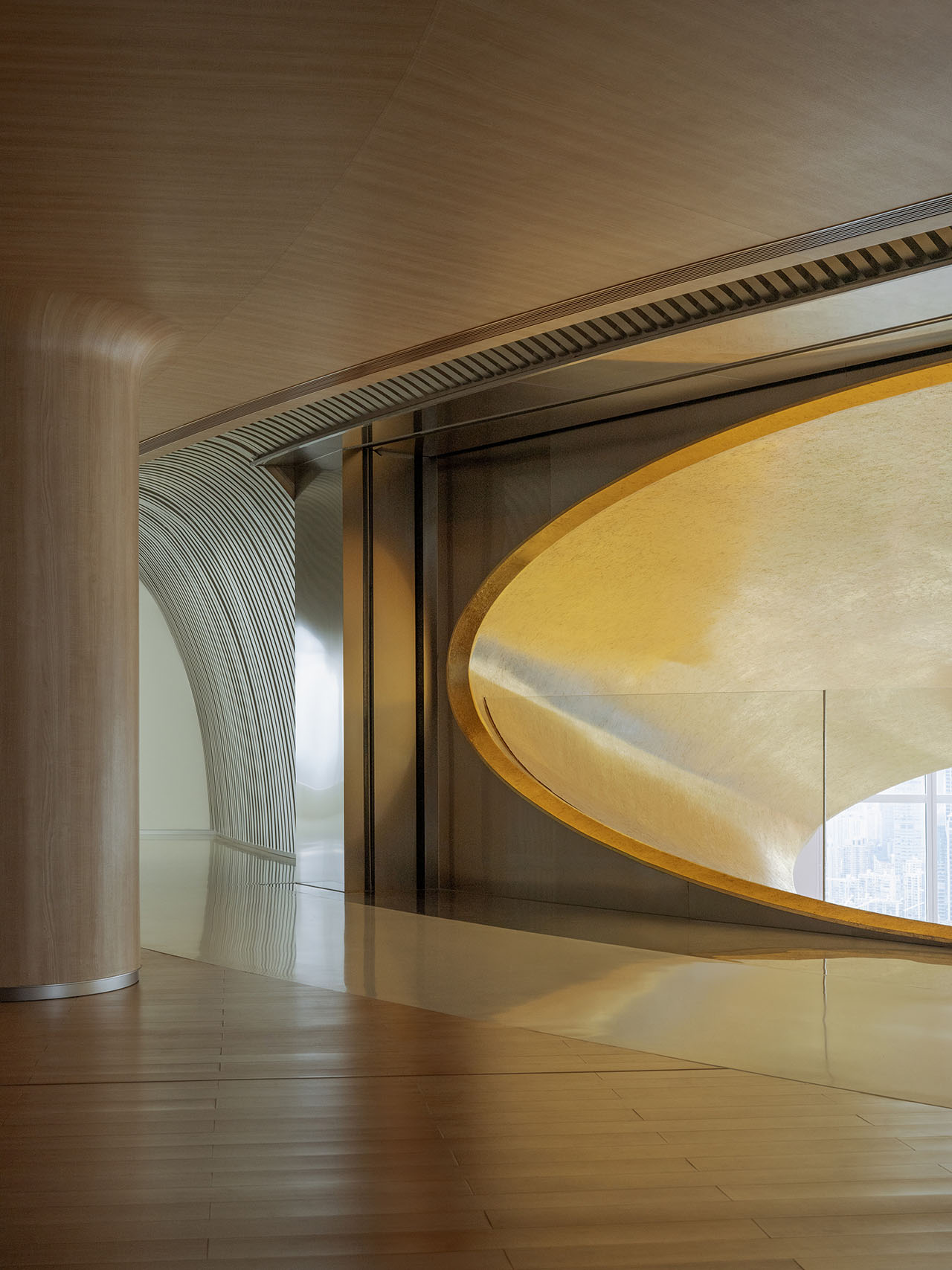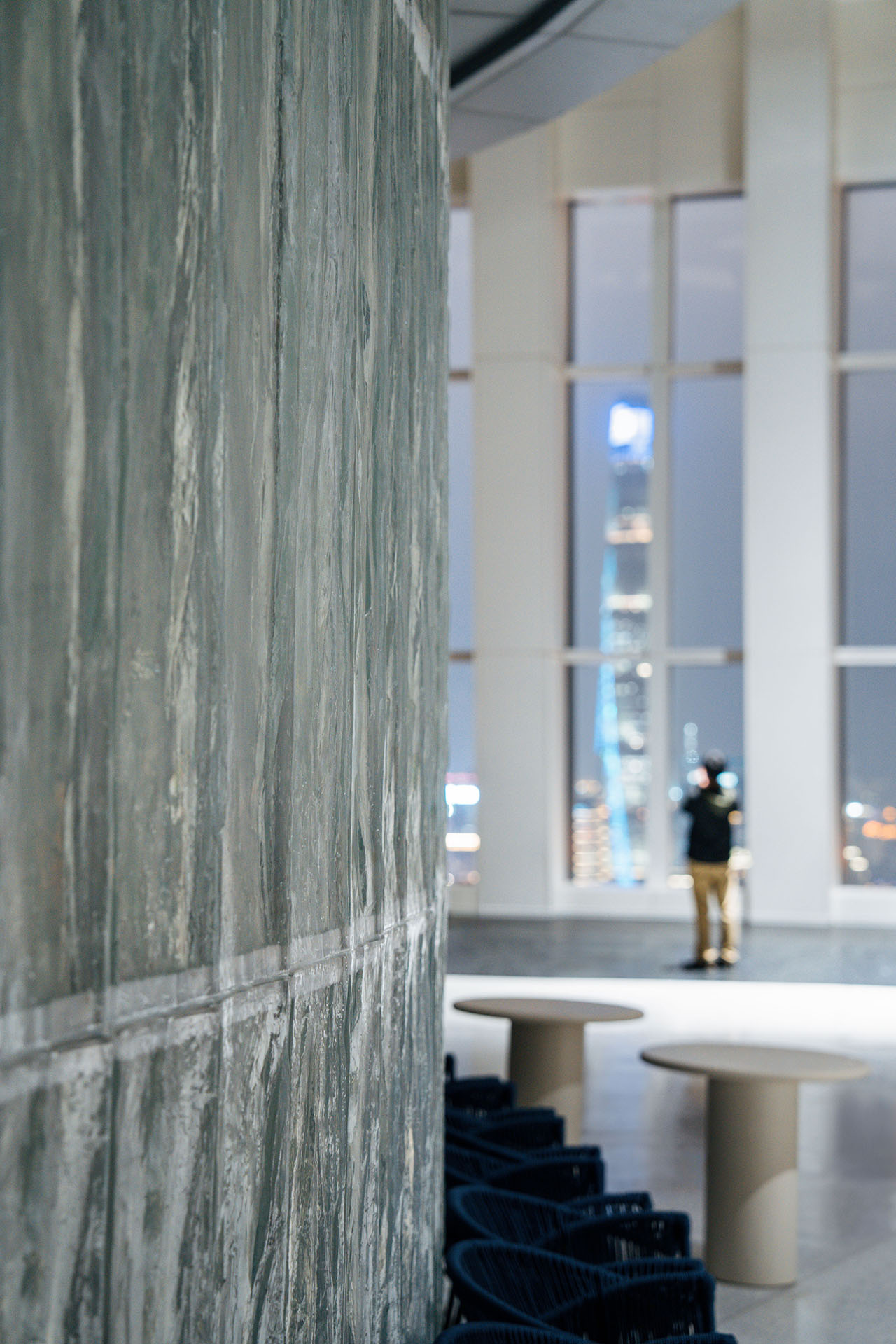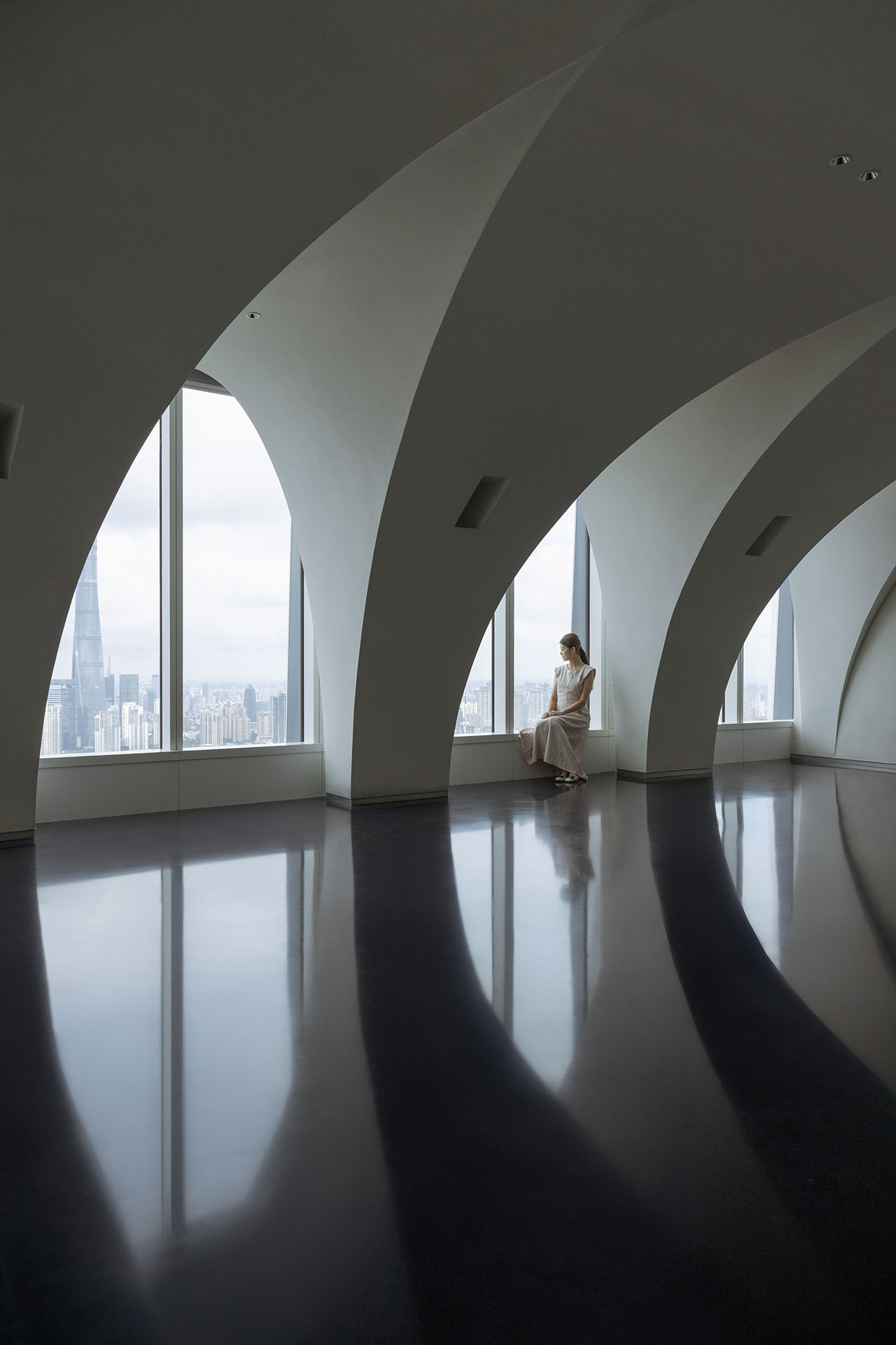 我自己最喜欢56层的休息厅。连续的拱廊在立面剪出了一道新的城市图景,上海如水晶般在拱门后闪闪发光。我站在黑色但发亮的地坪上会暂时空白,这个空间因为这个空白而具有了一种即时的神圣性。