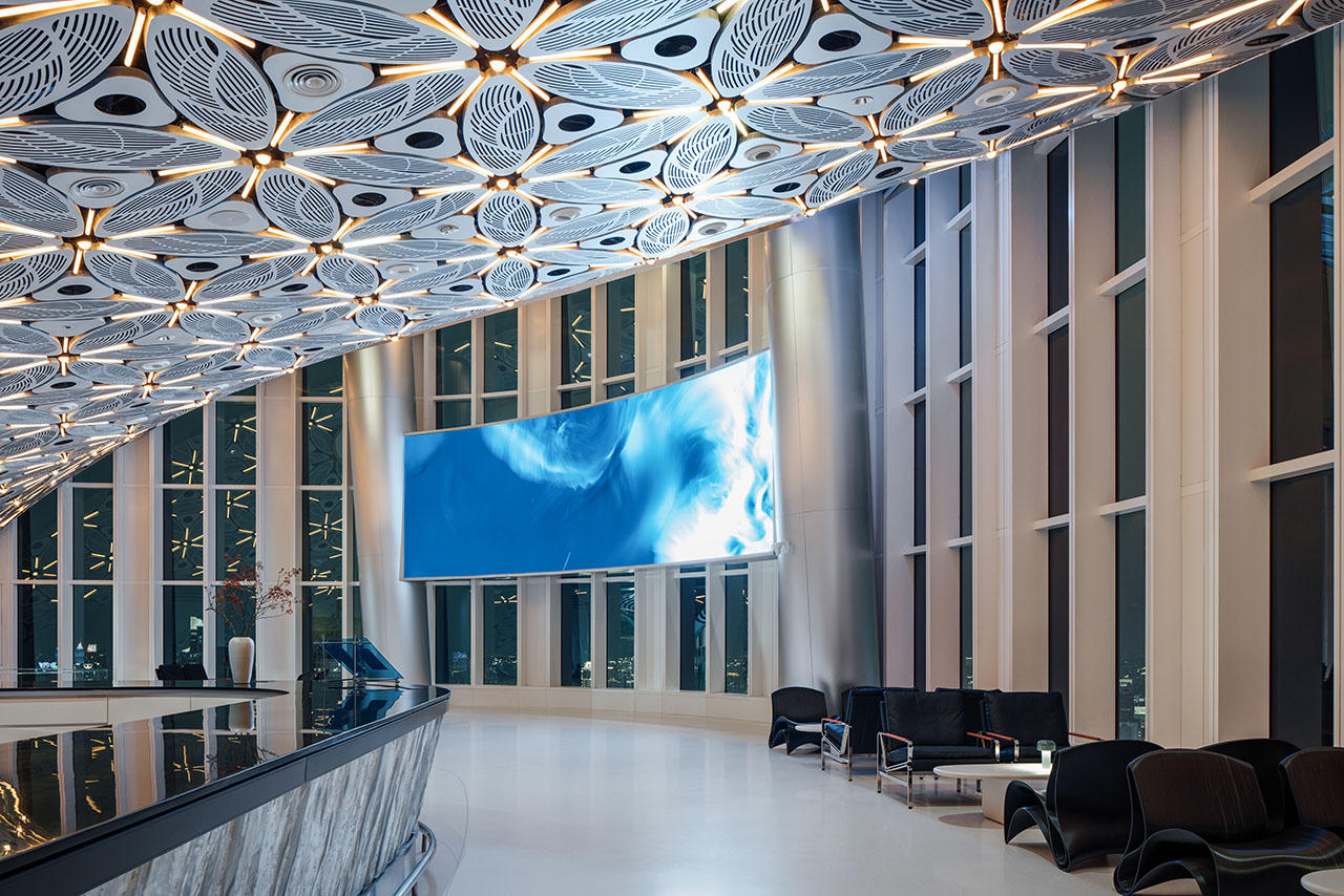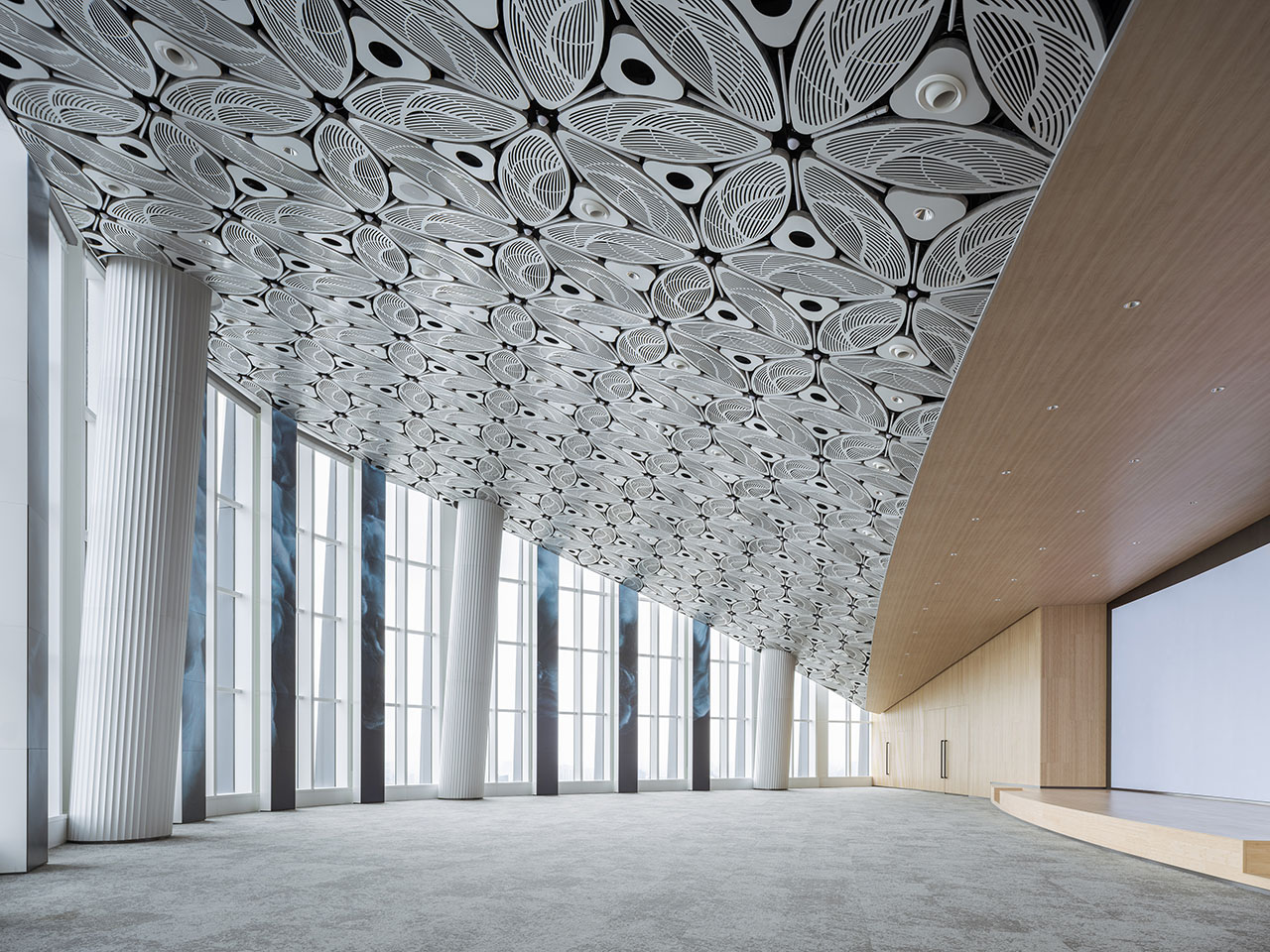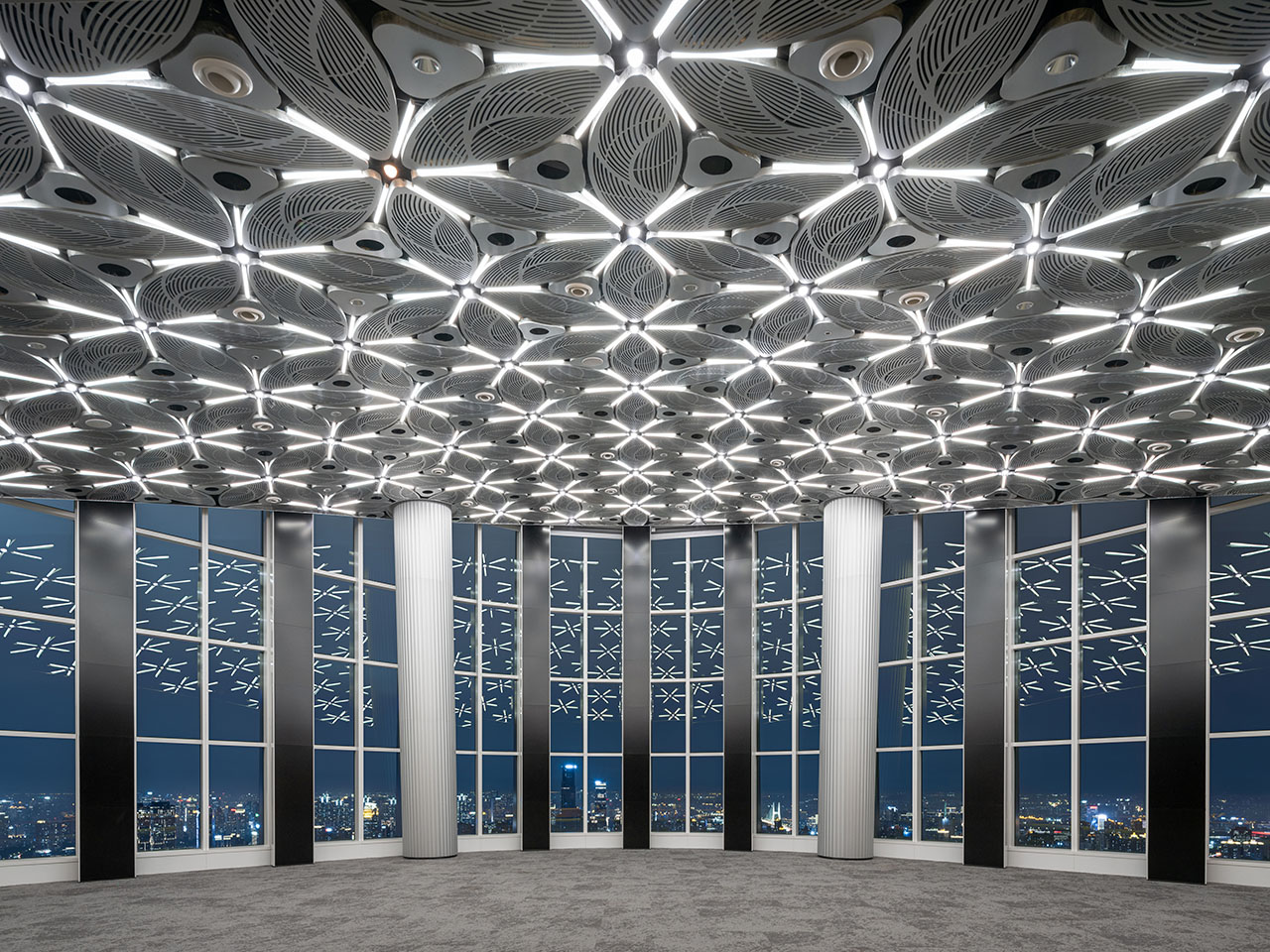 55层具有两层通高的观光咖啡厅和大会议室。采用56层的白色拱顶不仅单调,而且更为复杂的音箱、广播、摄像头、消防喷淋、烟感、灯具以及风口也会破坏连续拱顶的纯粹。我突然有了一个大胆的想法,我为什么不用计算机技术把这些大大小小的洞口和设备整合在一个完整的花纹里面呢?由冰联系到雪花,最后以六瓣雪花的造型为基础形成了1100块草叶穿孔纹阳极氧化铝板,把所有设备组织成连续巨大的天花板花纹。