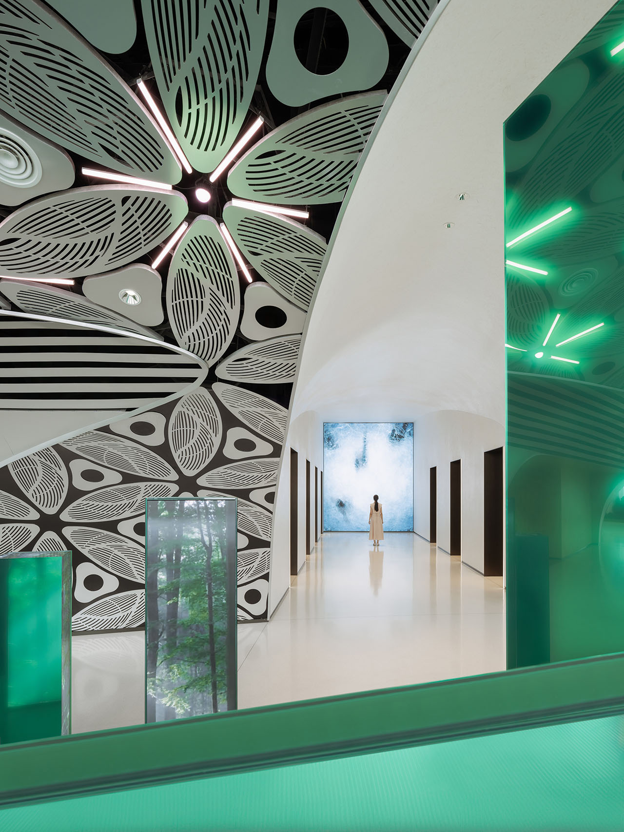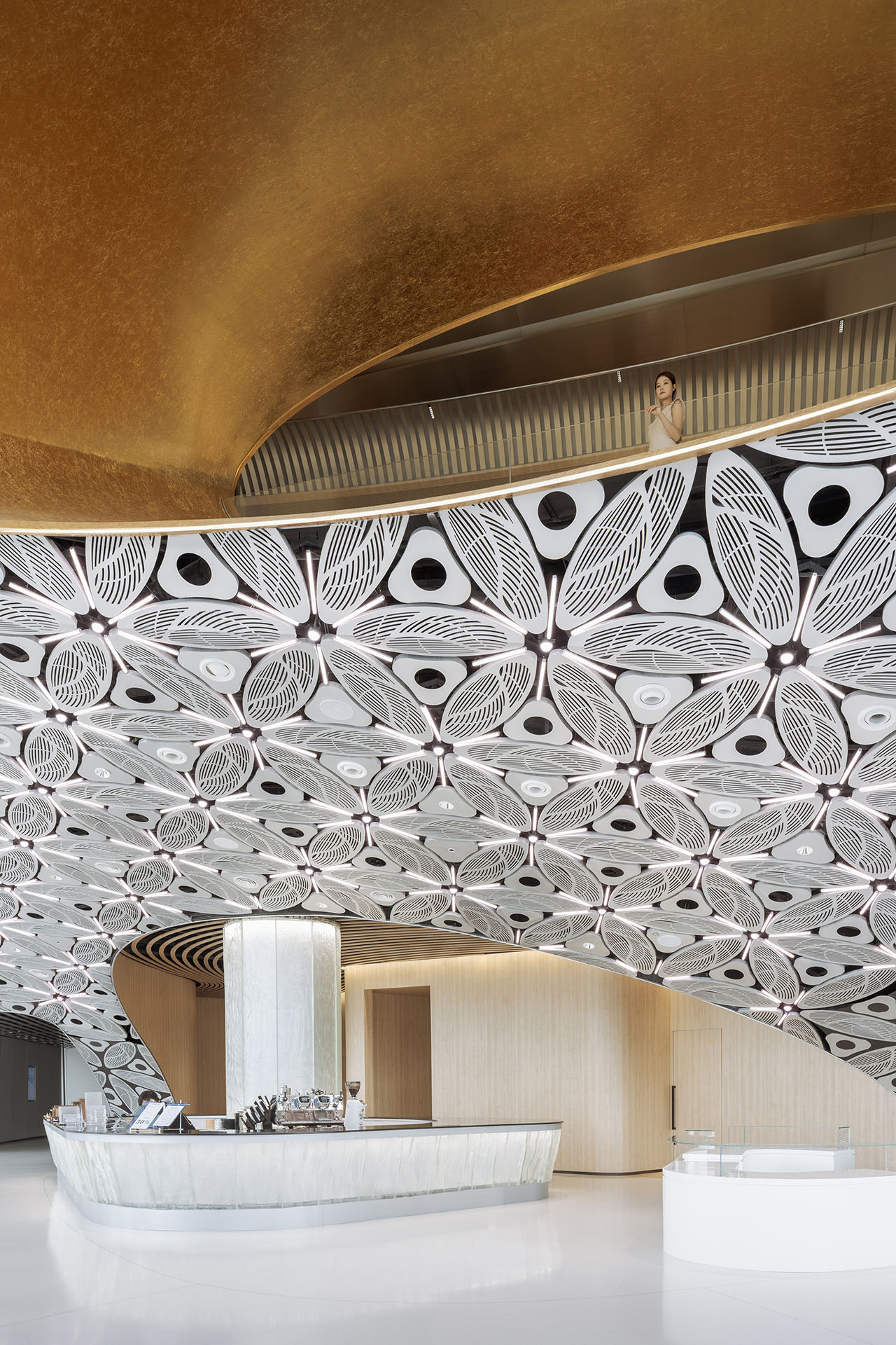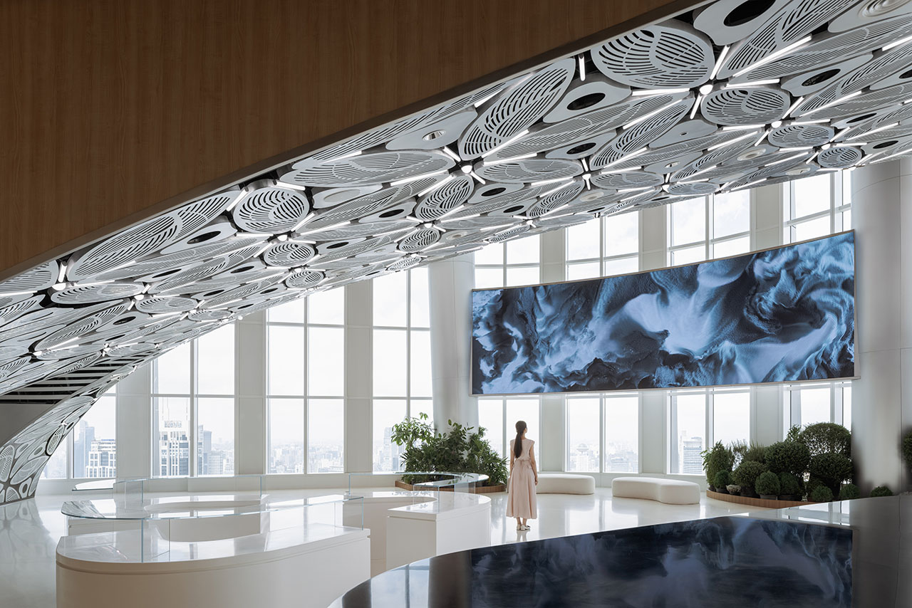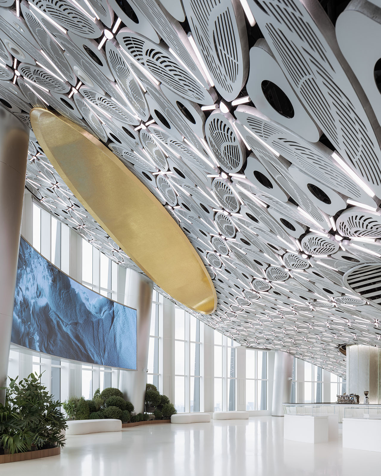55层具有两层通高的观光咖啡厅和大会议室。采用56层的白色拱顶不仅单调,而且更为复杂的音箱、广播、摄像头、消防喷淋、烟感、灯具以及风口也会破坏连续拱顶的纯粹。我突然有了一个大胆的想法,我为什么不用计算机技术把这些大大小小的洞口和设备整合在一个完整的花纹里面呢?由冰联系到雪花,最后以六瓣雪花的造型为基础形成了1100块草叶穿孔纹阳极氧化铝板,把所有设备组织成连续巨大的天花板花纹。