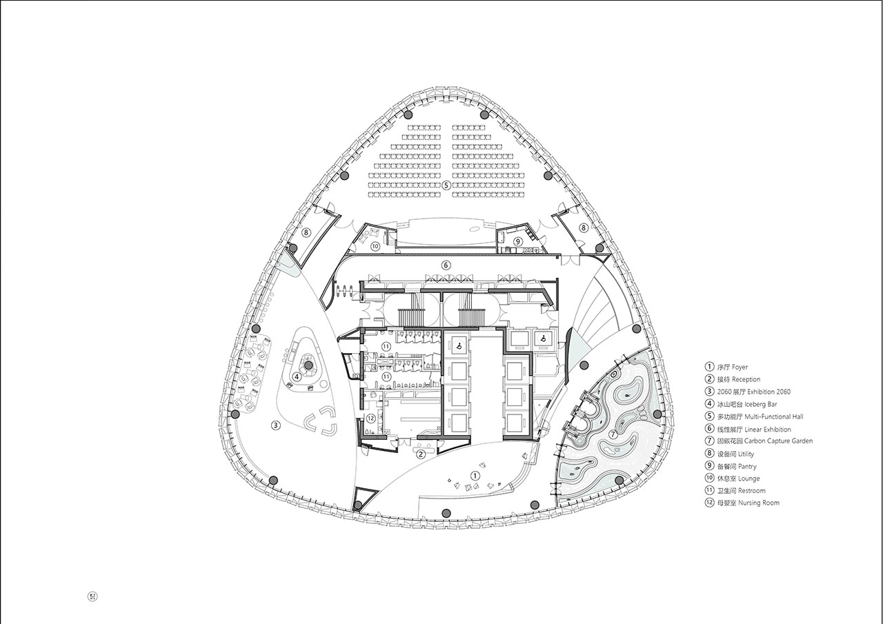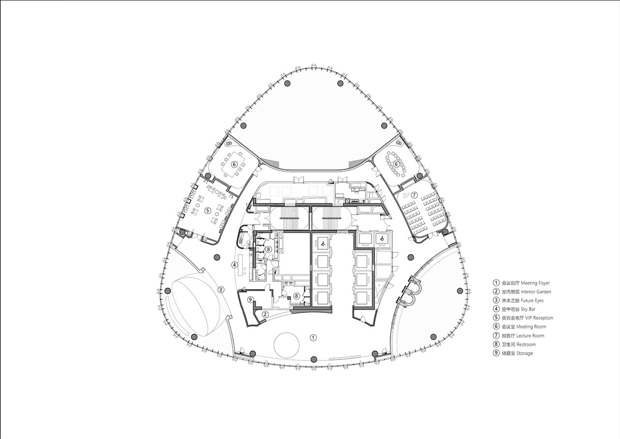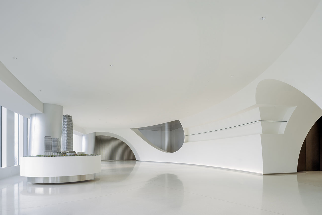 我决定把设计范围的55、56层和屋顶57、58层完整设计成一个抽象过的冰山。以57层屋顶为有浮冰的海面是户外主观光层,57层以上机房到58层直升机救援平台为露在海面上的冰山。55、56层塔顶室内涵盖序厅、观光厅、展览厅、下午茶咖啡厅、大会议室、空中花园和会议室,以及休息厅为海面下的冰山。把功能空间设计成冰山的山洞,用统一提炼过的拱形元素加以连续控制而创造了一种可以感知的熟悉的陌生感,当略微对观众解释,就可以达到恍然大悟的共识。观光厅这类熟悉但没有形式共识的场所就可以被感知和理解。