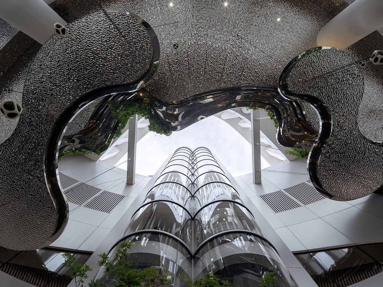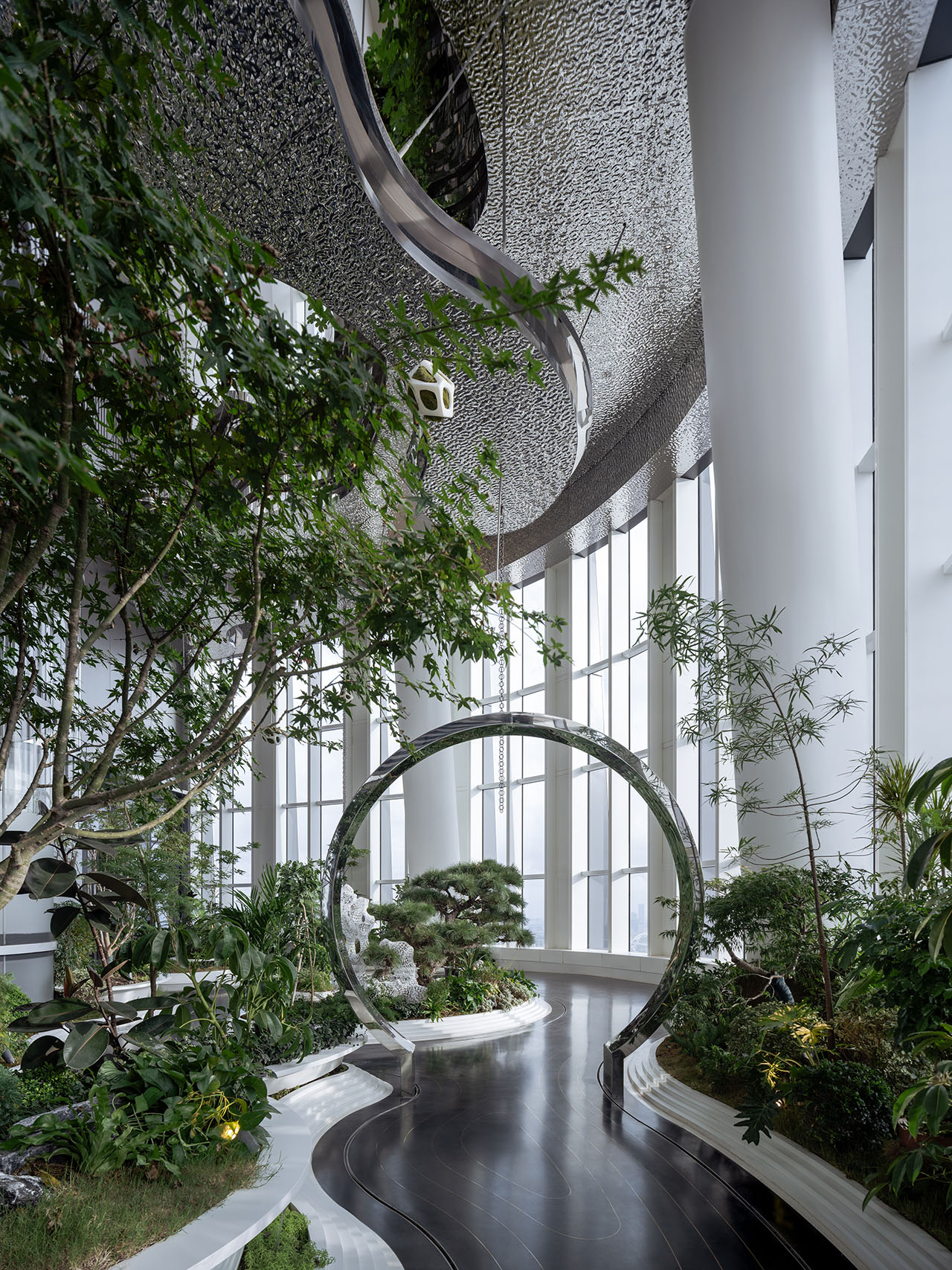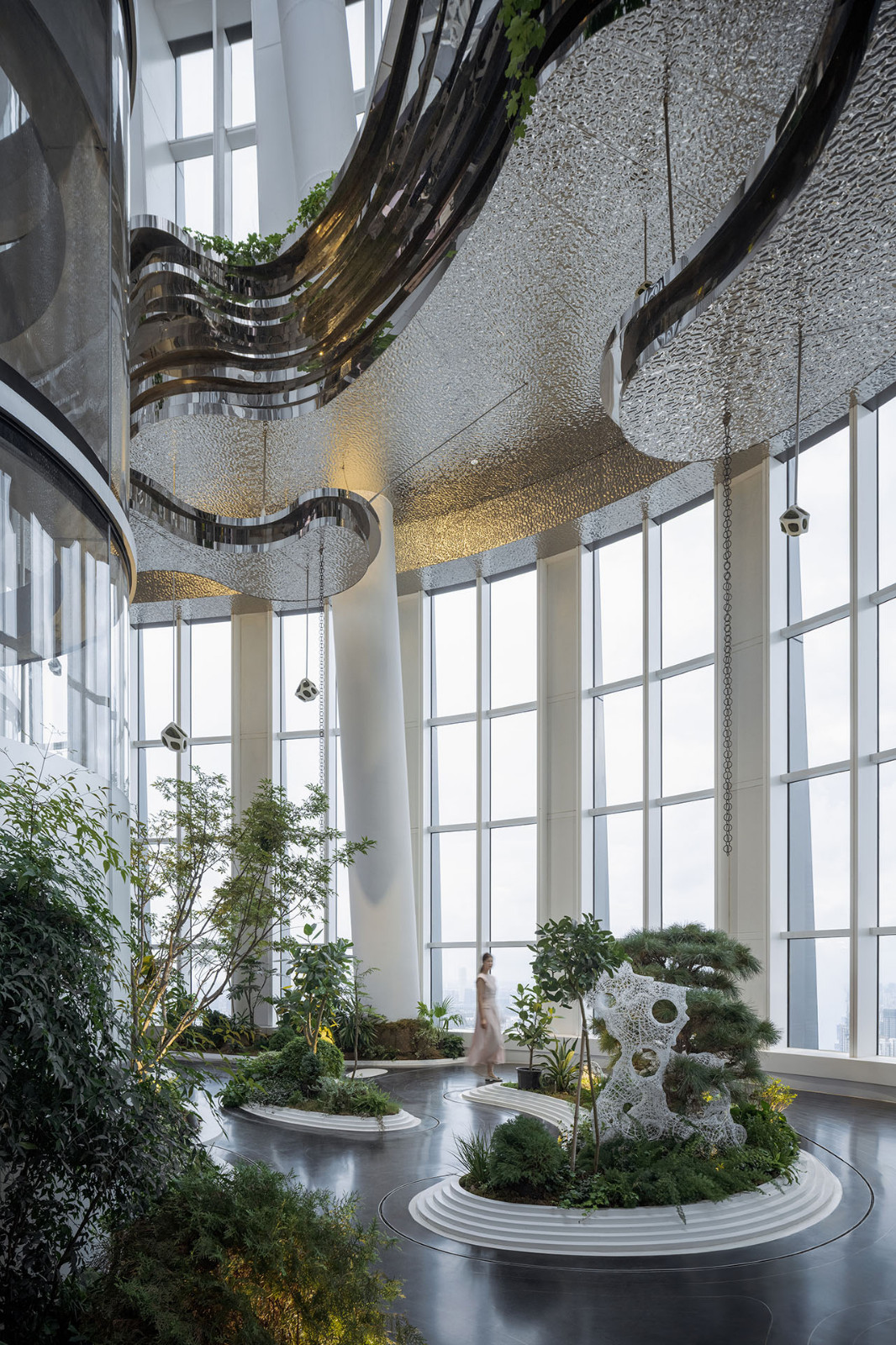 在55层有一个120平、高度25米且顶部开放的户外空间。对偶帮助我以“冰山”为上句,创造出下句“绿心”,我决定把它设计成一个绿色花园。也是对偶触动我放弃一个类似上海中心复制一个传统园林的思路,而是先解构一个传统园林(致敬黄浦东南第一园-豫园),然后以立体的方式重新组合成一个新的悬浮的空中花园。在25米的高度上,建筑师和景观师设计了不同高度的波纹不锈钢包裹底部的浮岛花园,从55层观光电梯到57层就是穿越一个立体花园。而每一层浮岛花园最后投影在55层这块120平米的模拟水面的黑色水磨石和金属涟漪的地坪上,会有超过100%的绿地。不锈钢月门和3D打印的太湖石(致敬玉玲珑)是这个重构未名的中国园林在视觉上的历史和当代对偶成双。