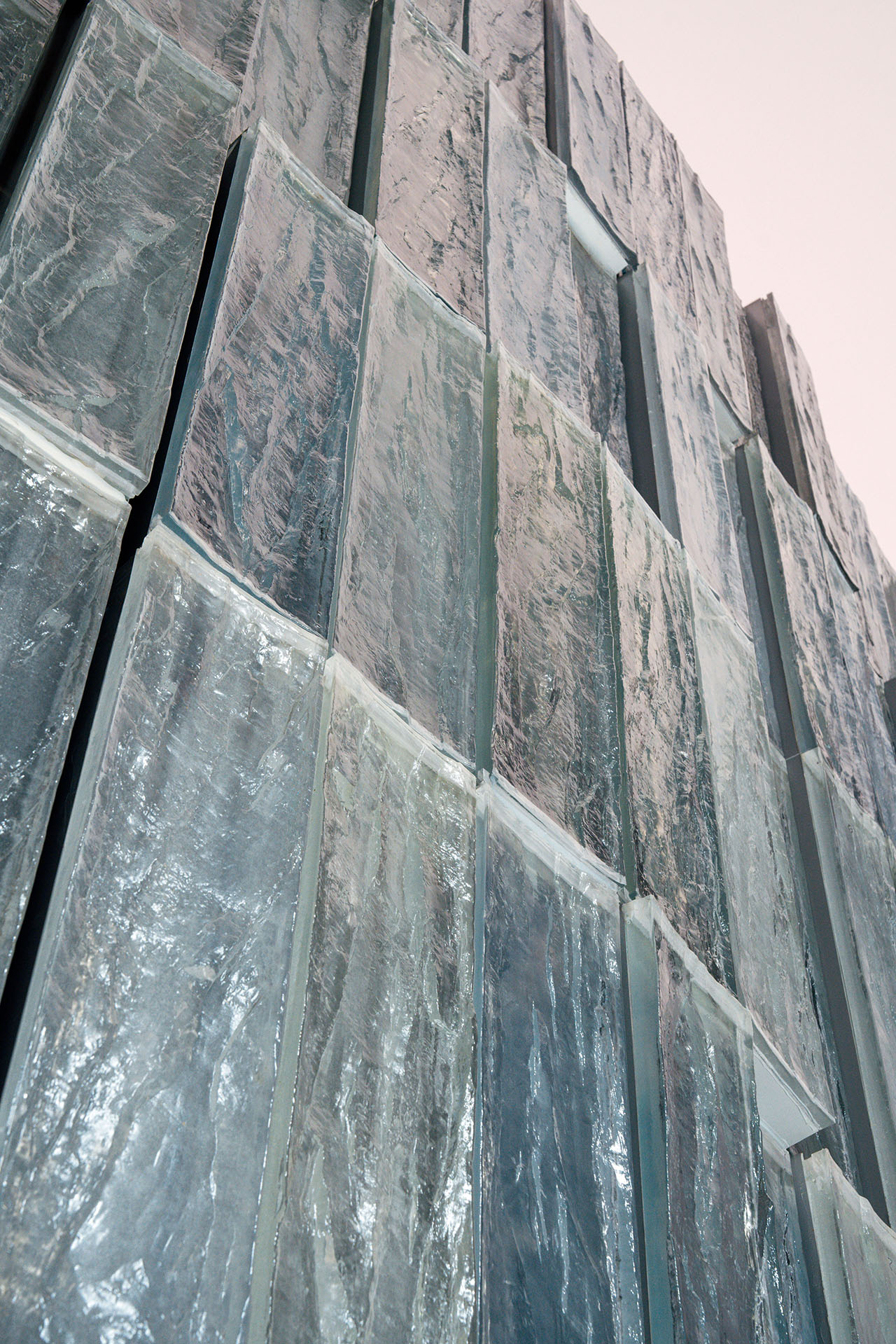 在57层屋顶的水磨石白色“海面”上,联合上海市工艺美术大师施君把屋面设备电梯机房打造成抽象的琉璃冰山。半透明的琉璃在视觉上接近冰块而直接点题冰山。在这个冰山山壁后面,联合欧普照明以LED灯管形成两种表达,一个是整体颜色的变化,冰山可以变成彩山;一个是能创造出一幅隐约的关于长江的画卷。这冰山通过琉璃这种材料的转化而在情绪上回到上海,更是达成塔冠冰山的第三步。