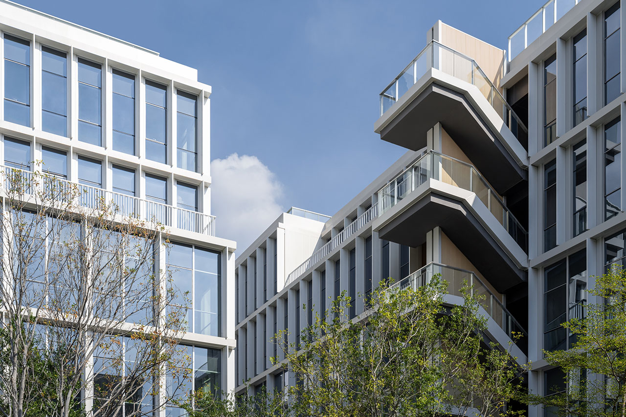 在项目的南侧与东侧,两栋办公楼延续了体量错动与层叠露台的建筑语言。Superimpose叠术建筑从设计开始就与业主紧密合作,将建筑表达与灵活、可持续的租赁策略相结合,使最终的建筑更好的适应其灵活商业策略,每栋垂直分区以容纳两组独立租户,配有专属入口与大堂。这一策略不仅将项目商业潜力最大化,也将客户需求与未来工作模式演变的理解清晰体现。