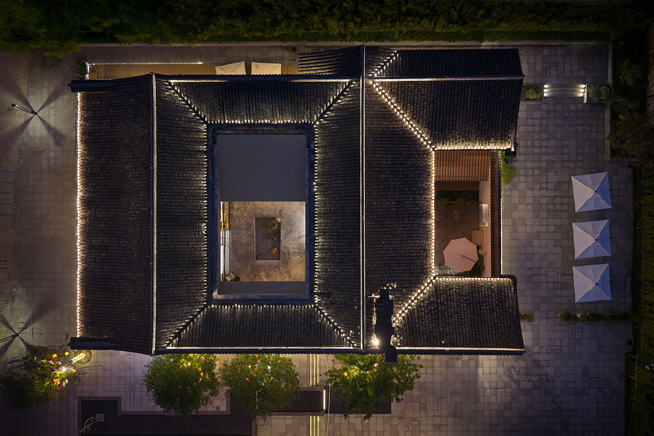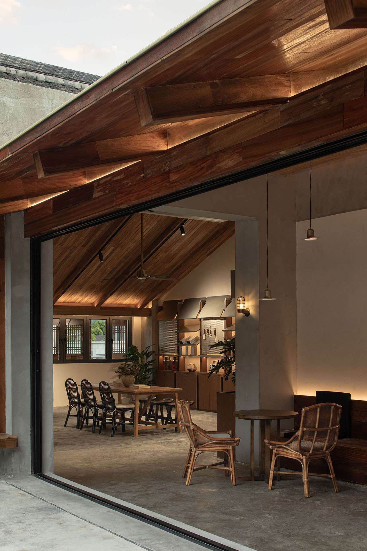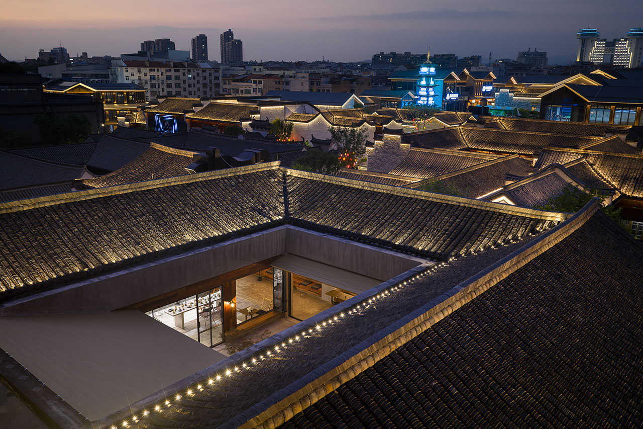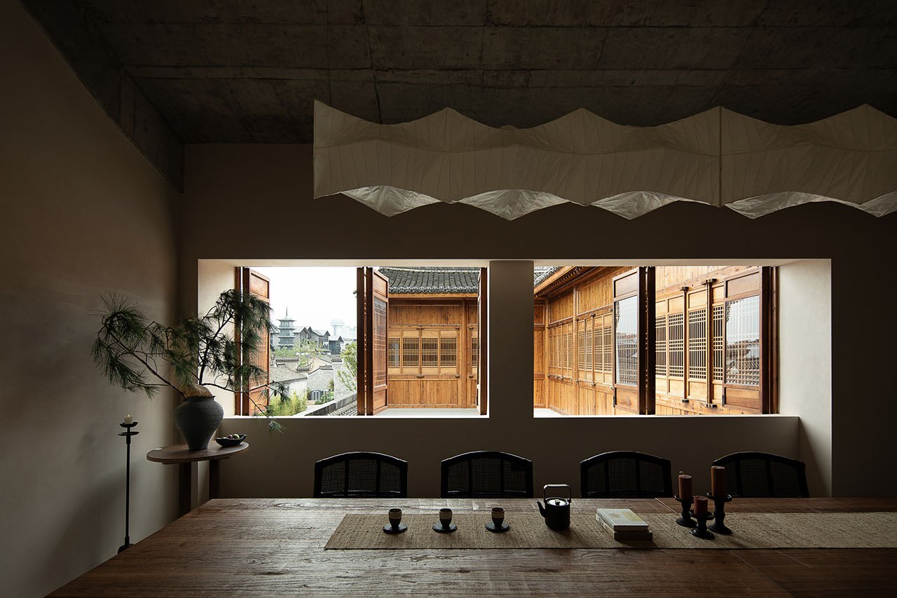 包厢完整保留了原始人字屋顶与木格栅窗的历史肌理,在开放与私密间建立精妙平衡,围合出一方独享的静谧天地。置身其间,历史街区的连绵屋瓦与城市现代轮廓透过木格栅窗渐次展开,构成一幅时空交织的立体画卷,生动见证着街区的持续演进与有机更新。