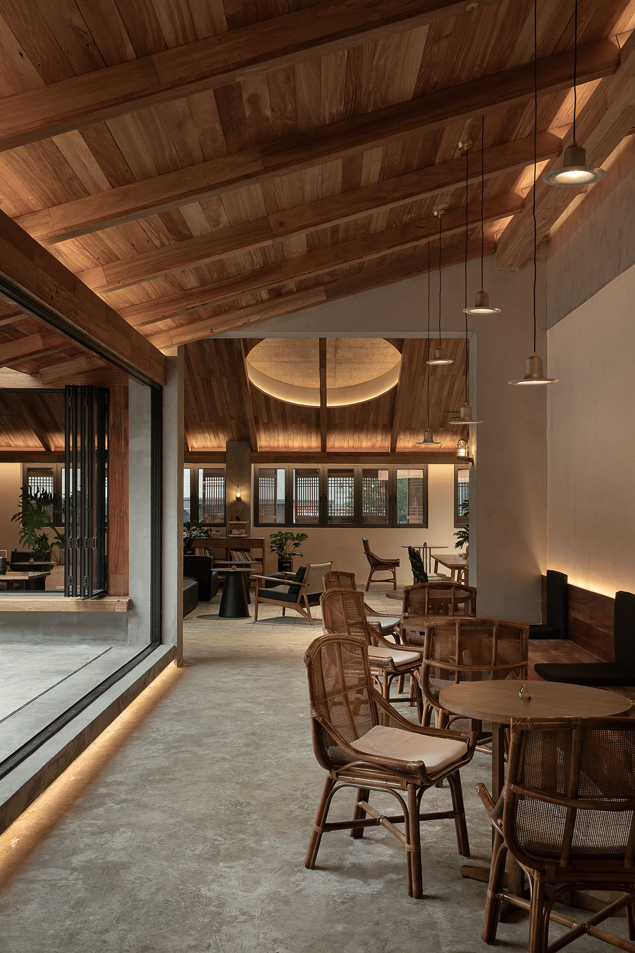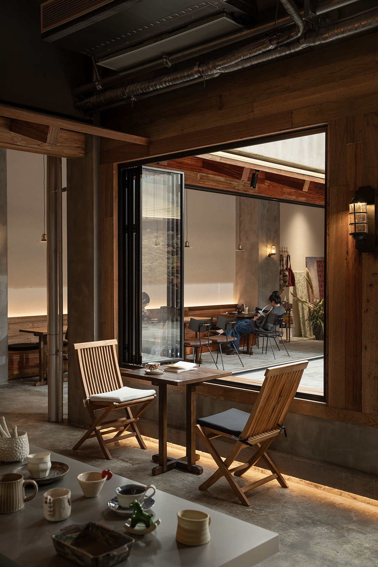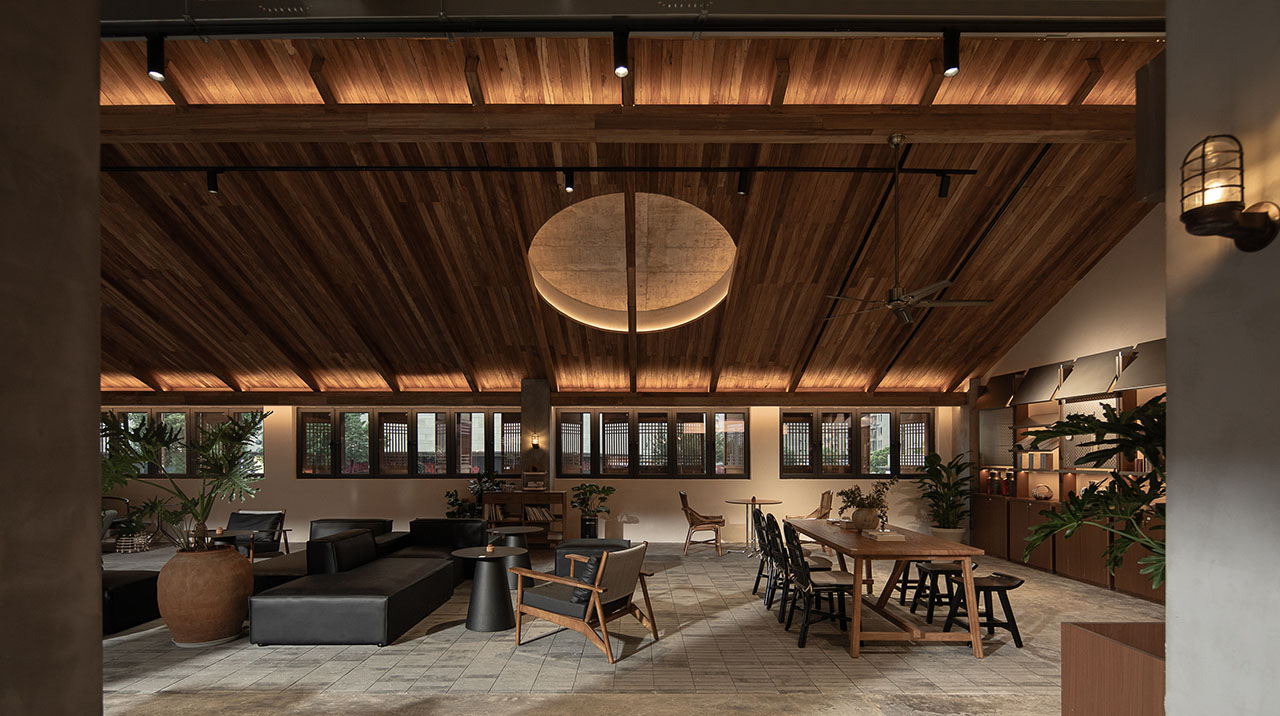 立于中庭回望,一幅融汇当代生活与历史意境的画卷在眼前铺陈。挑檐之下,木格窗框将吧台区域的座椅巧妙分割,恰似传统园林的漏窗借景。人们倚窗而坐的身影被框成一幅幅生动的画面,令人联想到往昔在屋檐下闲话家常的温馨场景,空间语言构建起此地独有的时空对话。