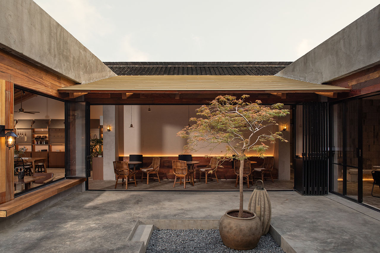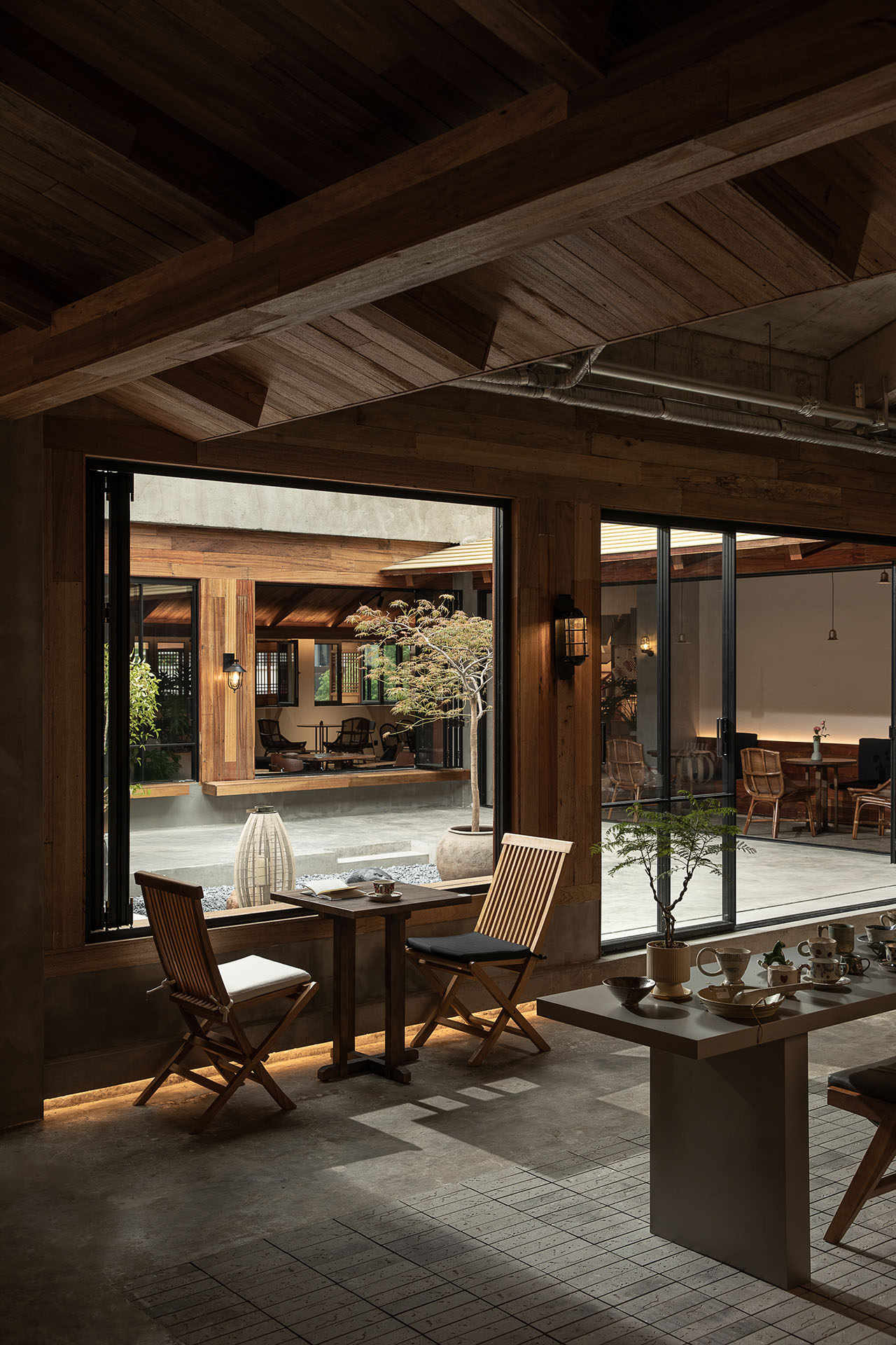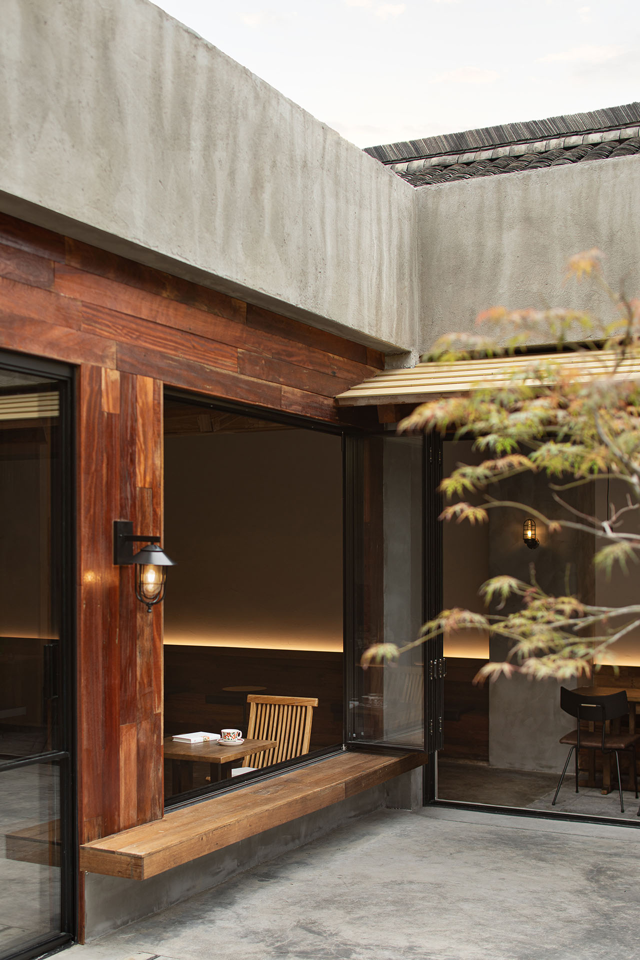 立于中庭回望,一幅融汇当代生活与历史意境的画卷在眼前铺陈。挑檐之下,木格窗框将吧台区域的座椅巧妙分割,恰似传统园林的漏窗借景。人们倚窗而坐的身影被框成一幅幅生动的画面,令人联想到往昔在屋檐下闲话家常的温馨场景,空间语言构建起此地独有的时空对话。