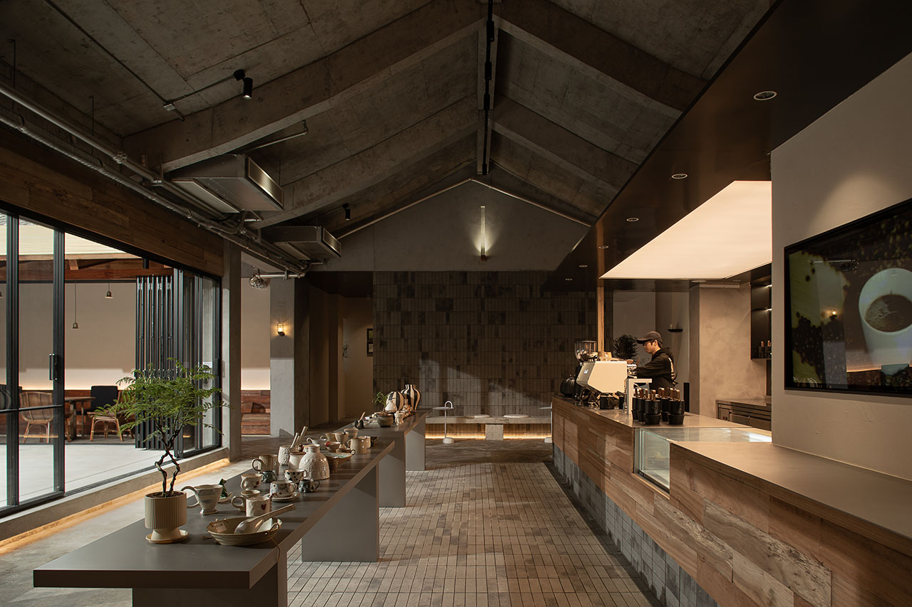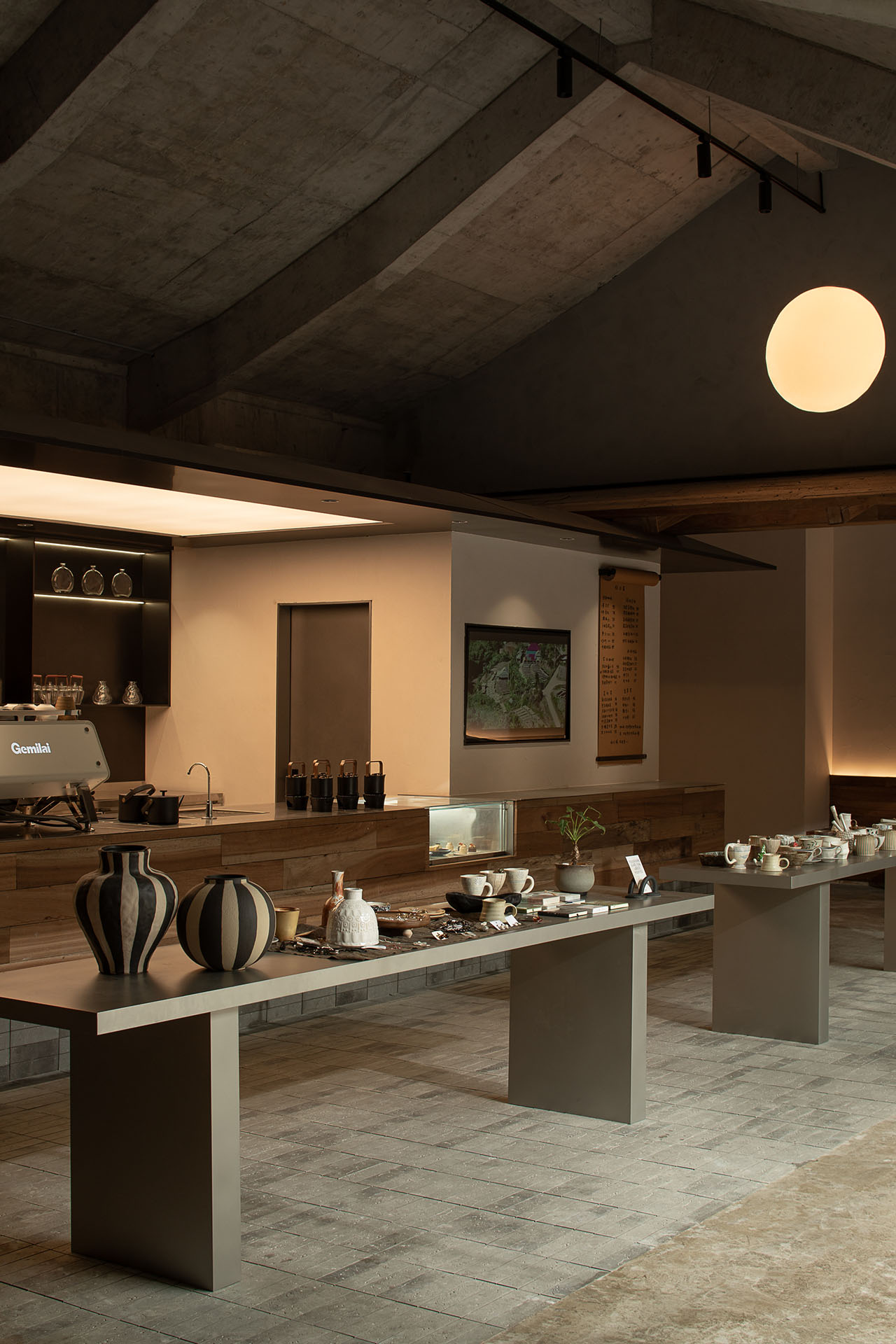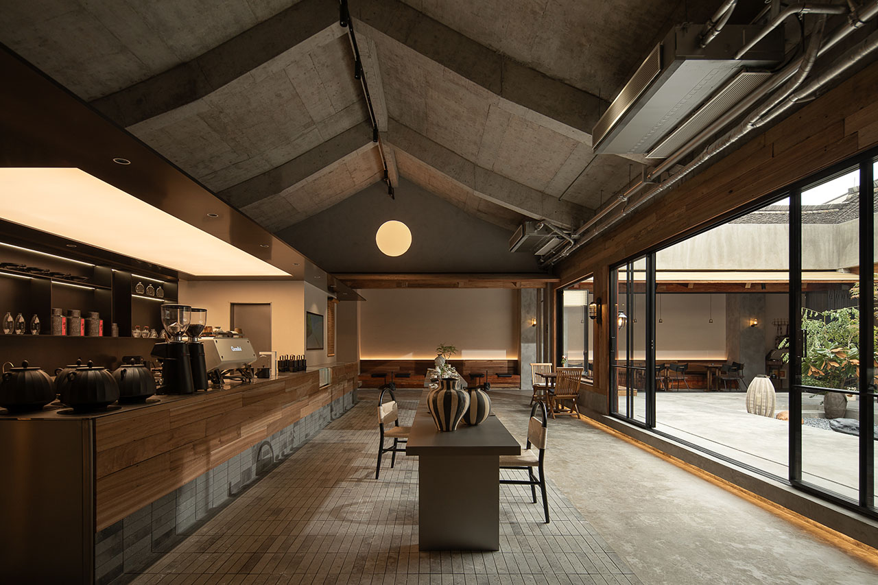 设计完整保留了原有建筑的坡屋顶构架,让历史的轮廓在空间中清晰生长。混凝土的质朴与木材的温润形成新旧对话,地面延伸的小青砖则延续了街巷的历史肌理。片状光源结合深色金属构件悬垂于吧台上方,与木质结构形成轻盈的对比;立面镶嵌的圆形灯箱则如一轮明月,以恒定的光芒温柔地笼罩着空间。对光线与材质的把控既延续了场所的历史文脉,又为空间注入了当代的感知维度。