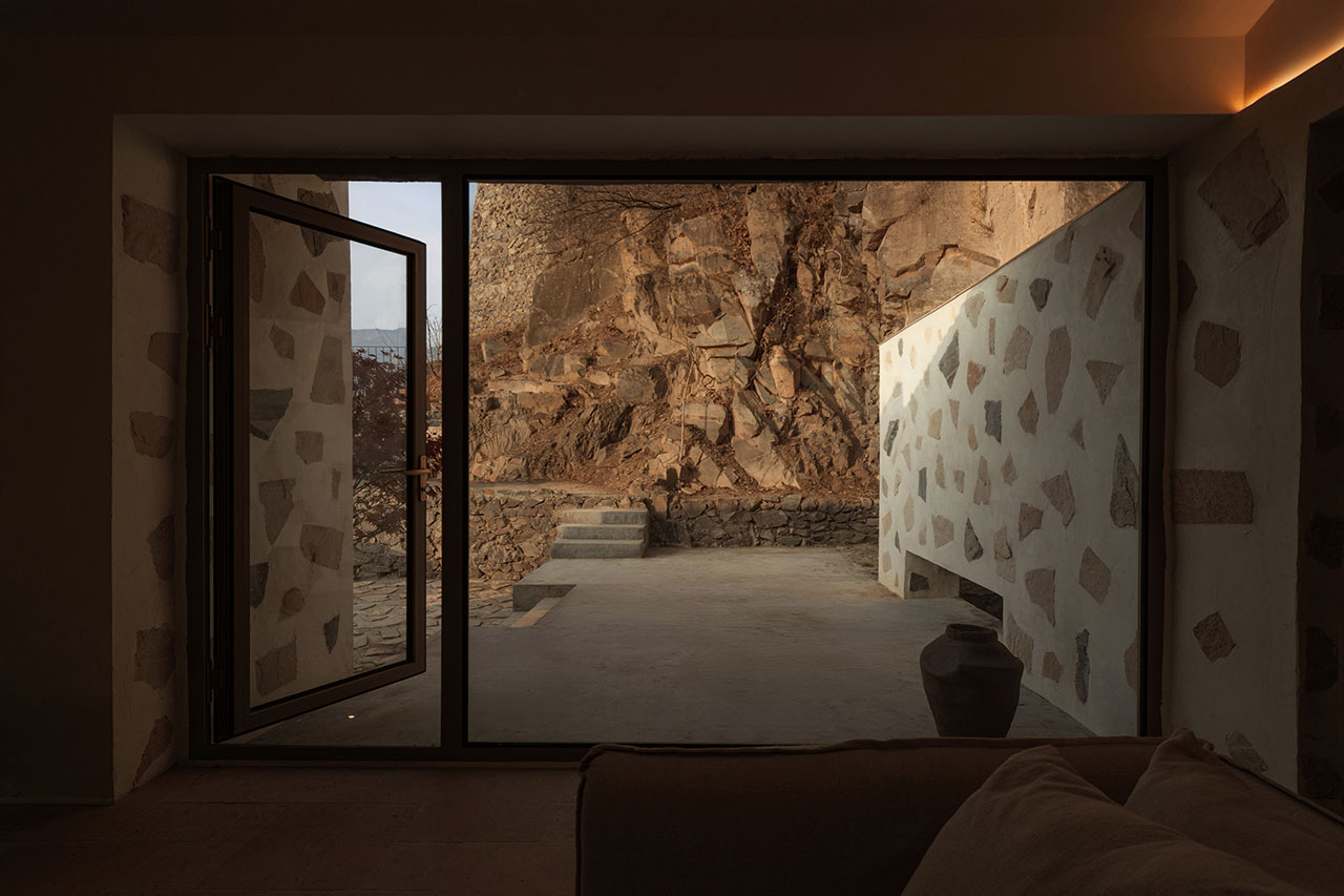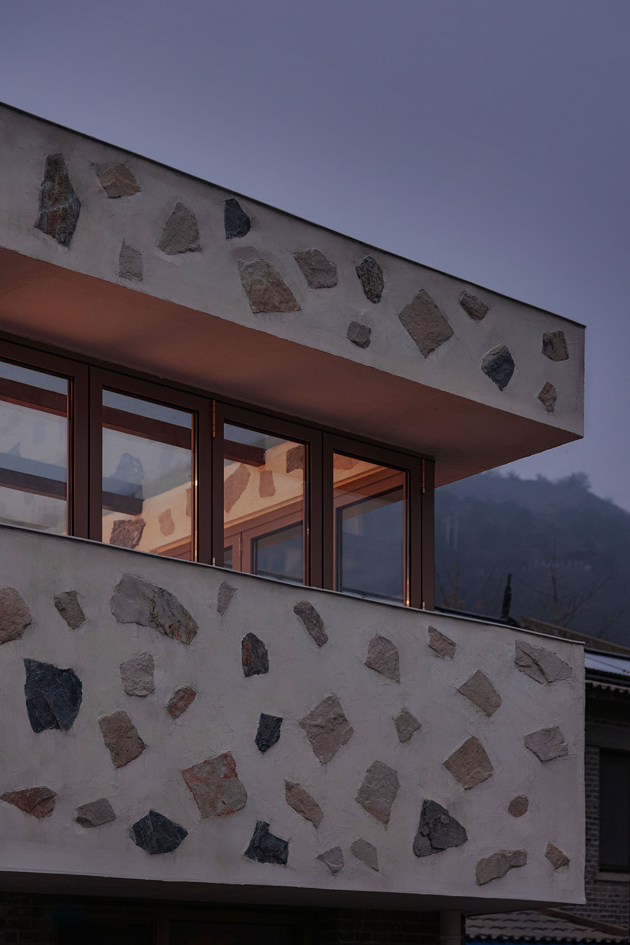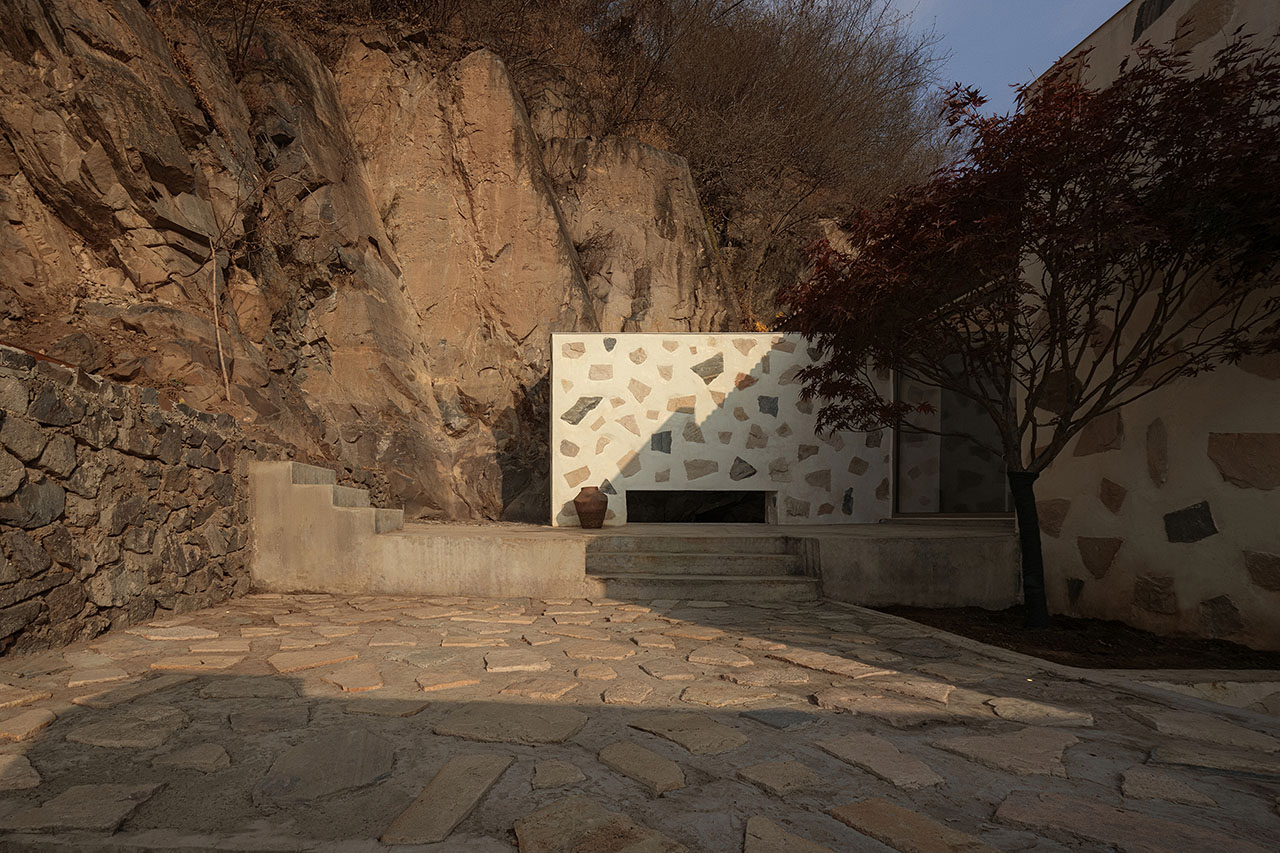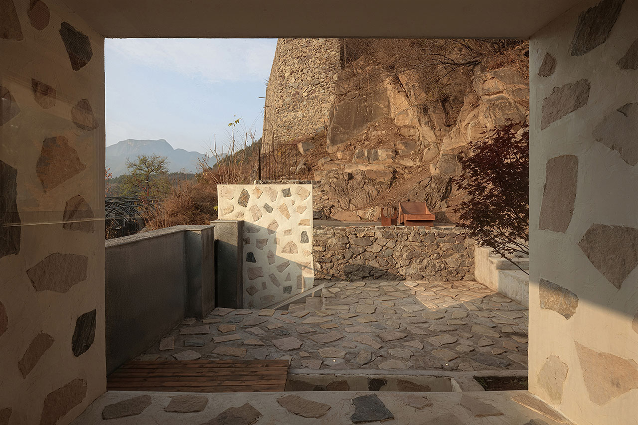 为强化建筑与山的关系,我们选择以石材铺贴建筑体块。远观时,白盒子整体悬浮于山前;近察时,则可见石头每一片精心的排布,其颜色、比例、角度,皆经过设计师驻场与师傅精心推敲完成。没有采用传统砌石填缝的工法,而是将石材干挂于墙面,因石材厚薄不一,填缝材料在表面自然形成微妙的曲面过渡,野趣中透出一丝灵动。最终呈现出如牛轧糖般的质感,这种感觉有一点惊喜,是设计过程中未曾预料的。