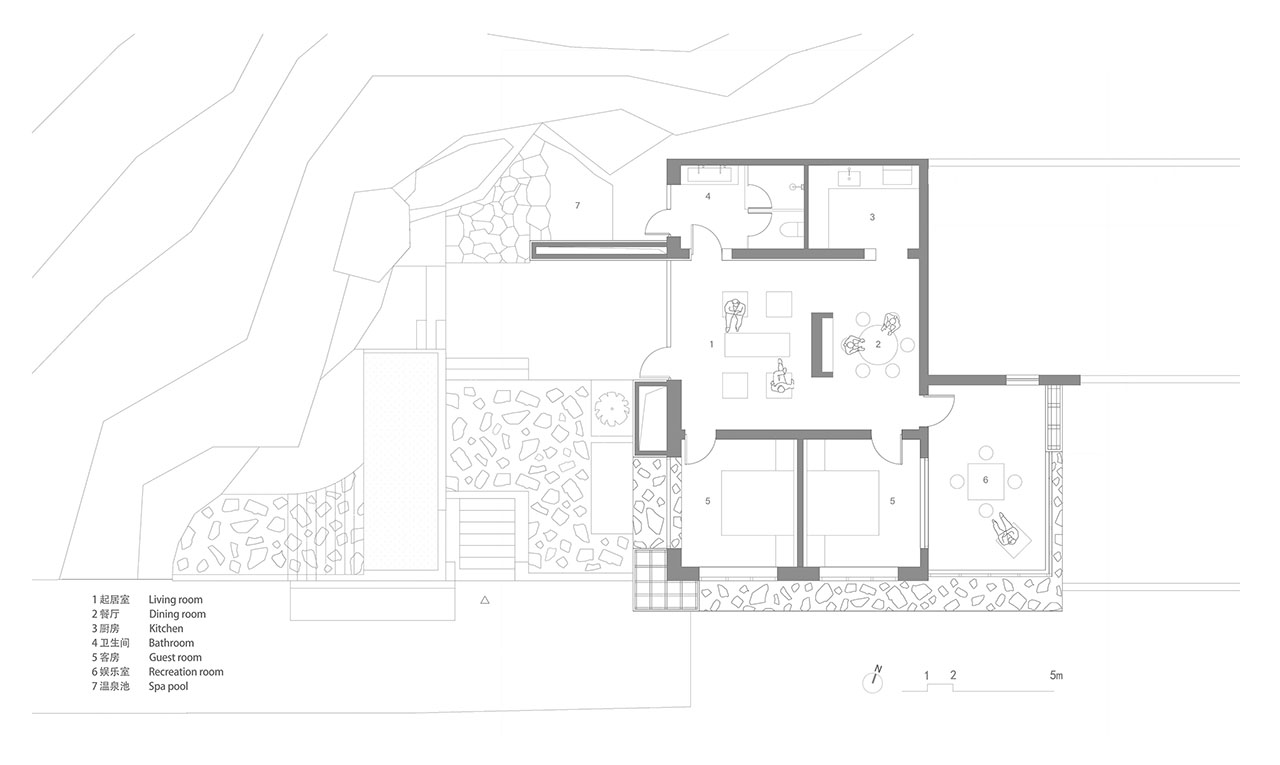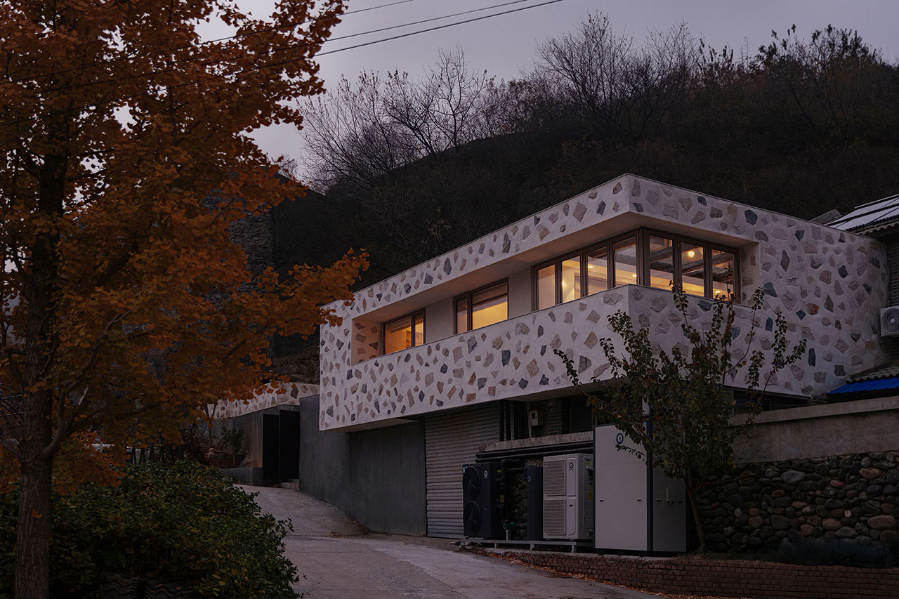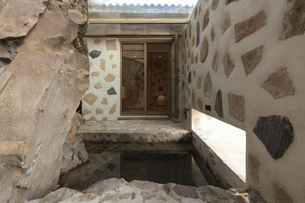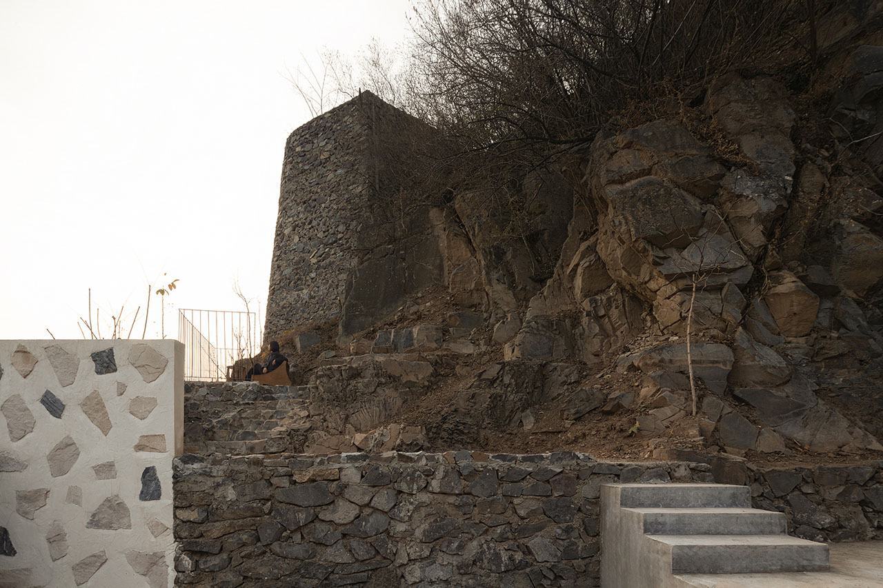 为强化建筑与山的关系,我们选择以石材铺贴建筑体块。远观时,白盒子整体悬浮于山前;近察时,则可见石头每一片精心的排布,其颜色、比例、角度,皆经过设计师驻场与师傅精心推敲完成。没有采用传统砌石填缝的工法,而是将石材干挂于墙面,因石材厚薄不一,填缝材料在表面自然形成微妙的曲面过渡,野趣中透出一丝灵动。最终呈现出如牛轧糖般的质感,这种感觉有一点惊喜,是设计过程中未曾预料的。
