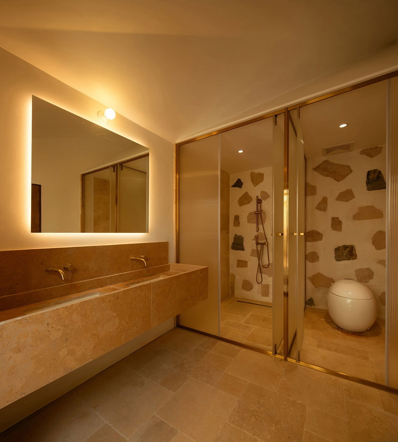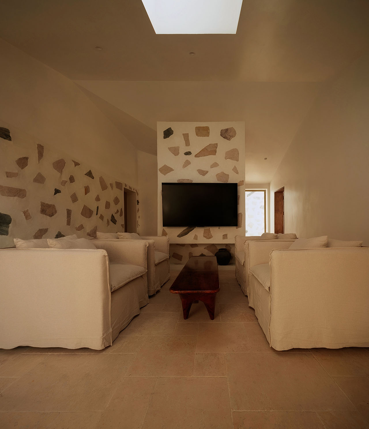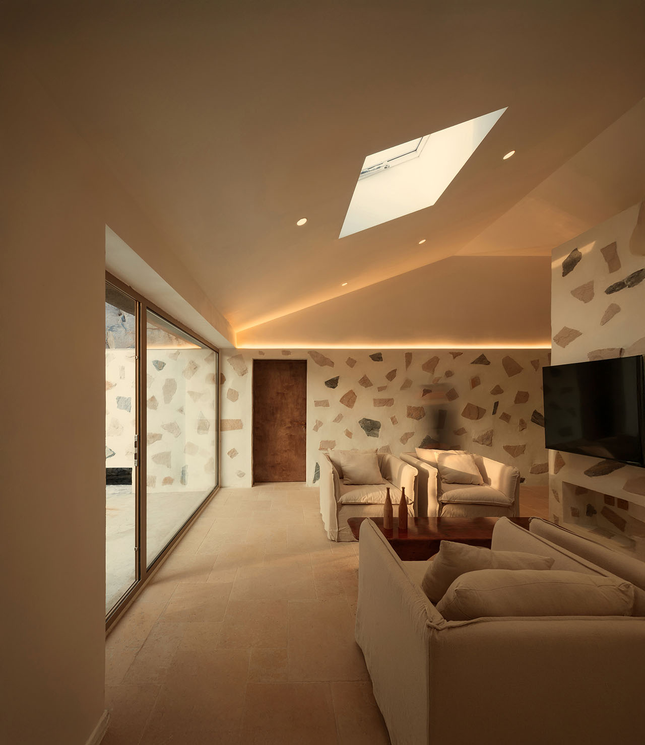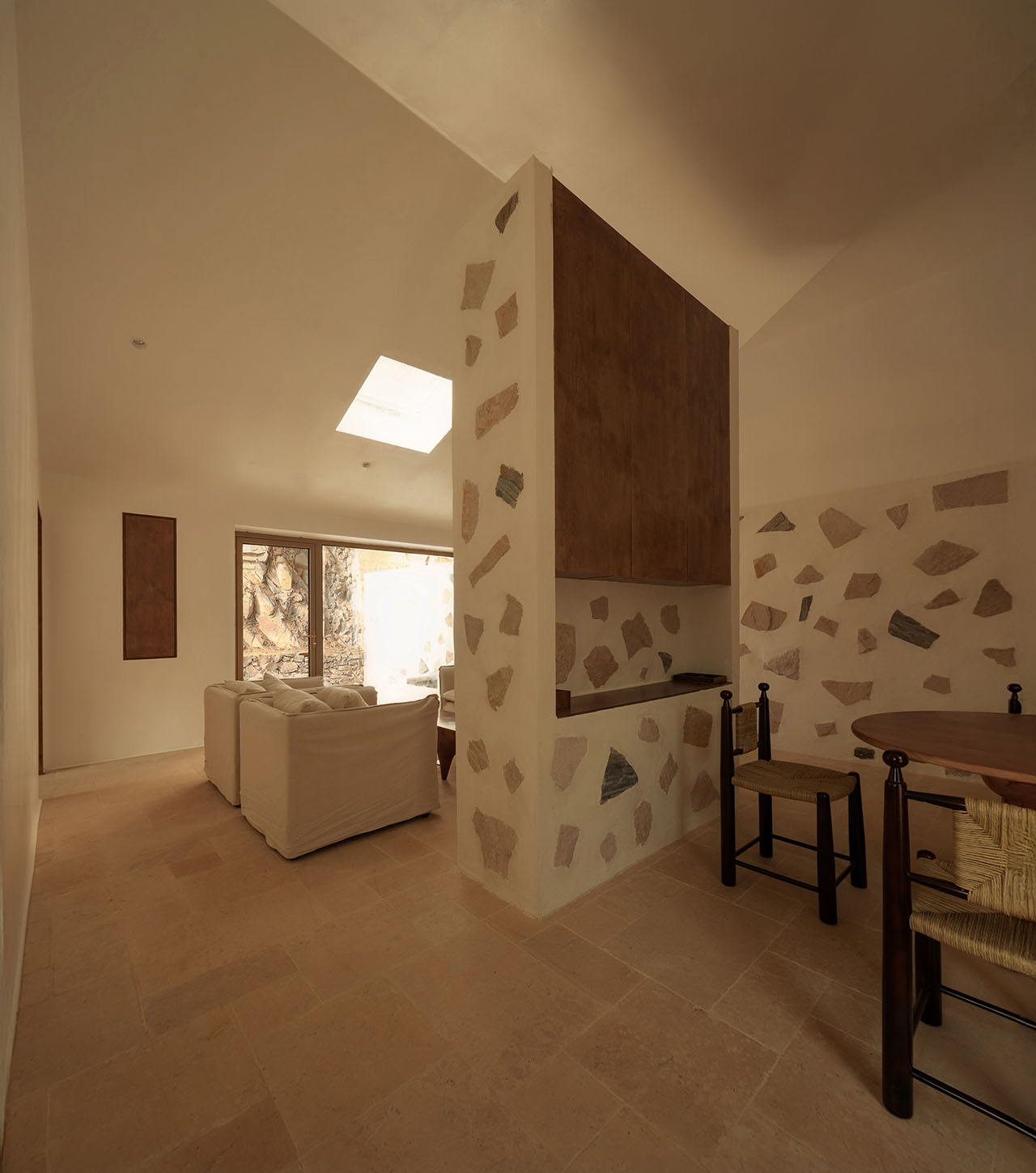 为强化建筑与山的关系,我们选择以石材铺贴建筑体块。远观时,白盒子整体悬浮于山前;近察时,则可见石头每一片精心的排布,其颜色、比例、角度,皆经过设计师驻场与师傅精心推敲完成。没有采用传统砌石填缝的工法,而是将石材干挂于墙面,因石材厚薄不一,填缝材料在表面自然形成微妙的曲面过渡,野趣中透出一丝灵动。最终呈现出如牛轧糖般的质感,这种感觉有一点惊喜,是设计过程中未曾预料的。