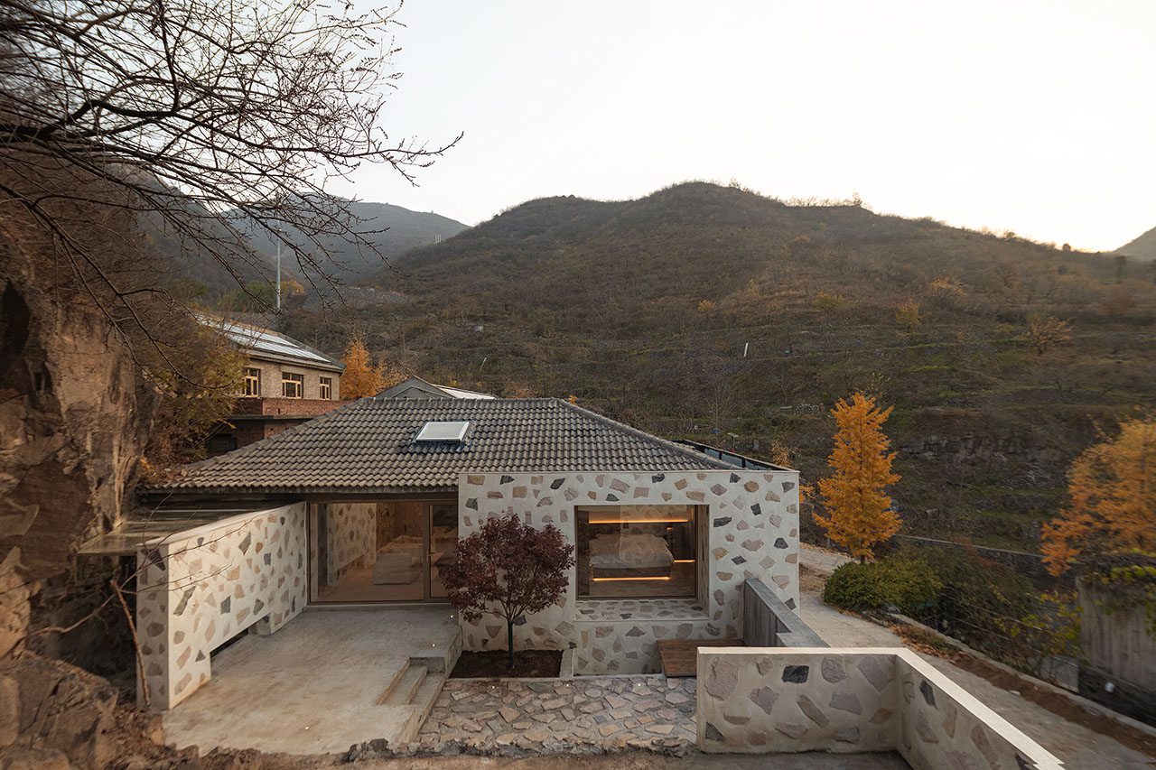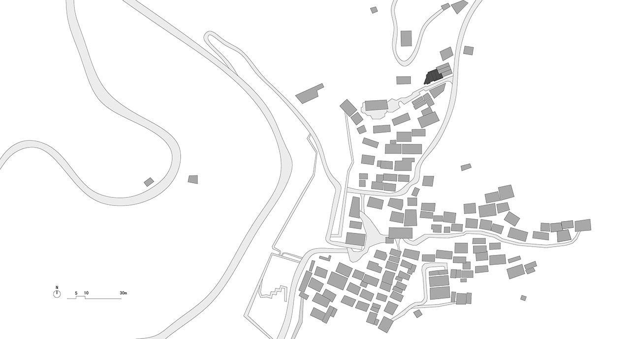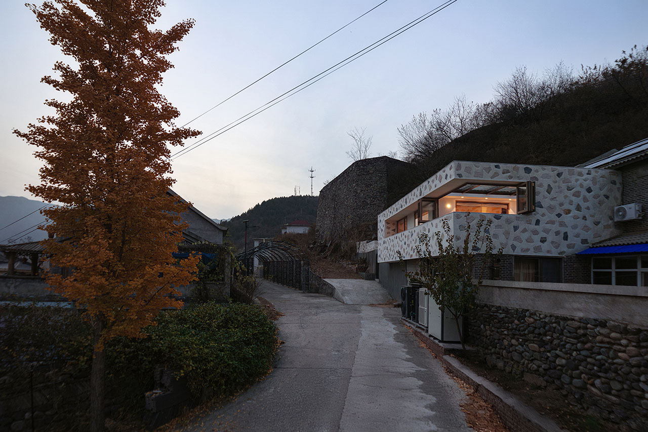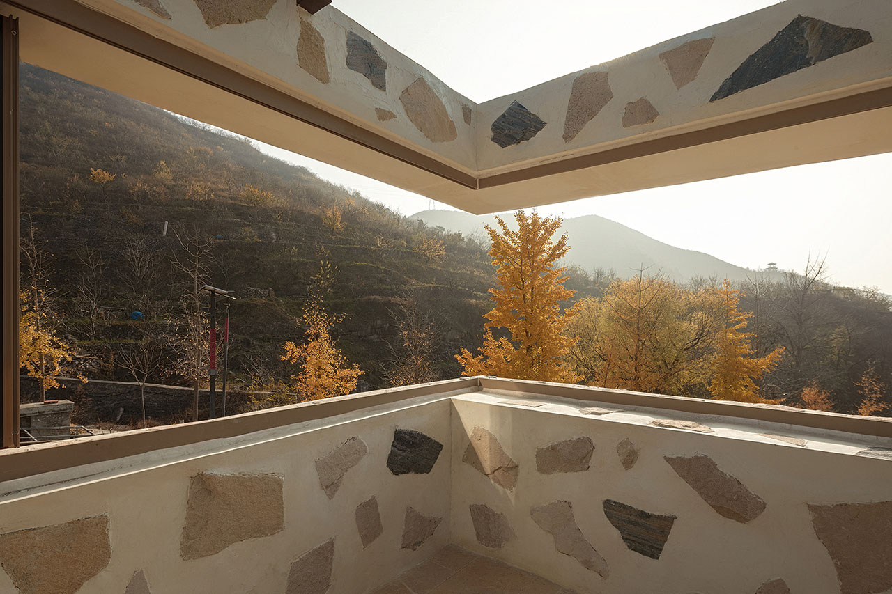 在一次偶然的机会中,我们与业主共同邂逅了这幢位于村庄最高处的独特房子。建筑与山的关系十分微妙:它依山而建,当你立于院中,仰首便见山峦仿佛被“装”了进来,成为院中一景。这种建筑与自然之间亲密而又戏剧性的对话,成为此次设计的起点。