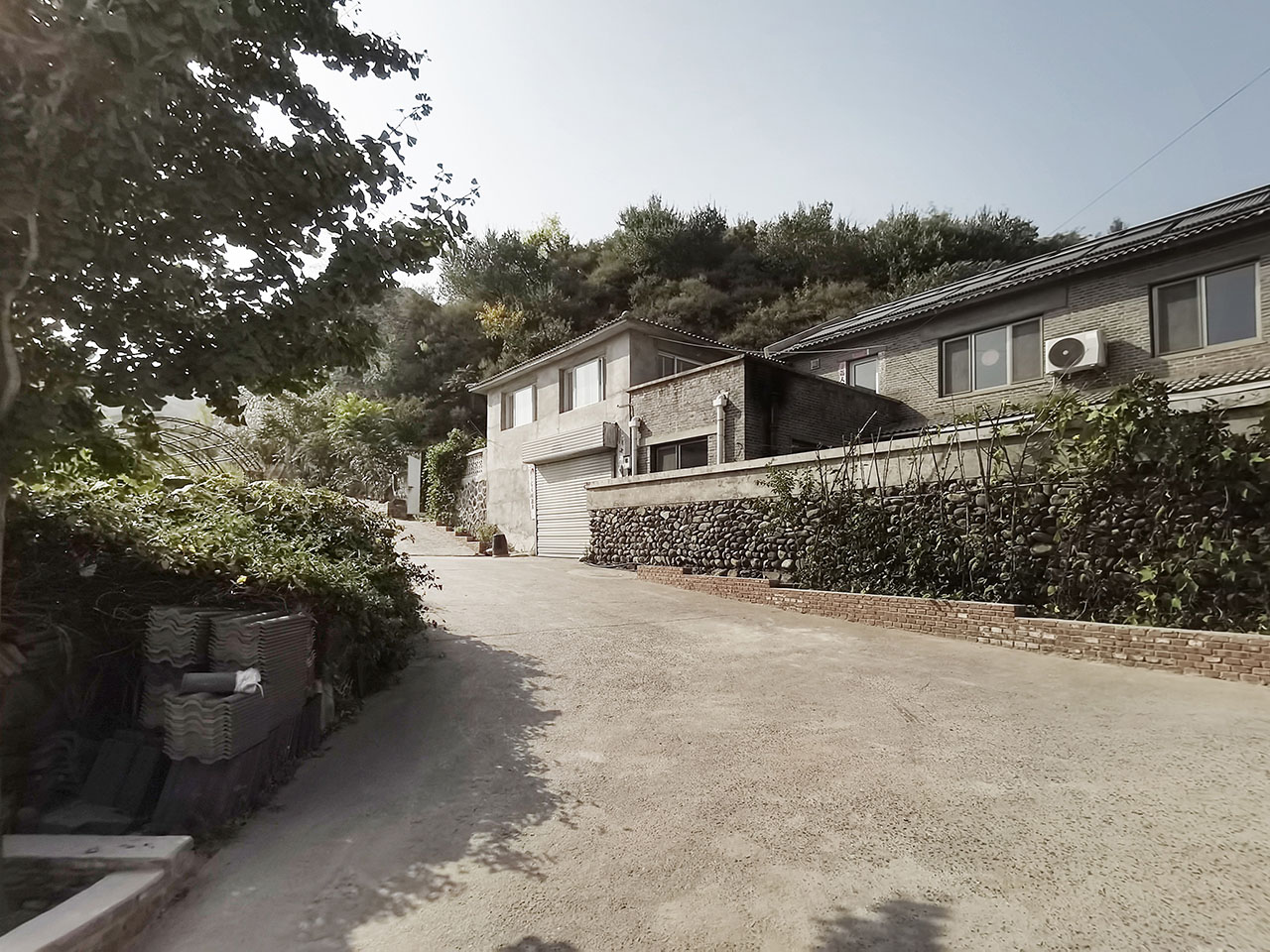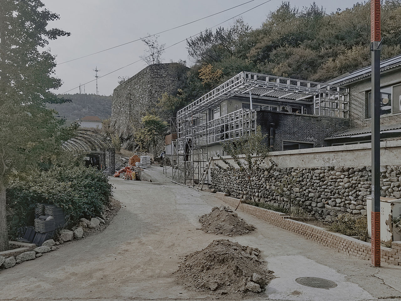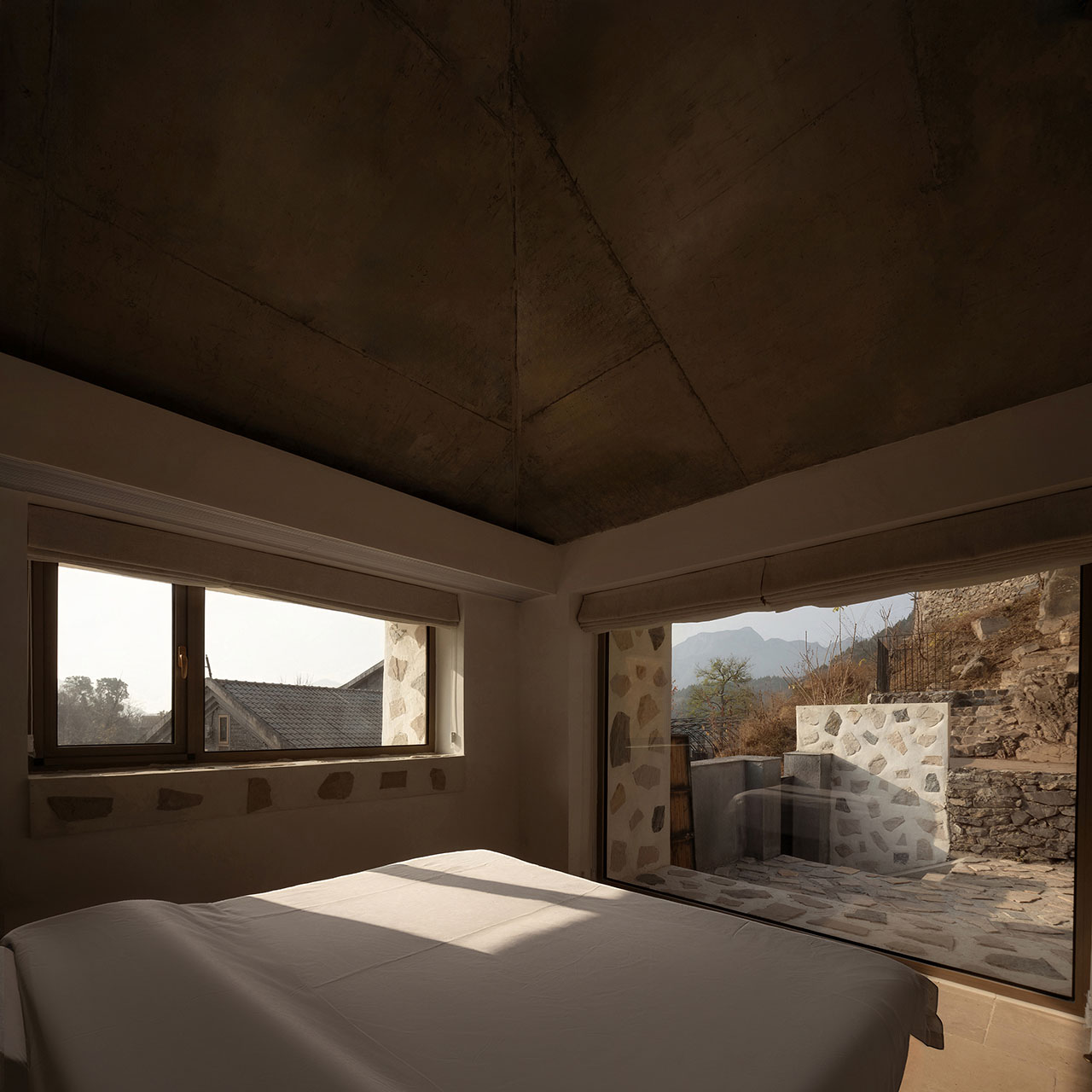 在一次偶然的机会中,我们与业主共同邂逅了这幢位于村庄最高处的独特房子。建筑与山的关系十分微妙:它依山而建,当你立于院中,仰首便见山峦仿佛被“装”了进来,成为院中一景。这种建筑与自然之间亲密而又戏剧性的对话,成为此次设计的起点。