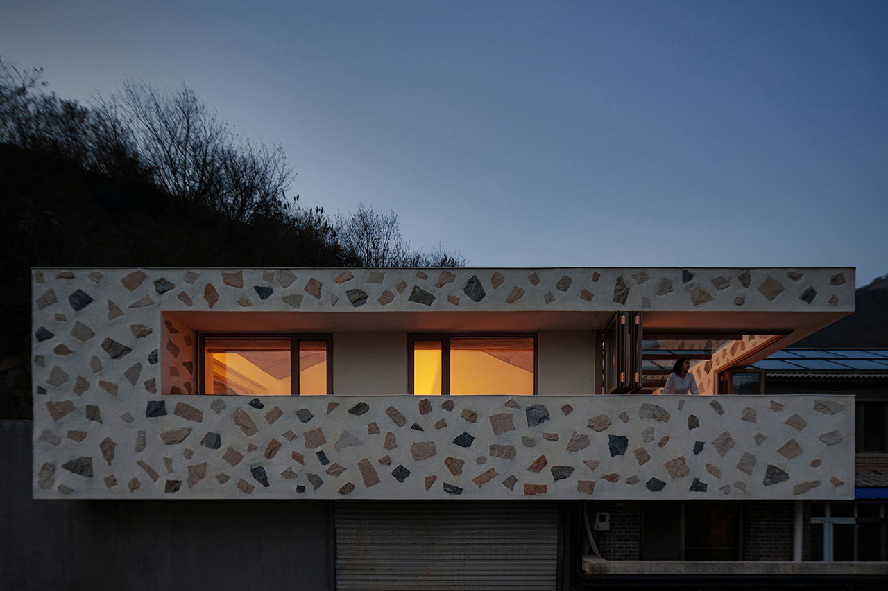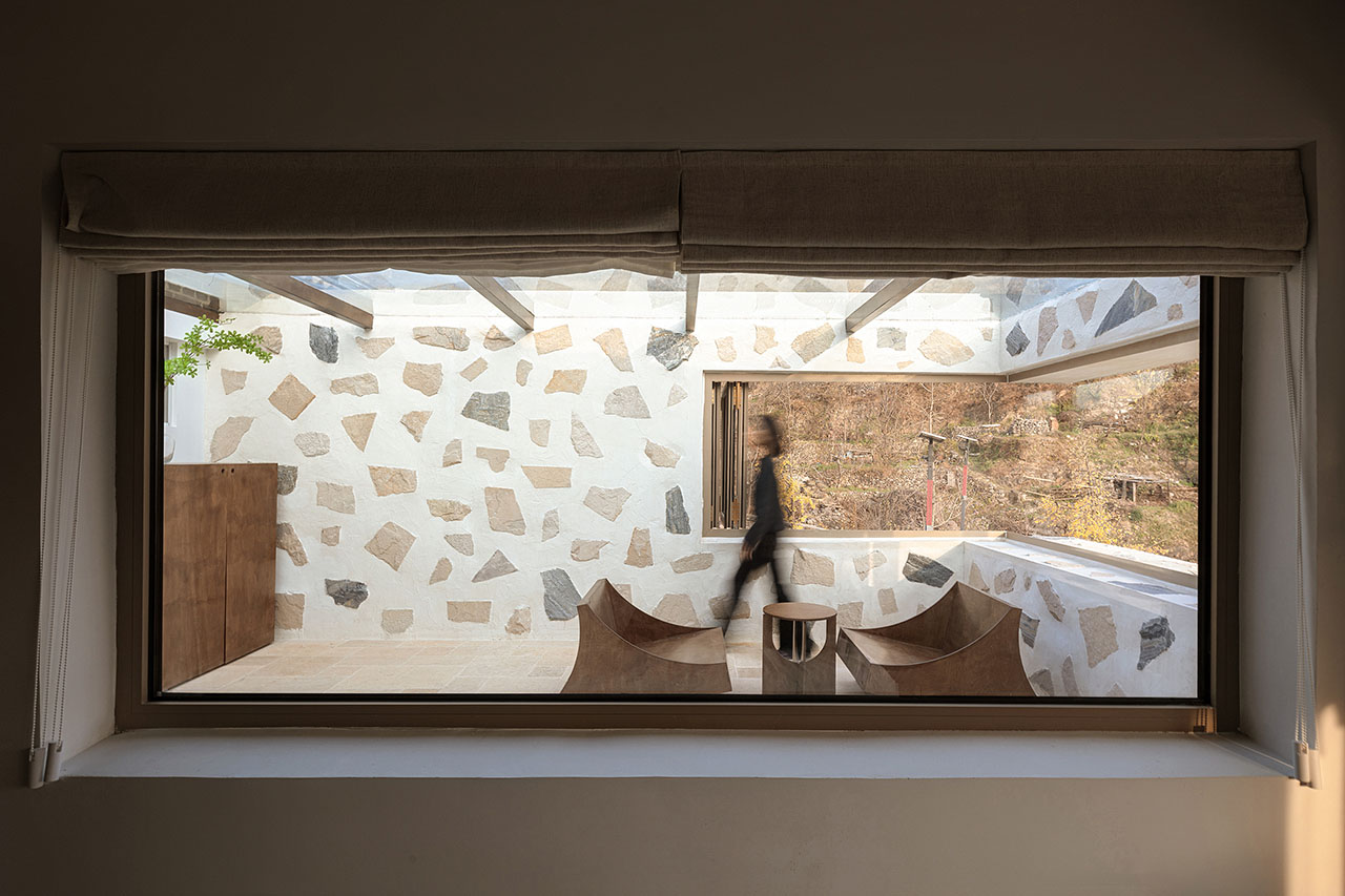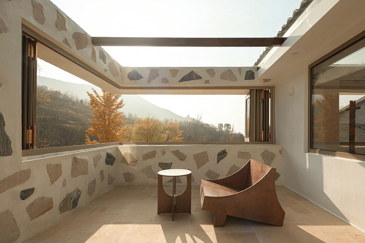 改造后的南侧外墙向外挑出,二层窗户也因此自然“退后”,原本平直的立面顿时生出空间层次,每一扇窗都成为自然的画框。东侧露台加设玻璃顶盖,改造为阳光房,其室内墙体延续外立面的材质语言,模糊了内与外的界限。建筑东南角的洞口去除竖向支撑,形成一个完整无阻的取景框,框入漫山的青翠,以及乡野独有的、温润而奢侈的时光。