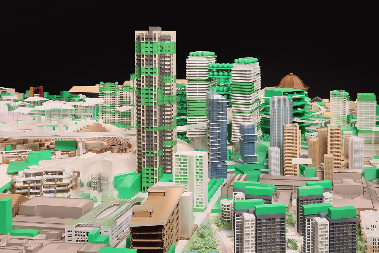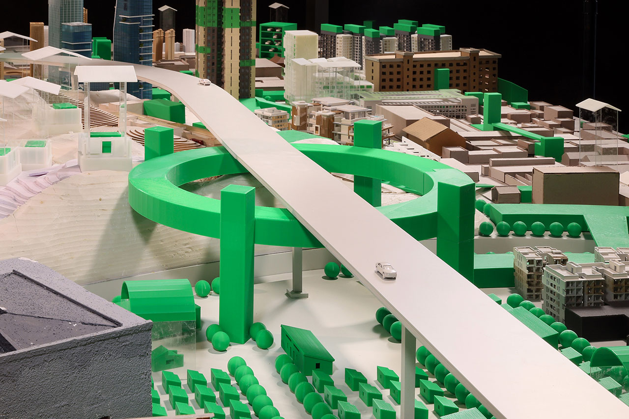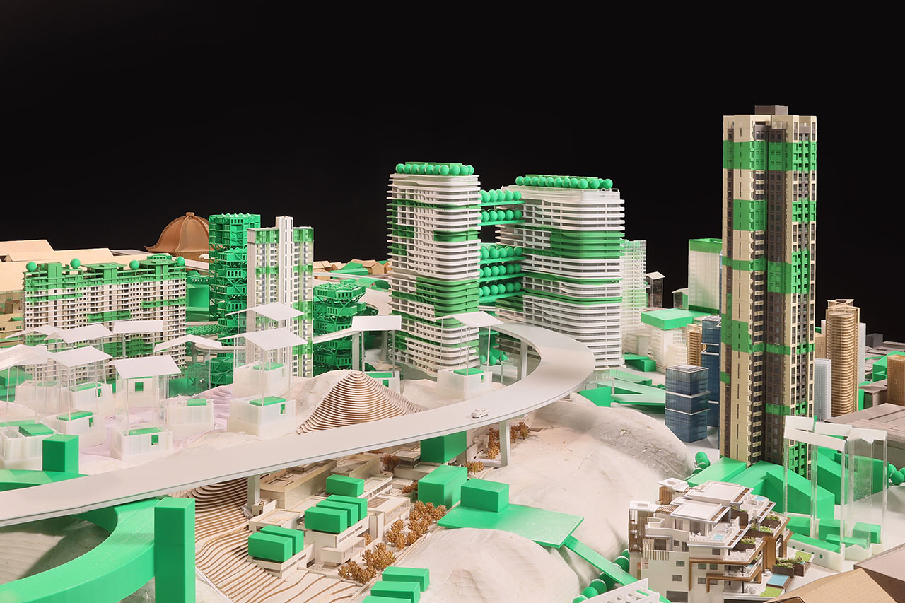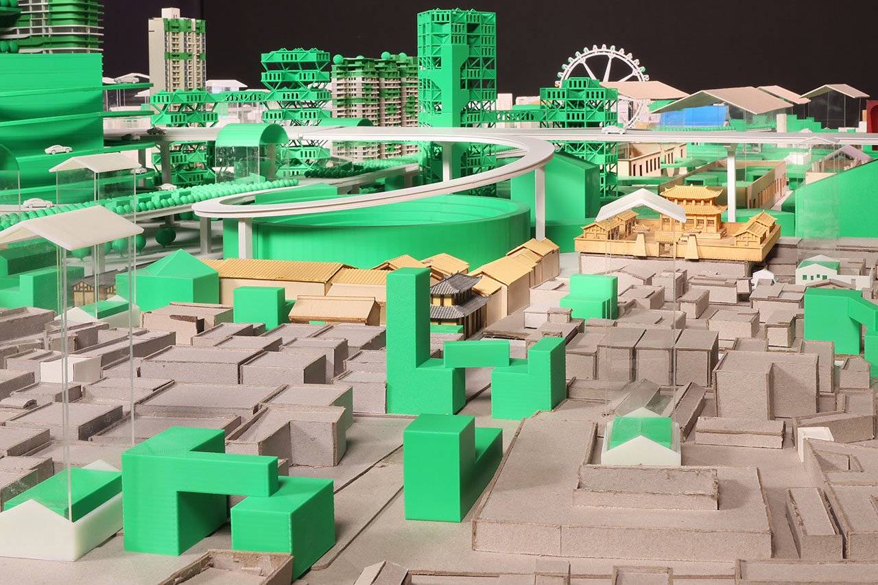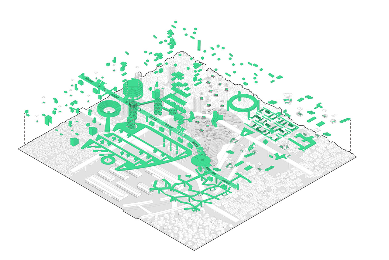 在这片城市图景中,绿色3D打印物件标注展示了"插件"策略的实际应用:在既有建筑内嵌入新结构,在现有空间上下加建新体量,通过连接构件创造新的活动路径与使用方式。