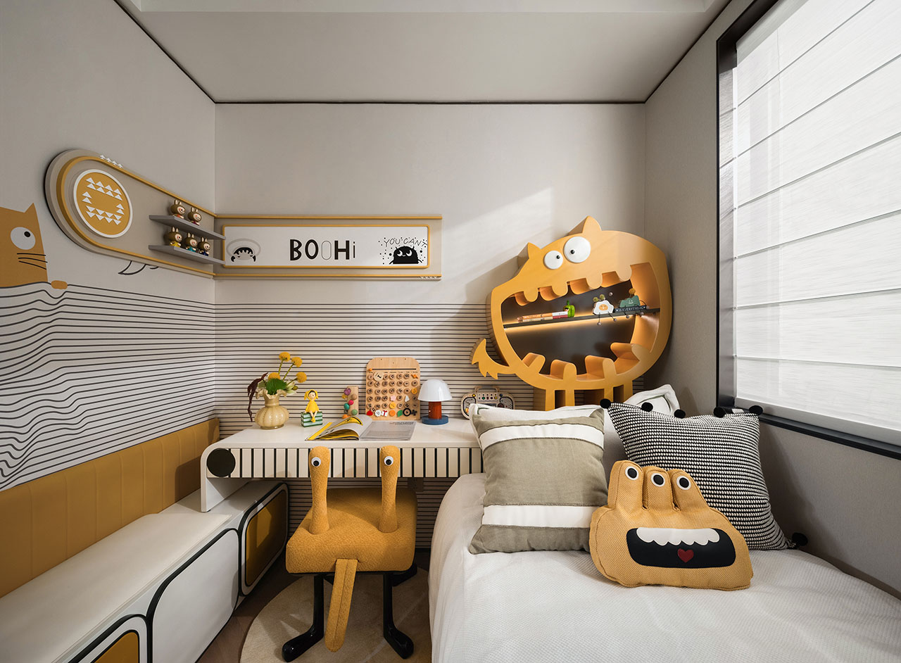 儿童房的设计兼顾舒适与实用,配置柔软边榻,既提升使用舒适度,也为陪读预留专属空间;床体采用靠边布局,搭配背景墙与床背一体化设计,在满足多功能需求的同时,进一步拓宽视觉通透感。