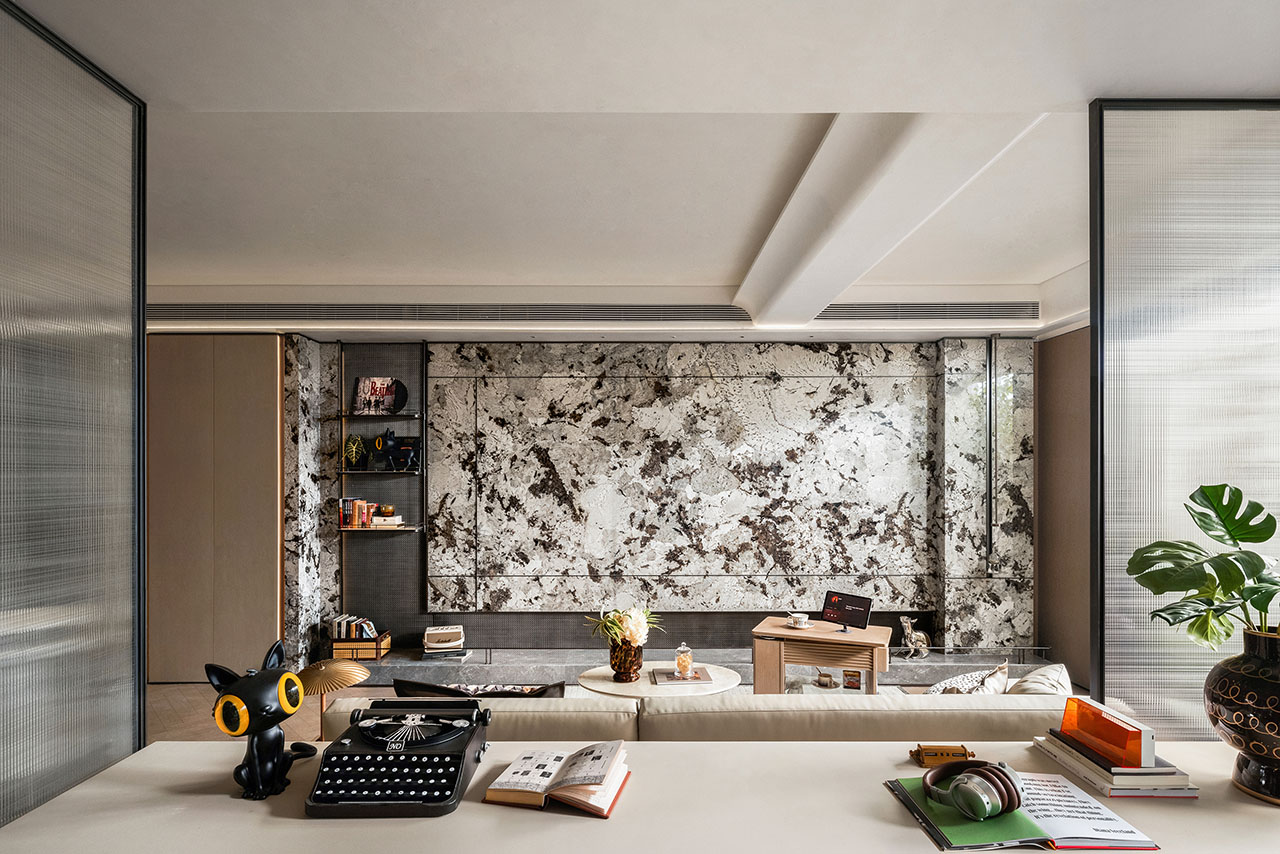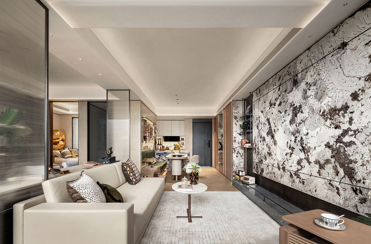 作为三代同堂的理想居所,空间以海派风格为基底,将东方秩序美学与现代生活质感自然相融。温润石材、金属线条与柔和曲面交织碰撞,构筑出沉稳细腻的空间格调,氤氲出克制而不失温度的氛围。
