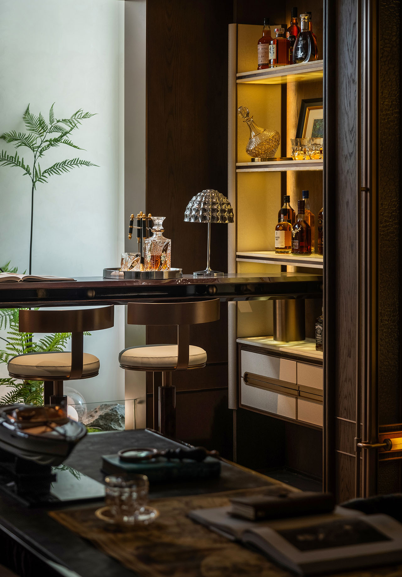 中西厨、岛台与餐桌整体洄游设计,构建出流畅连贯的备餐与用餐动线。石材岛台与金属杆件的细节相映成趣,光线在材质表面轻柔游走,氤氲出雅奢而温润的氛围。烹饪、聚餐与日常闲谈在同一空间自然发生,家的温暖情绪,悄然融入光影、尺度与生活的自然节奏里。同时与客厅形成LDK一体化格局。
