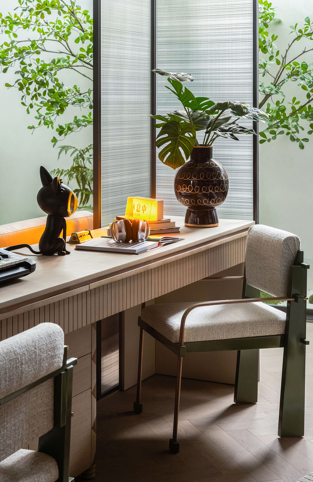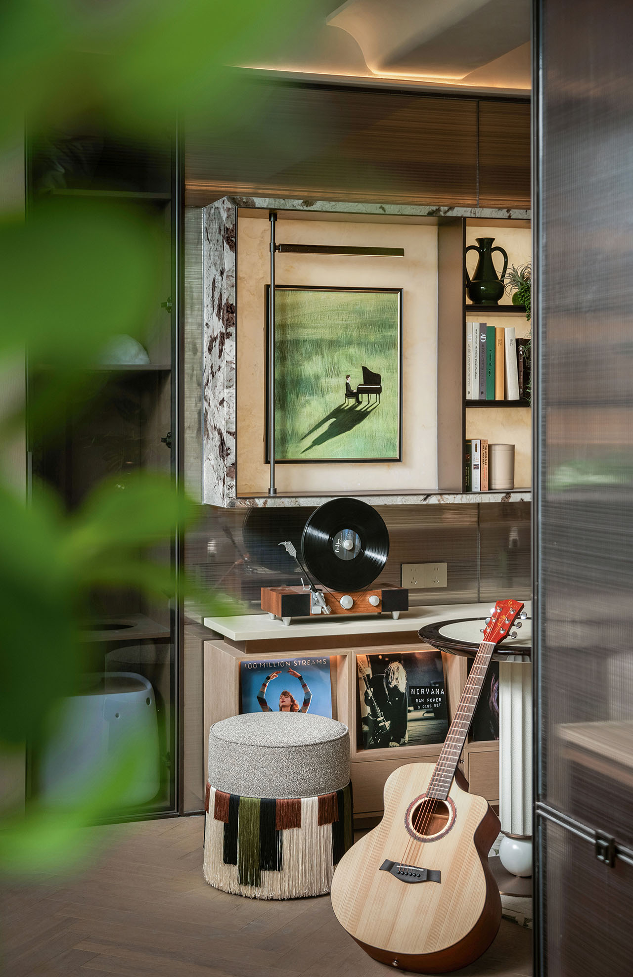 白天,阳光透过落地窗洒入客厅,空间明亮而轻盈;夜晚,灯光与音乐交织,书房成为业主沉浸阅读、写作或聆听黑胶的私密角落。艺术玻璃屏风界定出独立的阅读空间,却不隔断家庭成员之间的交流,让生活在共享与独处之间找到平衡。