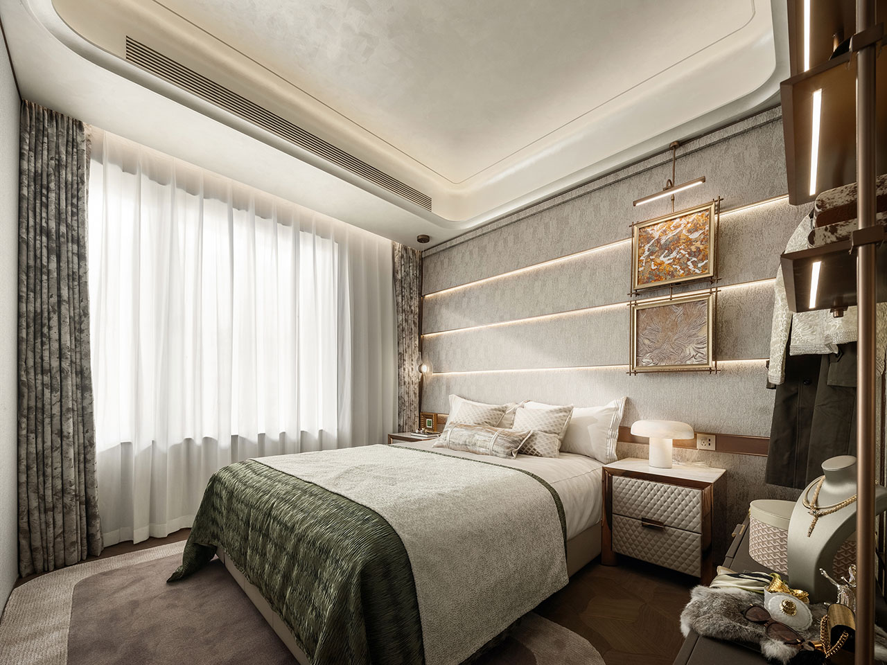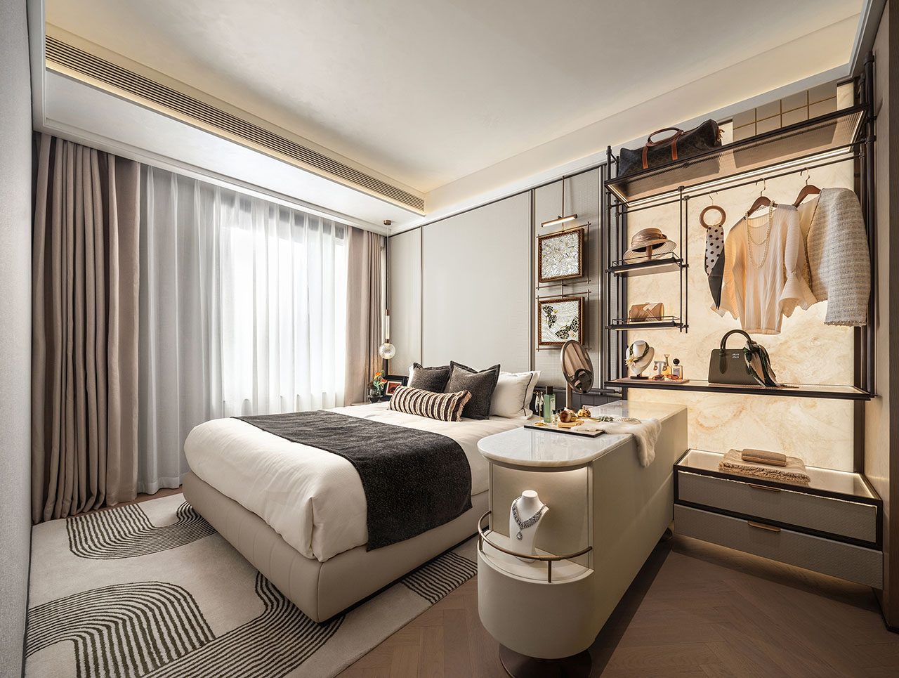 长辈房壁布硬包背景墙采用横向构成关系,与线性灯光设计结合,营造卧室仪式感。墙面造型与开关面板一体化设计,体现细腻的人性化考量。开放式展示架收纳衣物、箱包与日用品,右侧艺术玻璃屏风让空间通透灵动。