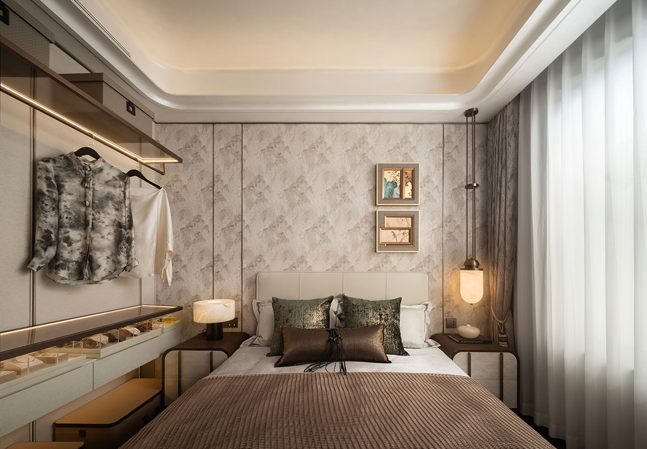 长辈房以简洁稳重的布局延续整体空间的秩序感。贝母漆与金属面板交织出柔光与质感的层次,两侧床头灯的温润光晕强化了卧室的仪式氛围。开放式展示架结合长短衣、箱包与日用品的多维收纳,兼顾功能与陈列的平衡,使长辈居所于安静与尊雅之间,呈现出恰到好处的生活尊重与温度。