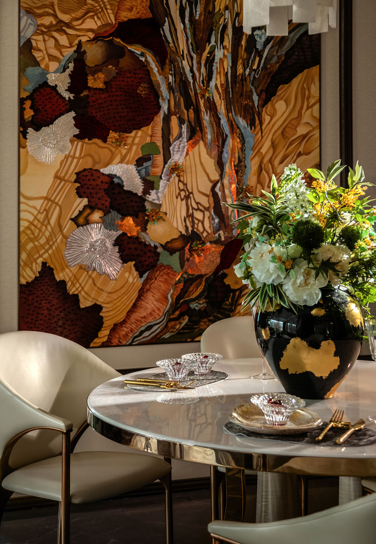 圆形餐桌营造端庄的用餐氛围,艺术挂画与餐边柜形成视觉对位。光线与交流自然交织,烹饪与生活被转化为日常的仪式。