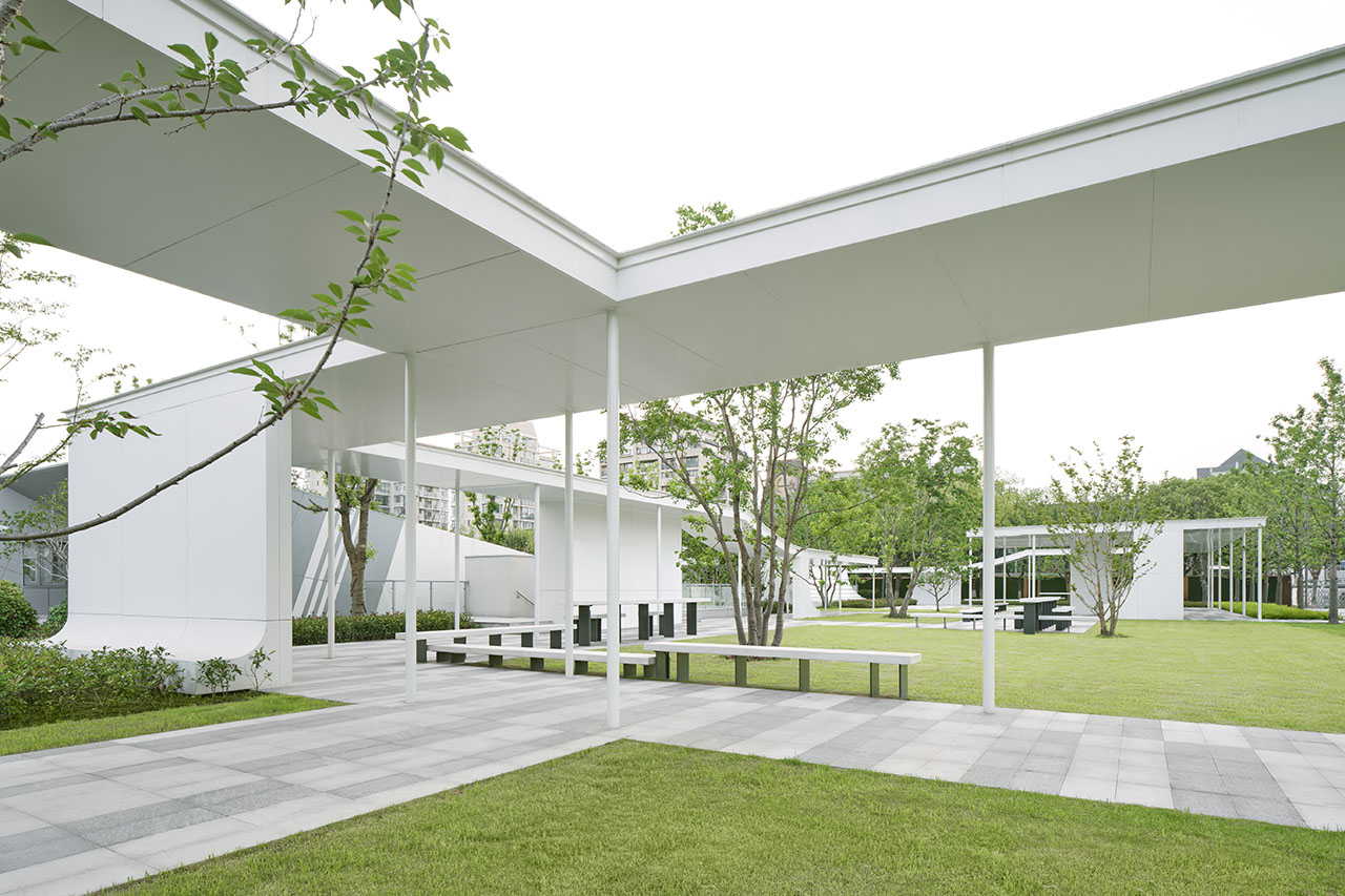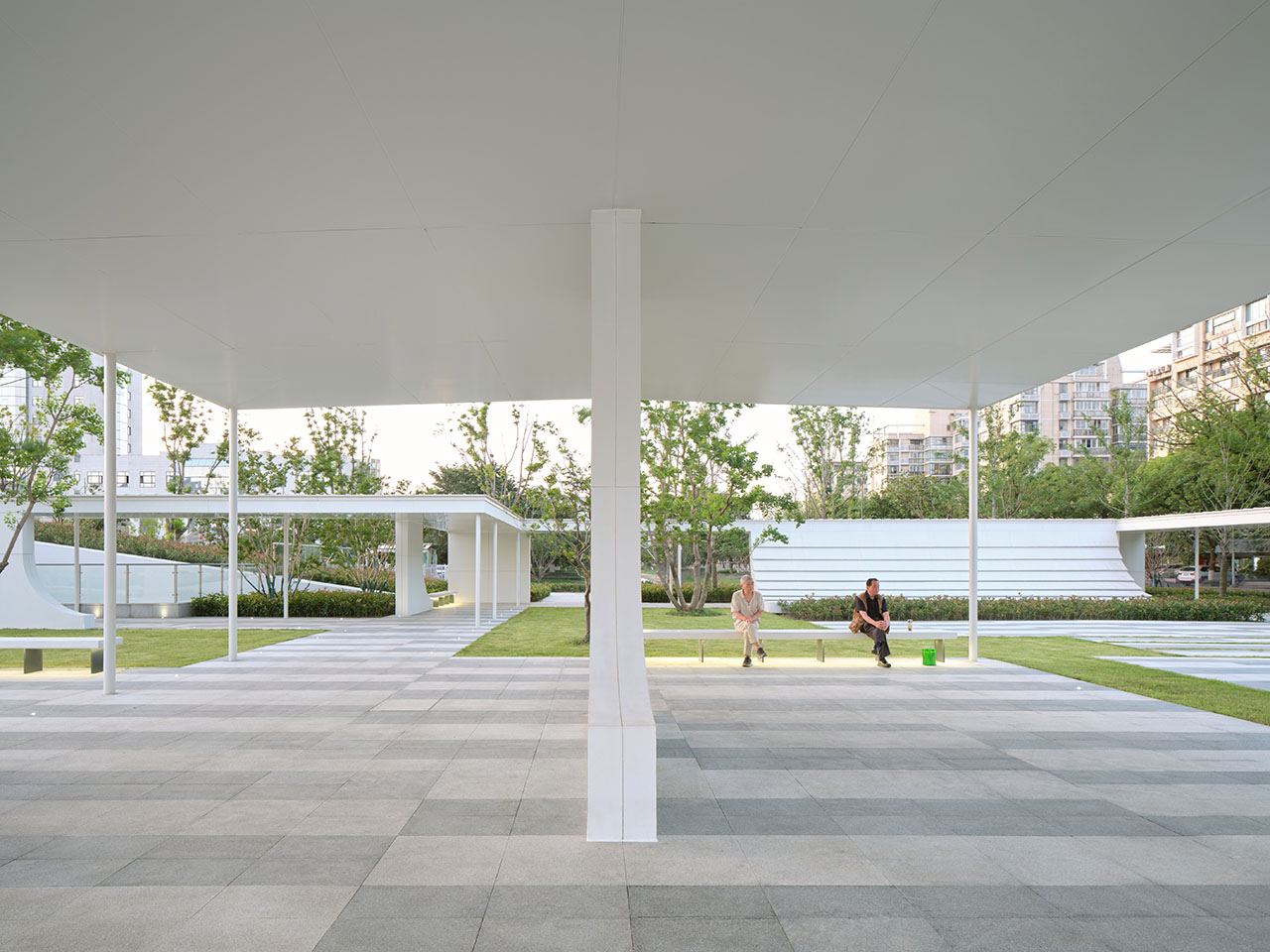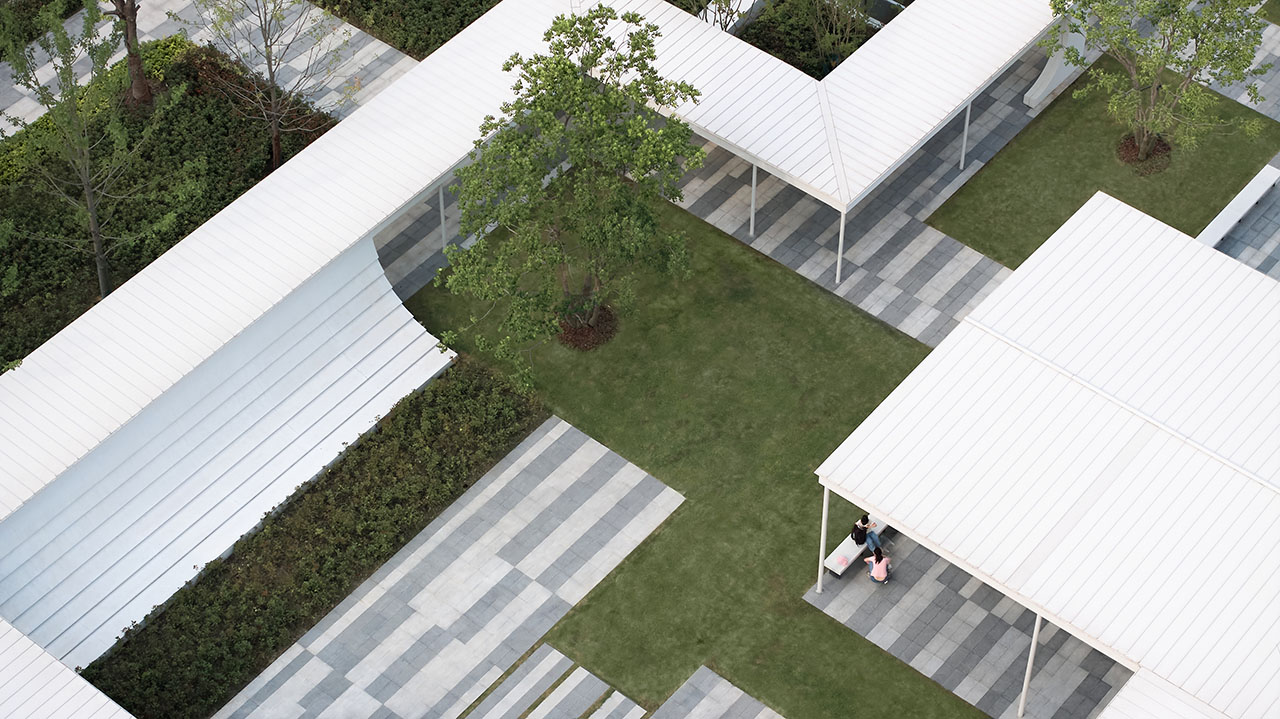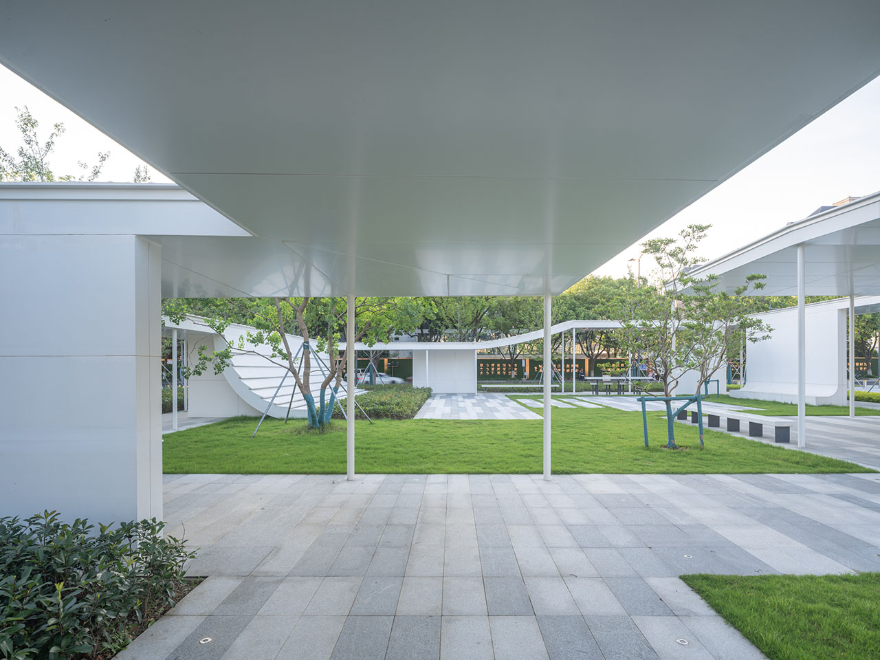 廊道的走势曲折,围合出多个亲切的院落场所,游乐、休憩、聚会、穿行等行为沿着院落与廊道展开。另一方面,设计充分考虑了地下空间出地面的风井、楼梯、电梯等基础设施,巧妙地将他们遮蔽,有效地规避了这些设施对活动的影响。