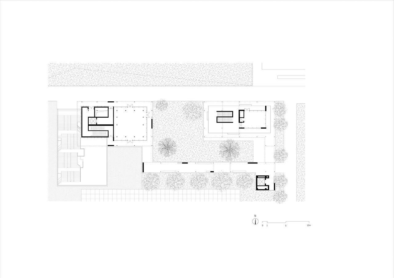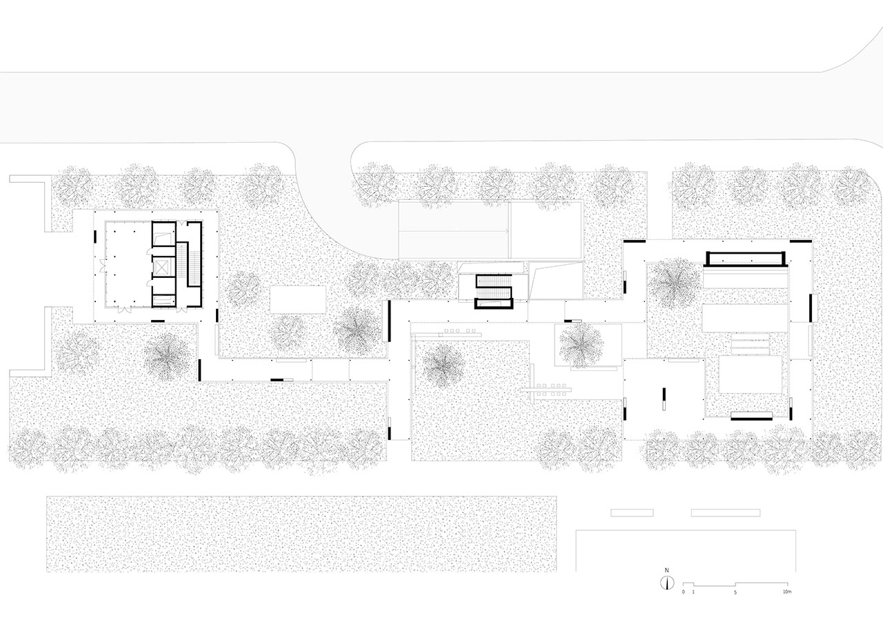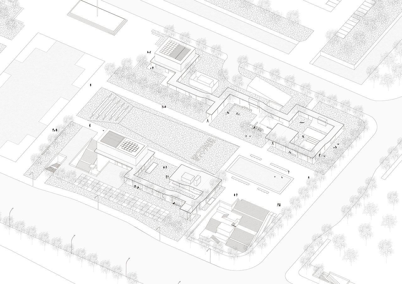 廊道的走势曲折,围合出多个亲切的院落场所,游乐、休憩、聚会、穿行等行为沿着院落与廊道展开。另一方面,设计充分考虑了地下空间出地面的风井、楼梯、电梯等基础设施,巧妙地将他们遮蔽,有效地规避了这些设施对活动的影响。