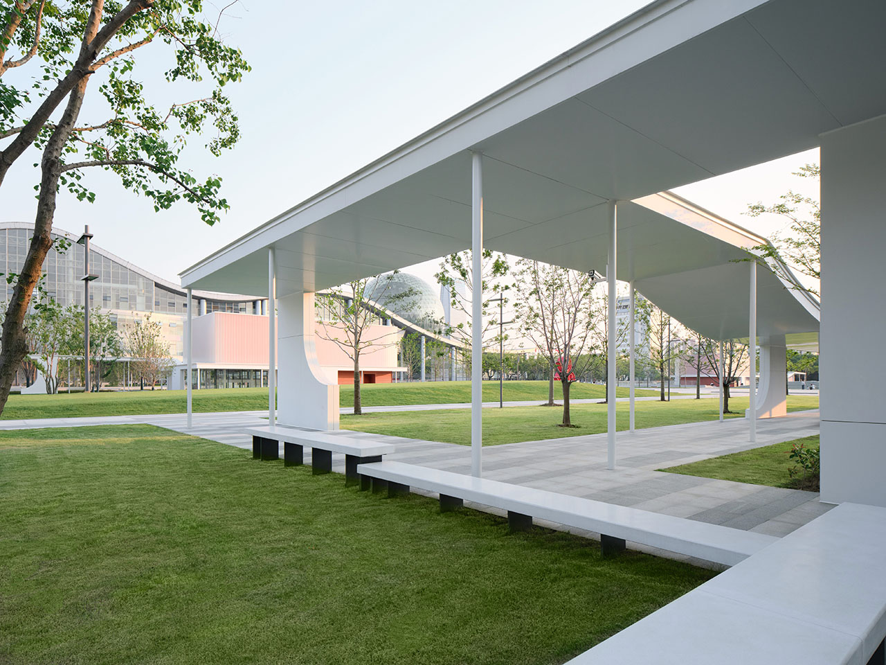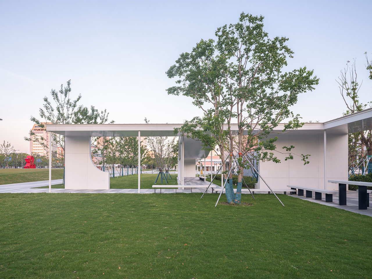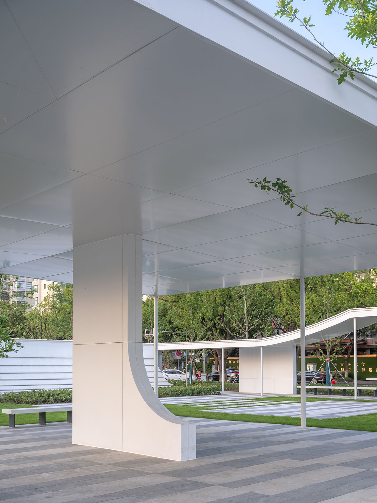 结构设计上采用摇摆柱体系,纤细的柱网只承担垂直力,剪力墙用于抗震,营造出屋面如丝带般漂浮的景象。廊架由此轻盈灵动,视线通达,希望在树木更丰茂的未来,廊架穿行绿叶之中,忽隐忽现。