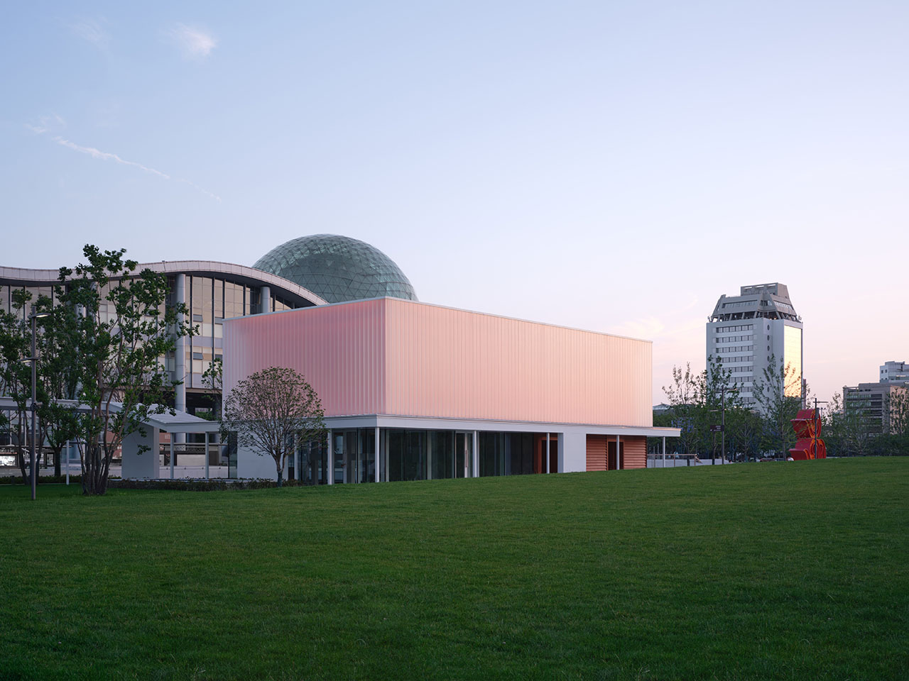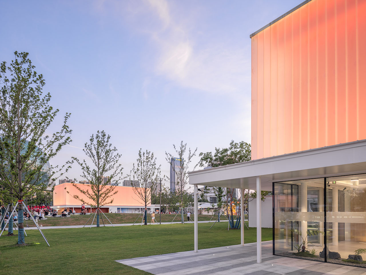 很多广场的失效,原因是功能的缺失。中轴两侧地下管线设施集中,我们利用电梯厅做成四个玻璃盒子,承载商业功能。盒子采用双层表皮,白里透红,晚上透亮发光,成为广场中的标志性构筑。大屋顶是没有功能的空间,廊子在末端放大,容纳下各式活动,为聚会、唱歌、跳舞、游戏、等功能提供庇护。