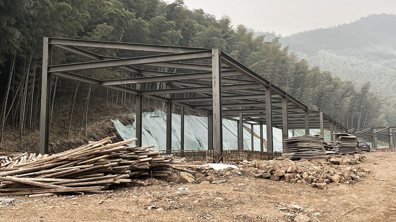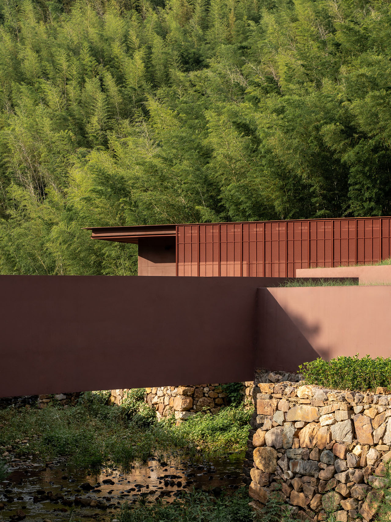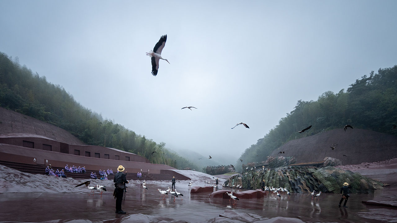 另一条谷地与剧场所在的山谷垂直,向竹林深处延伸,随即融入山体,鸟舍沿着宁静的谷地展开,与外部世界温和地隔离。多变的地形拓展了舞台——群集的白鹳将从狭长的山谷中现身,伴随声光效果,象征戏剧的高潮阶段。