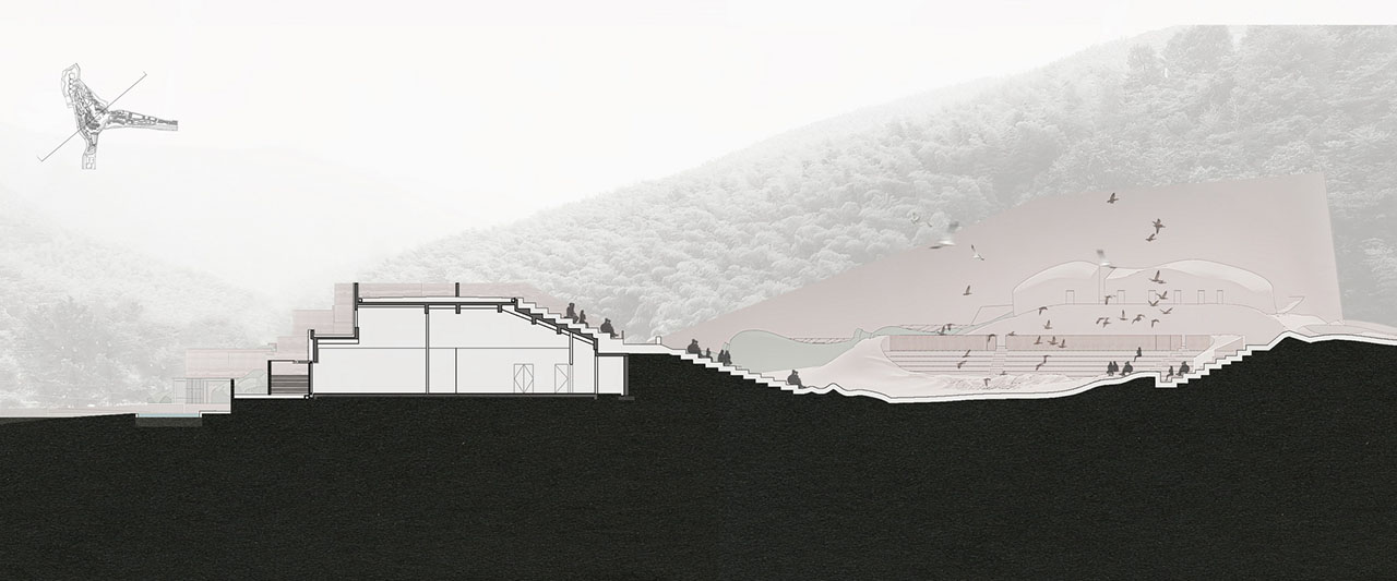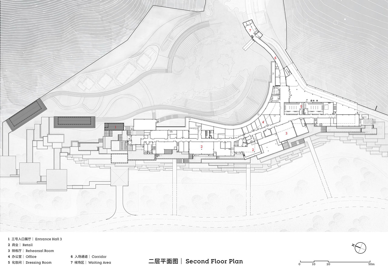 2000余个座位的剧场在叠台背面展开。团队希望尽可能多地利用平整土地,使建筑边缘贴合地形。山谷成为了限定建筑形态的容器,体量保持流动,直至达成理想的几何状态,再被赋予功能。建筑沉入环绕的丘陵中,后者既是鸟类生活经验的一部分,又在演出开场后成为了天然的沉浸式布景。