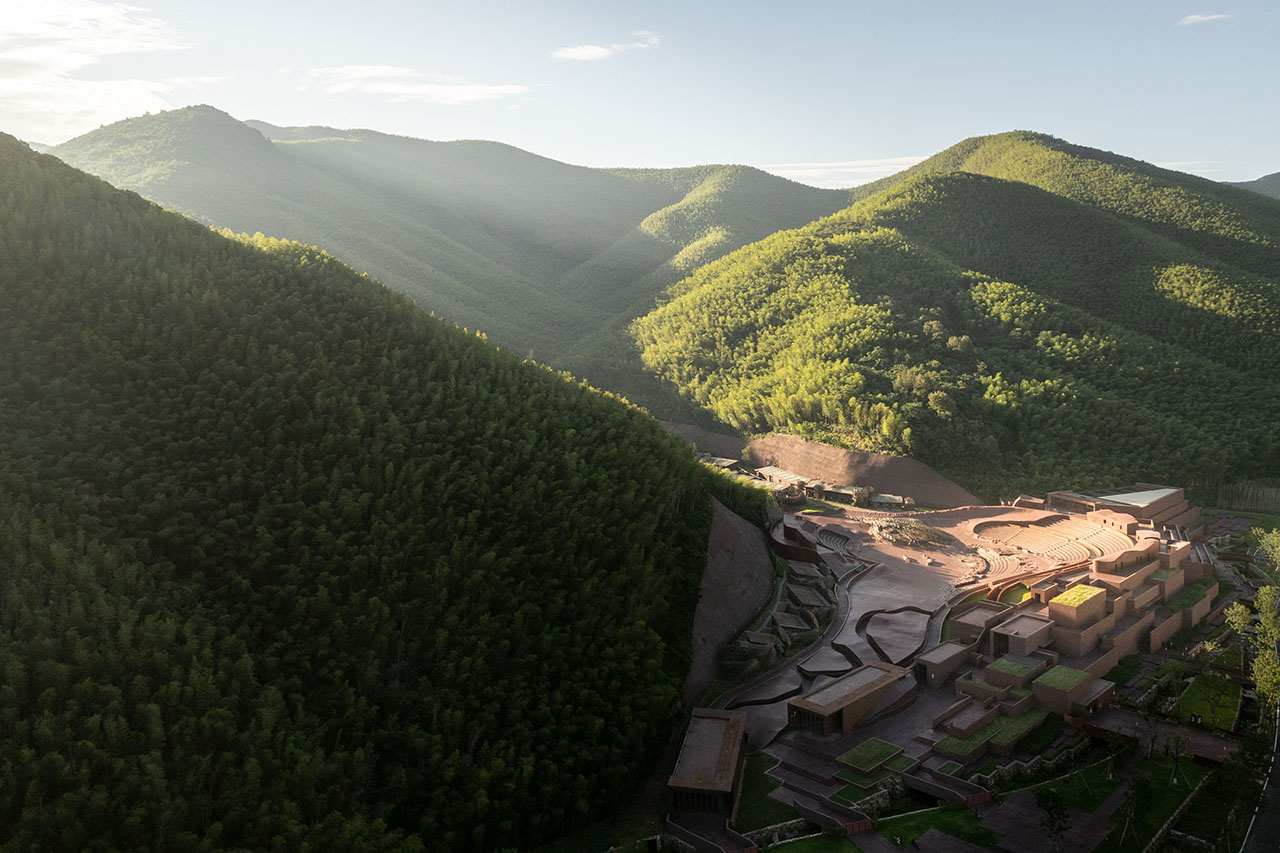 飞鸟剧场的设计开始于2021年,在宜兴完成了一系列住宅与公共建筑项目后,goa再次接到来自业主窑湖小镇的委托,为樊跃导演团队创作的一场“生态叙事作品”设计露天剧场。场地位于小镇南侧一条溪谷未开发的末端,谷地拥有柔和的轮廓与多向延伸的形态。建筑师希望减少高耸于地面之上的体量,让剧场沉入山谷中,成为地景的一部分。