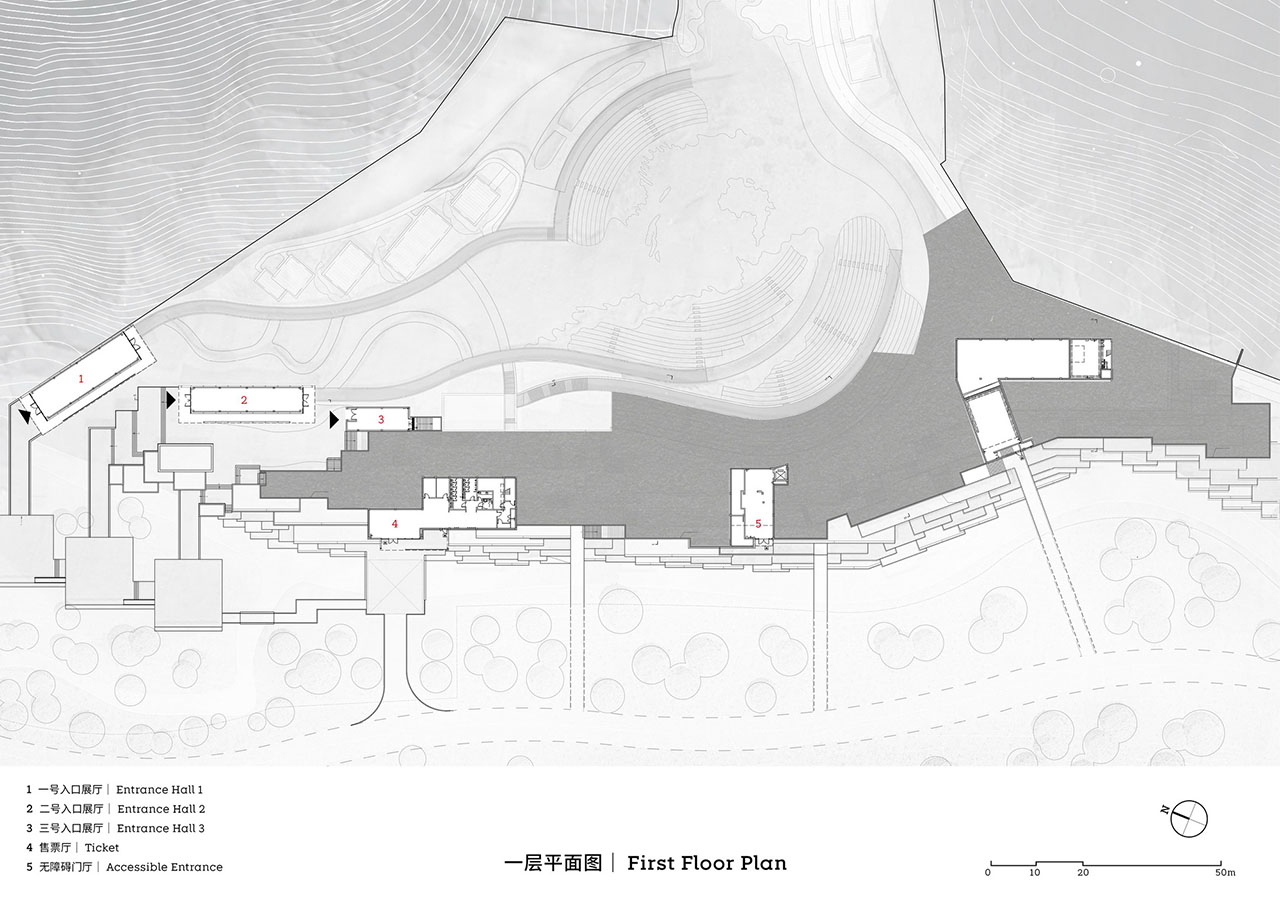 场地的东西两端分别被组织为容纳入口厅与售票处等公共功能的叠台区,以及鸟类栖居的鸟舍区,中央则是室外剧场。叠台临近道路,层叠的矩形体量分隔了外界与剧场内部,两者彼此间几乎不可见——观众穿过三个入口厅中的一个进入演出场地,与日常生活相疏离,标示出现实与飞鸟“梦境”的边界。
