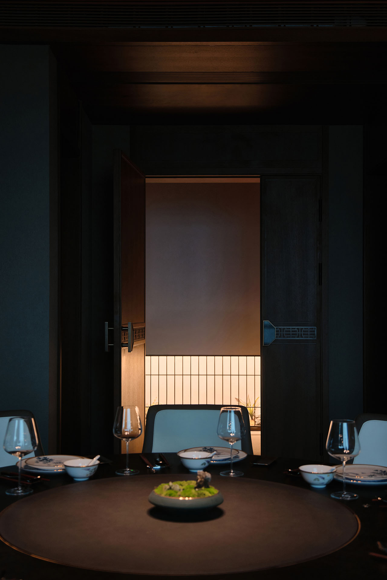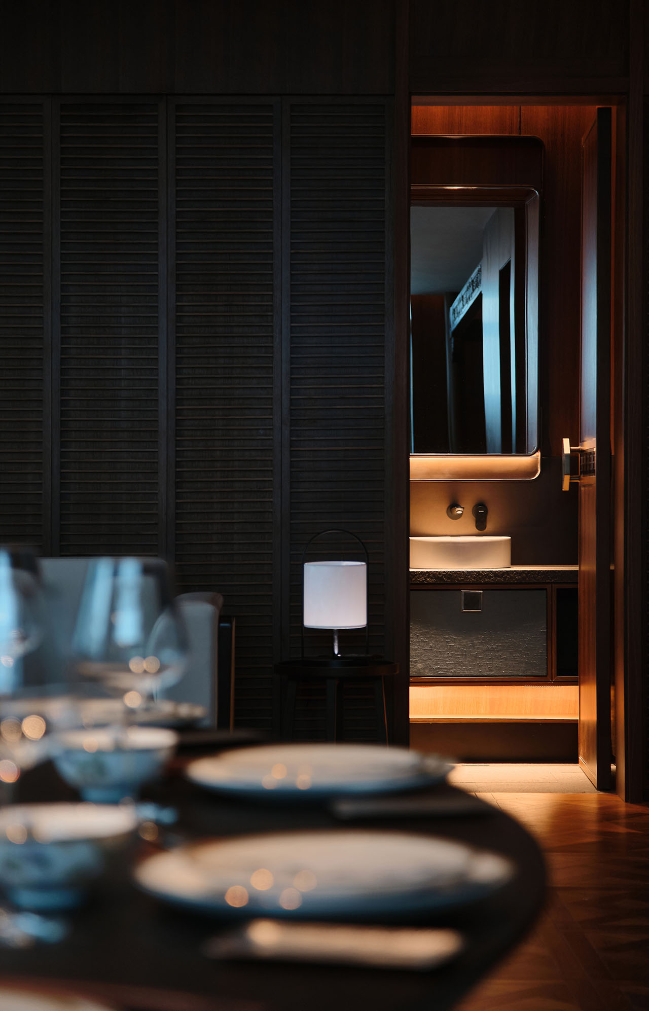 木质格栅造型的设计,让人仿佛置身于古老的南京园林中。石材点缀其中,构成静谧的自然景观。包间二整体空间以温润的木色为主,配以柔和的照明,营造出大隐于市的雅致氛围。